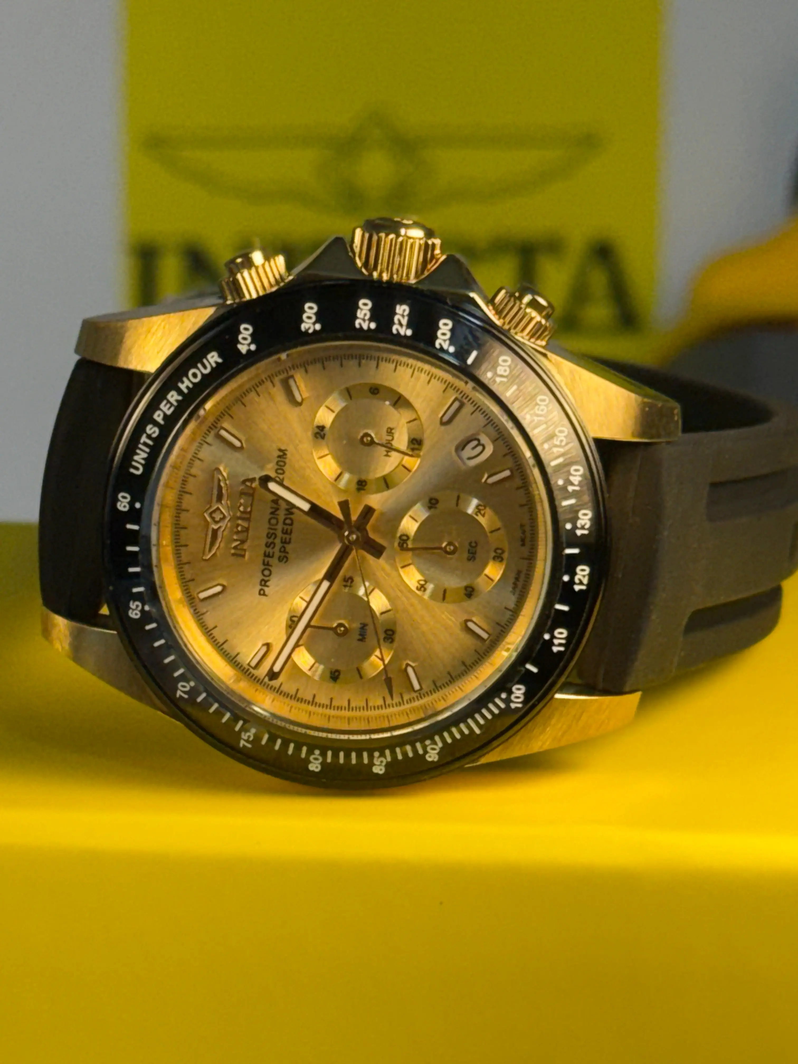 The Invicta Speedway 50761 is a definitive statement of luxury and precision, drawing inspiration from the high-octane world of professional racing. This model features a brilliant boutique gold sunray dial housed within a 40mm surgical-grade gold-tone stainless steel case. Engineered for the sophisticated driver, the integrated chronograph functionality offers split-second timing accuracy while maintaining a refined aesthetic that transitions perfectly from the track to the boardroom.