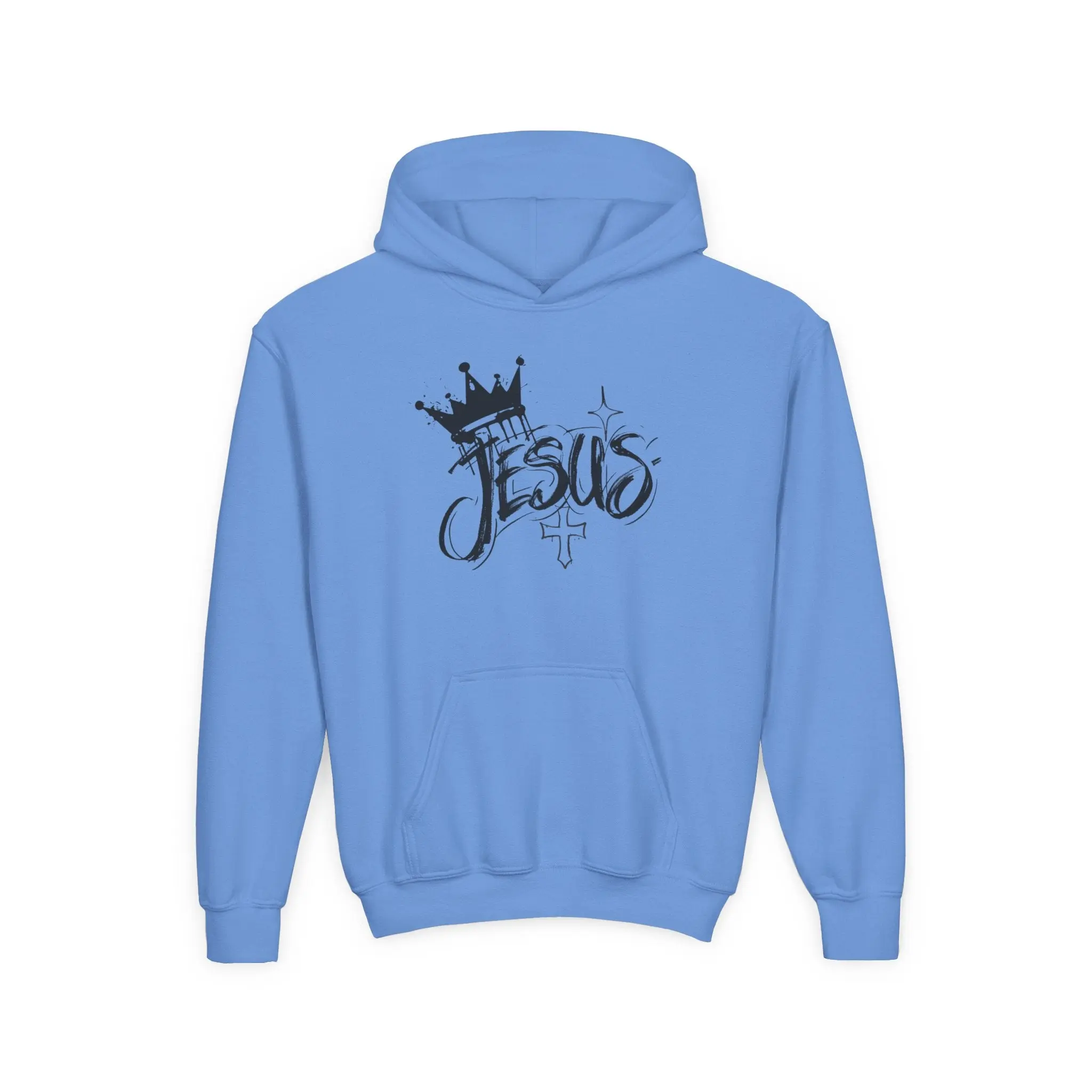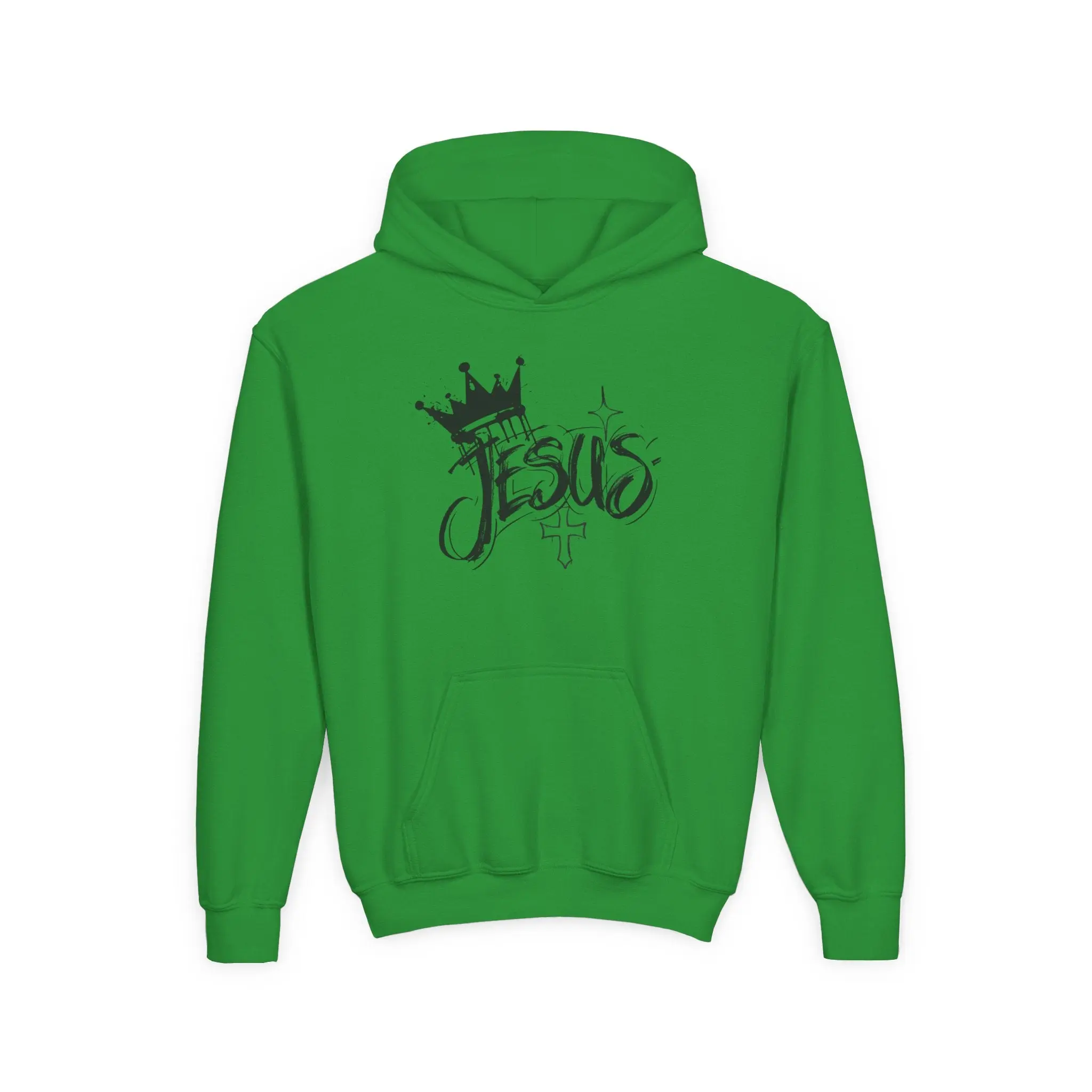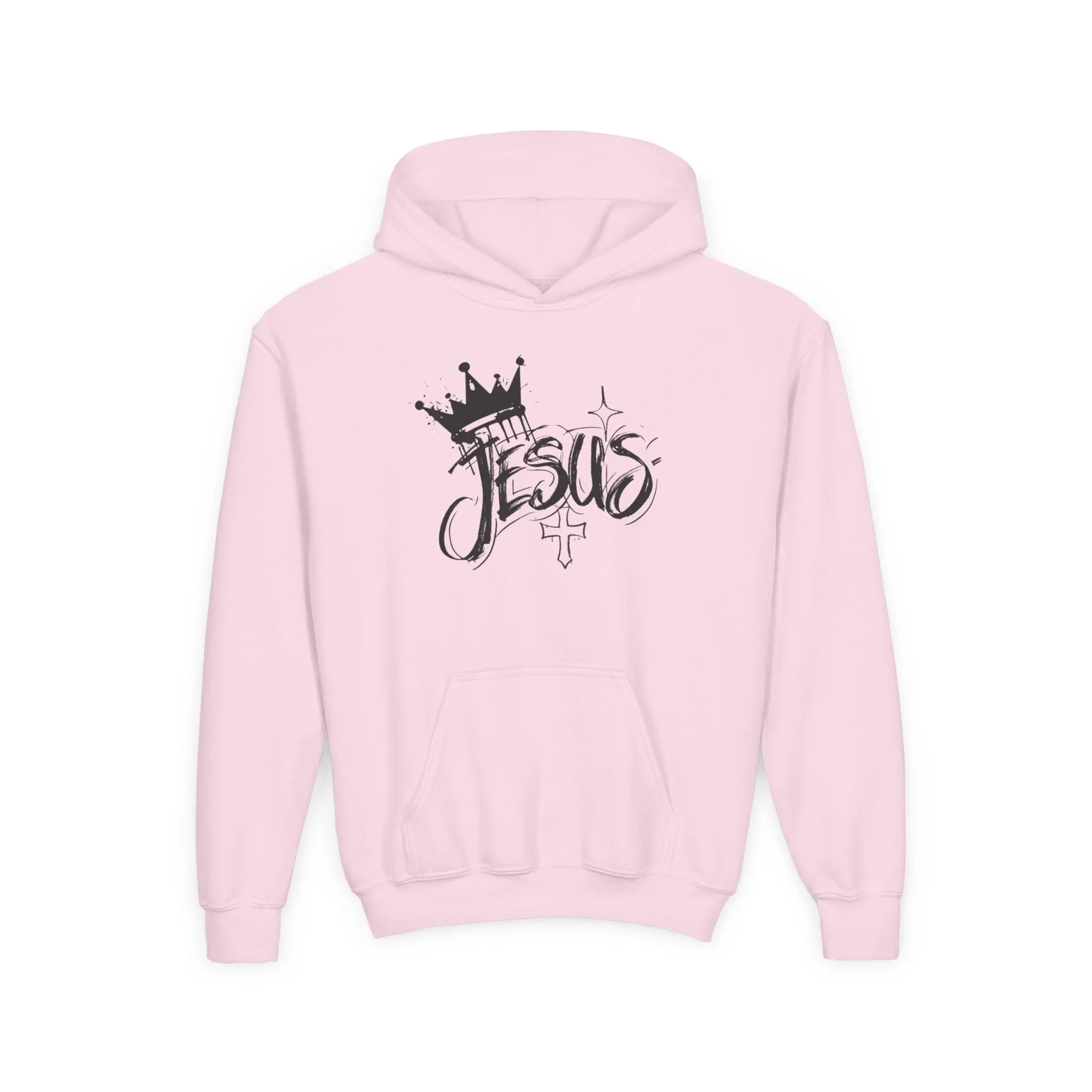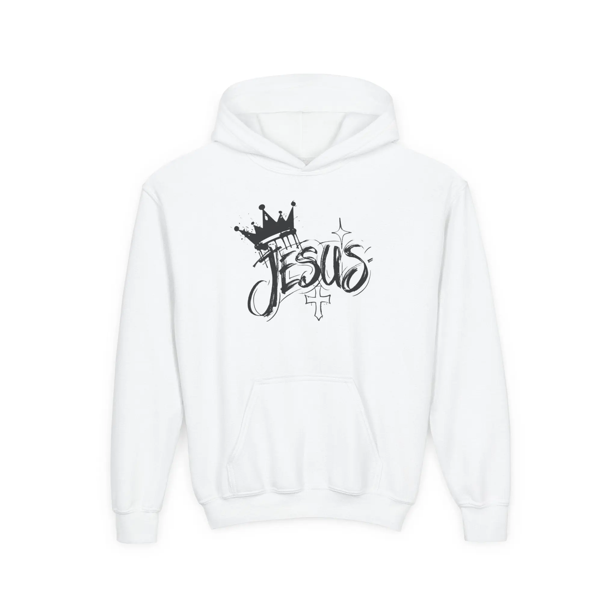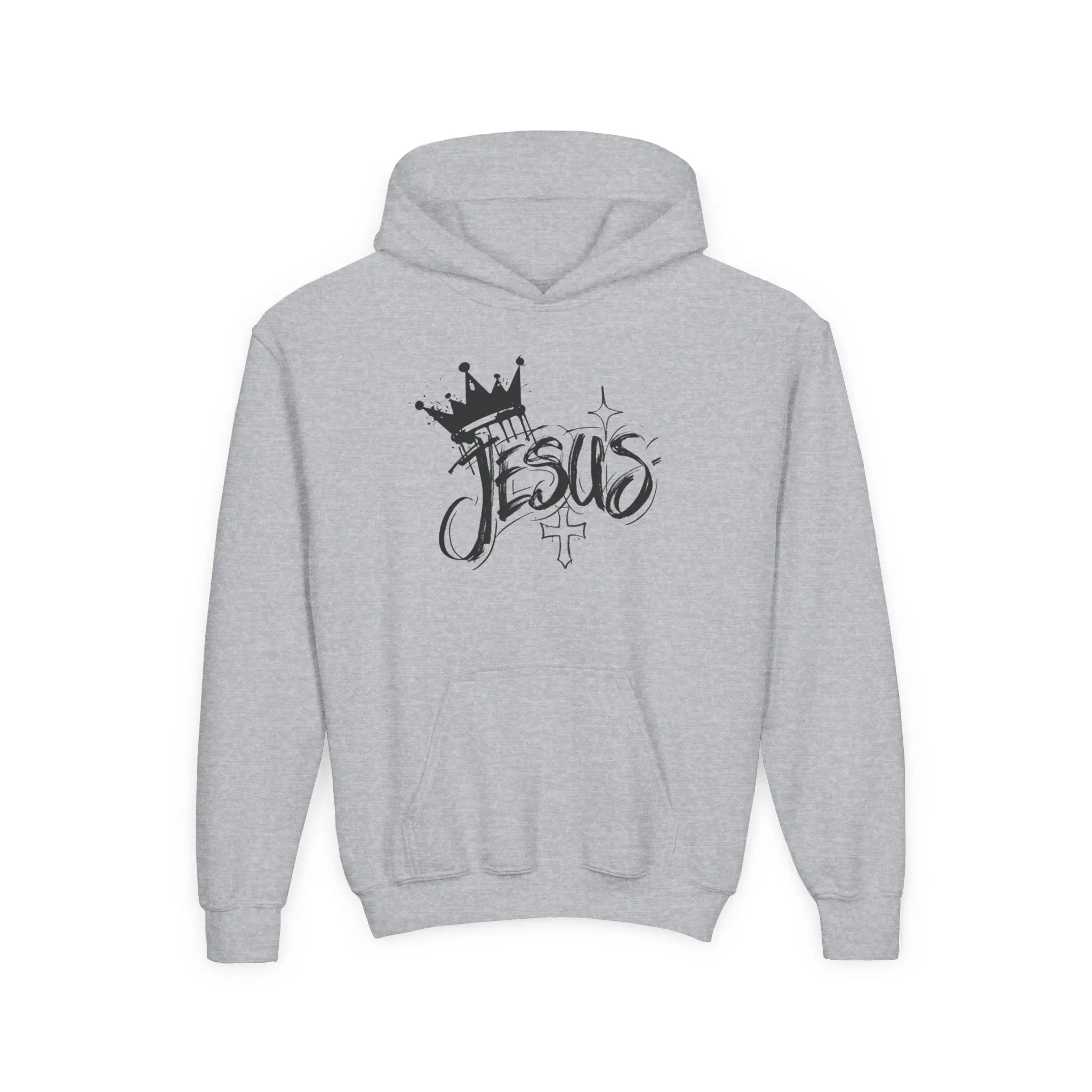 This youth hoodie carries a quiet, confident faith-forward design that feels like an everyday reminder. Soft midweight fabric drapes comfortably over active days and quiet moments alike. The hand-friendly kangaroo pouch pockets and roomy hood make it easy to layer after soccer practice, at youth group, or during a chilly morning commute to school. The scripted “Jesus” artwork with crown and small cross reads like streetwise handwriting — expressive but not loud — so kids can wear their belief with subtle style. Durable construction, stabilized neck seam, and quality print/embroidery options mean this sweatshirt will stay comfortable and look fresh through repeated wear and washes.