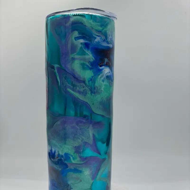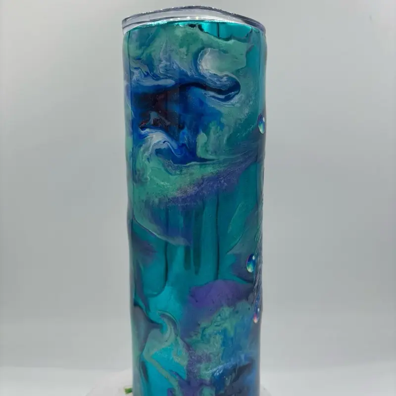 20oz stainless steel blue mirror tumbler with ocean blue inks along with a jellyfish decal.