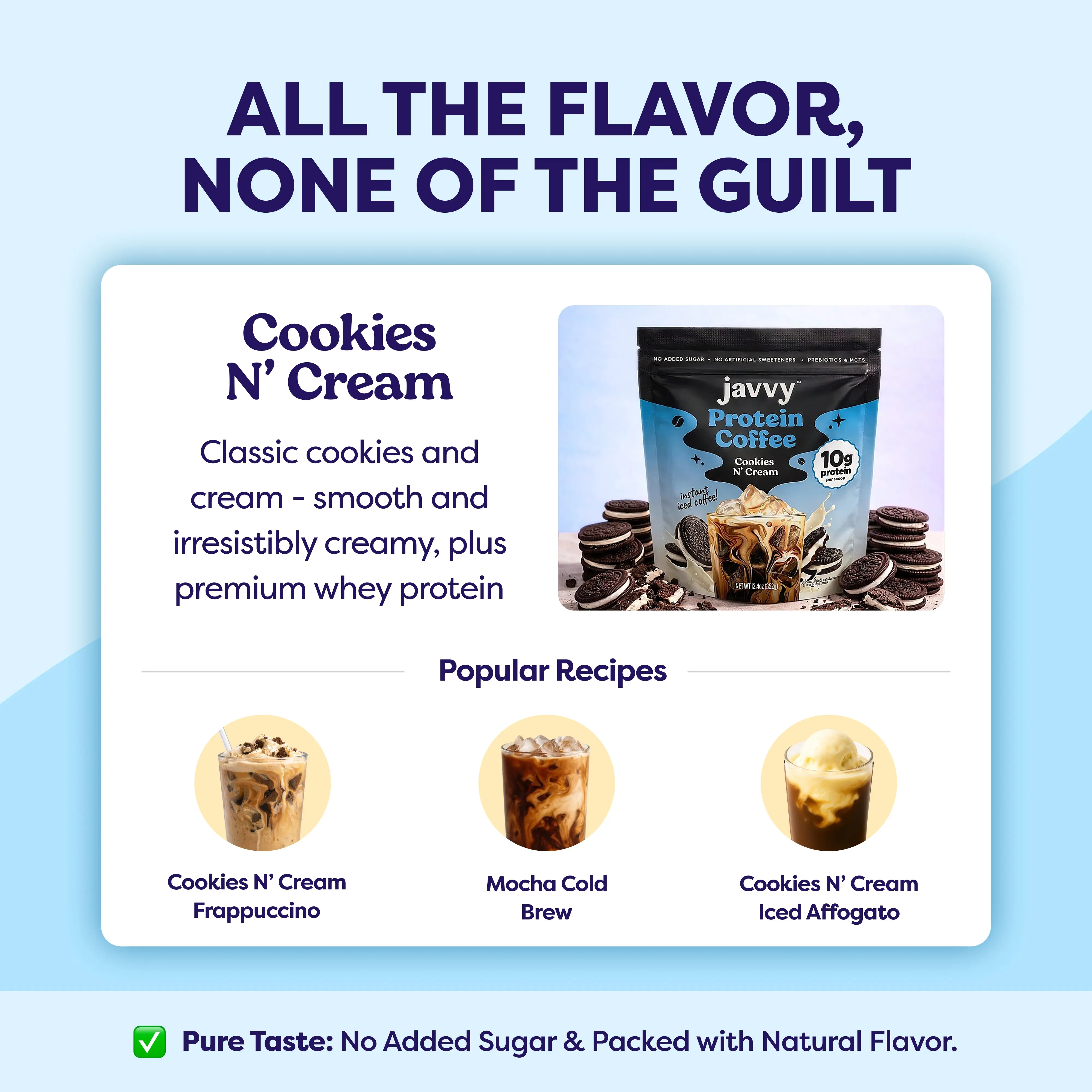 · All Natural Ingredients - Our favorite drive-thru coffees were filled with loads of sugar, artificial sweeteners, and added junk. We wanted to make it super easy and convenient for you to make those same coffees, guilt-free and with benefits like protein. This means that we kept it simple with an easy to read label, natural ingredients, and no sugar!