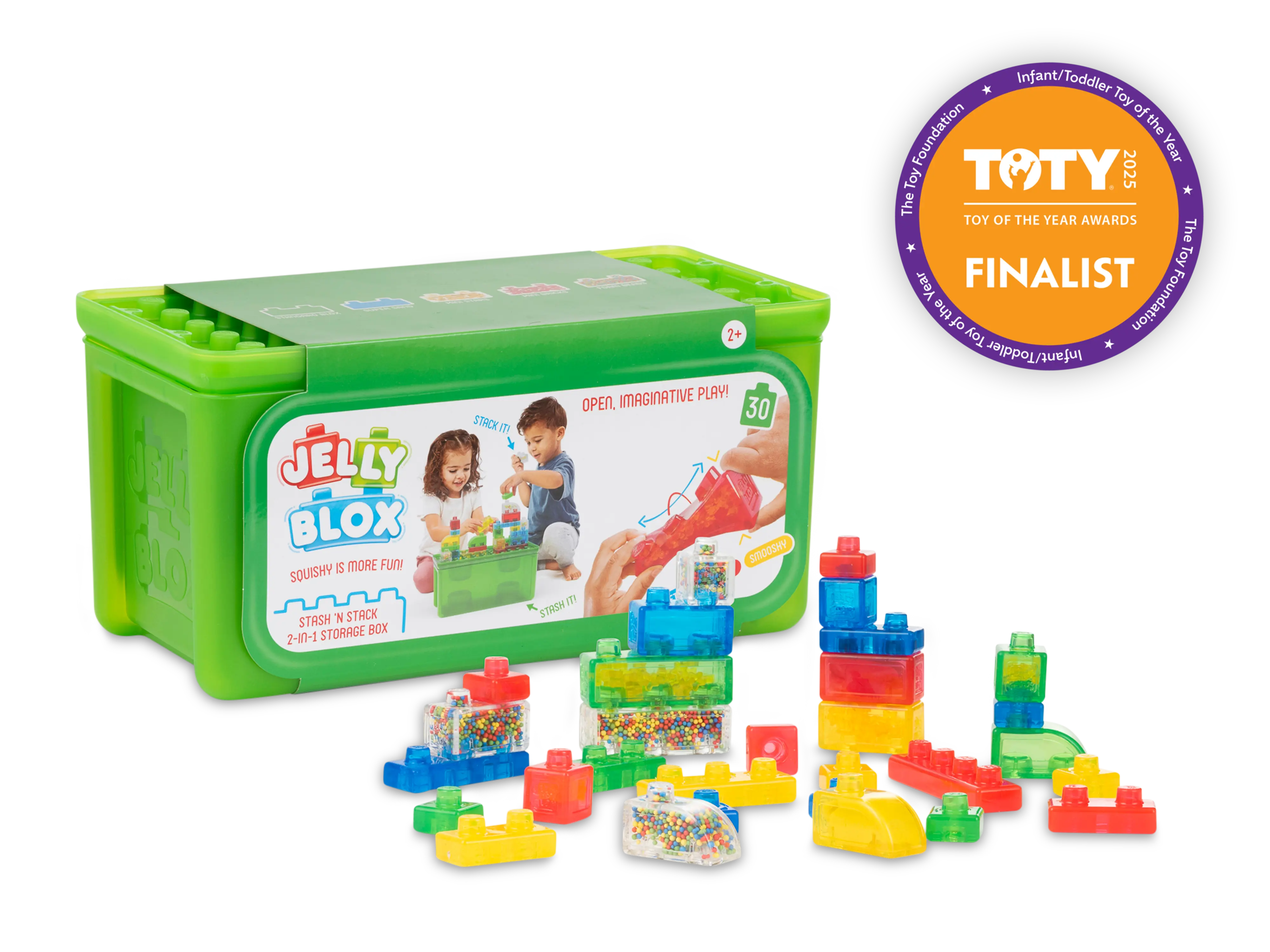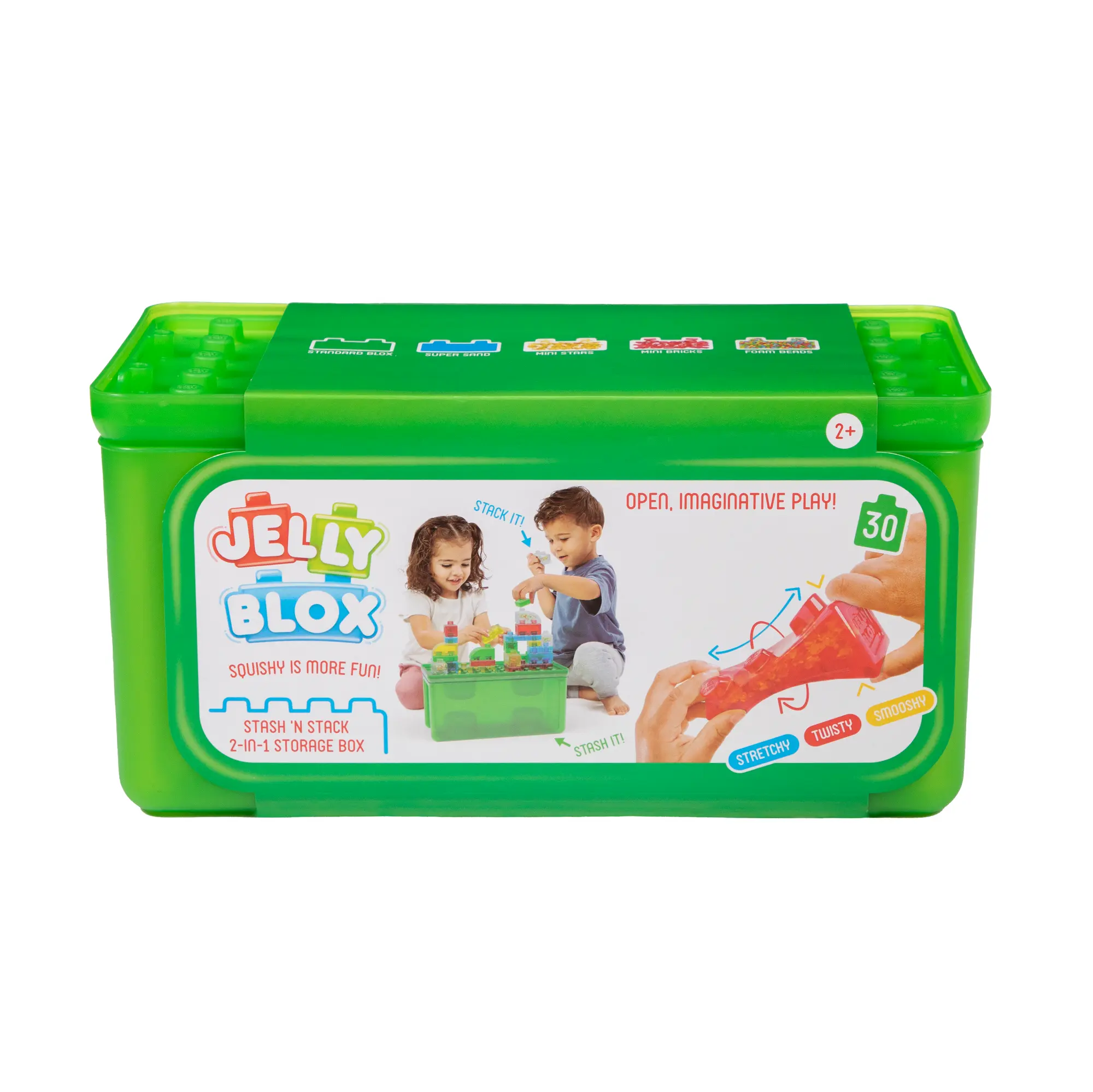 Introducing Jelly Blox - the only blocks that bend the rules! Jelly Blox is a patent-pending building system for toddlers and preschoolers that kids can squeeze, stretch, and squish! Designed to support key developmental milestones through the fun of tactile, sensory play, Jelly Blox delivers jiggly construction fun. Several special blocks are also filled with fun sensory fills like sand, foam balls, mini stars, and mini bricks to dial up the fun. Jelly Blox are MESH Accredited - MESH accredited products are evaluated based on their ability to help children develop skills like problem-solving, perseverance, adaptation, conflict resolution, self-regulation, self-advocacy, cognition, and communication. Adults love Jelly Blox too! Oh, and a bonus for parents - not only are Jelly Blox safety tested to ensure worry-free play, but they’re also totally ouch-free; no need to dread those accidental encounters with bare feet! With Jelly Blox, it’s all about bending the rules and stretching the imagination! The Jelly Blox Stash 'N Stack 2-in-1 Storage Case includes 30 colorful blocks and features a built-in building plate for hours of versatile construction fun! When playtime is done, simply place your Jelly Blox back into the container and close the lid. As an added feature, if you have multiple containers, just stash your blocks and stack’em! Recommended for ages 2 and up.