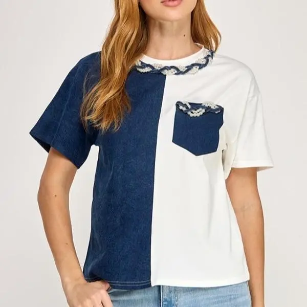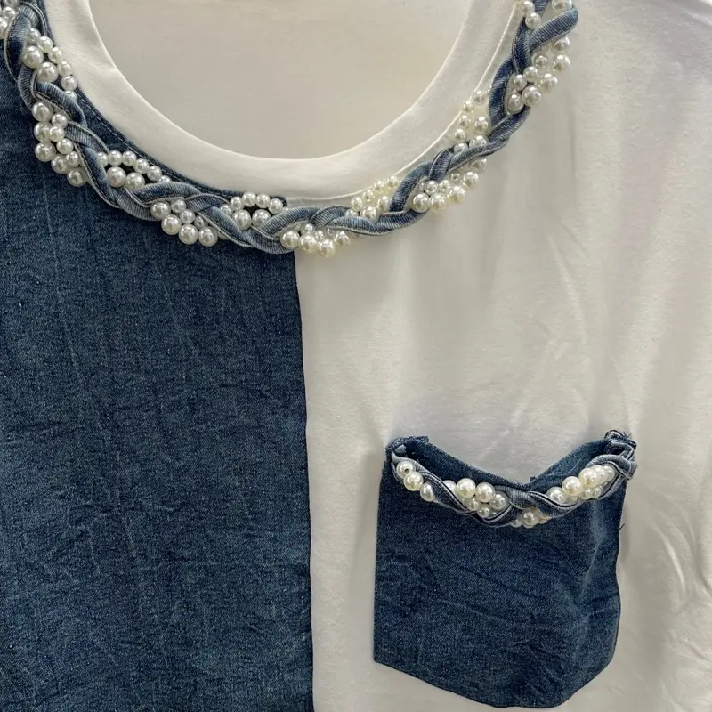 Denim Tshirt with Pearl Embellishments and Contrast Pocket Design for Women