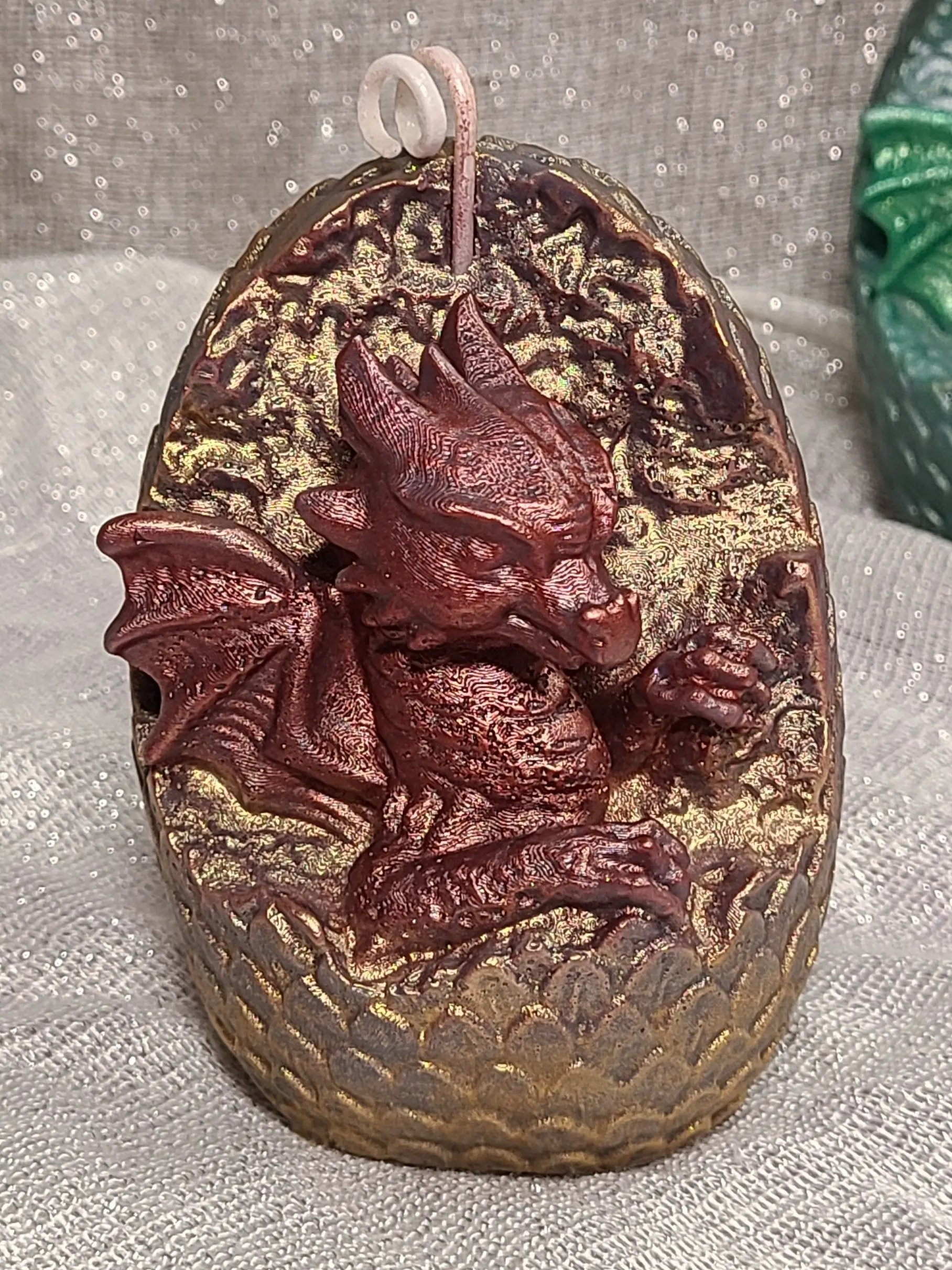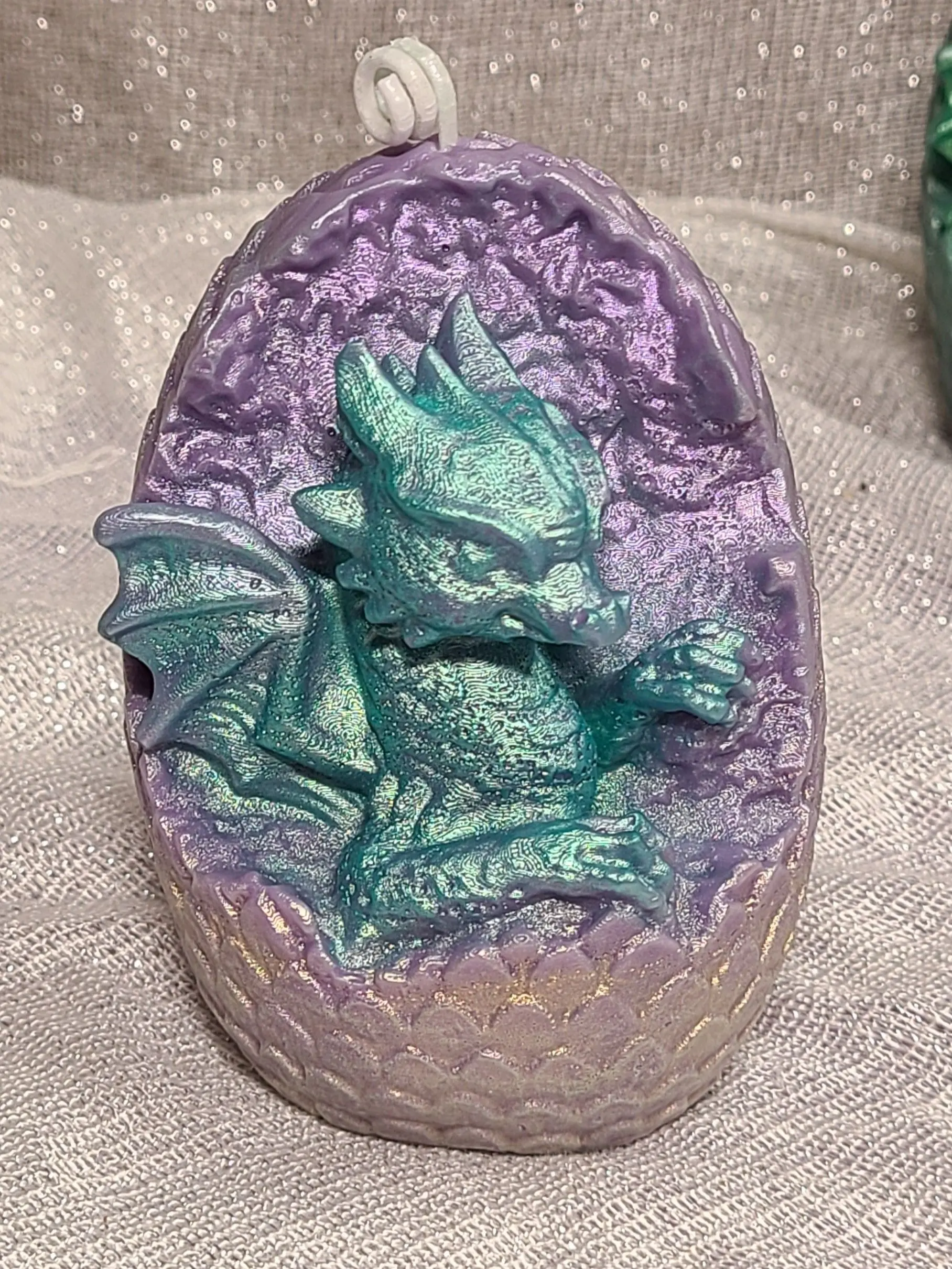 Shaped like a baby dragon hatching from its egg, this adorable drake candle is made of parasoy wax and hand-painted in shimmering micas.