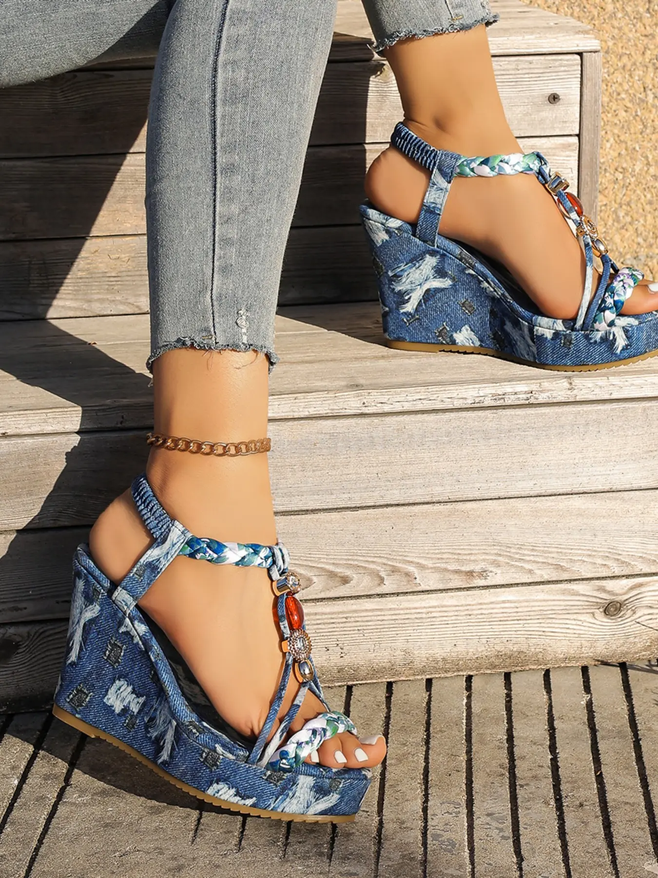 New Beaded Ethnic Style Braided Thick Sole Women's Open-Toe Waterproof Platform Wedge Shoes, Outdoor Party Versatile Footwear