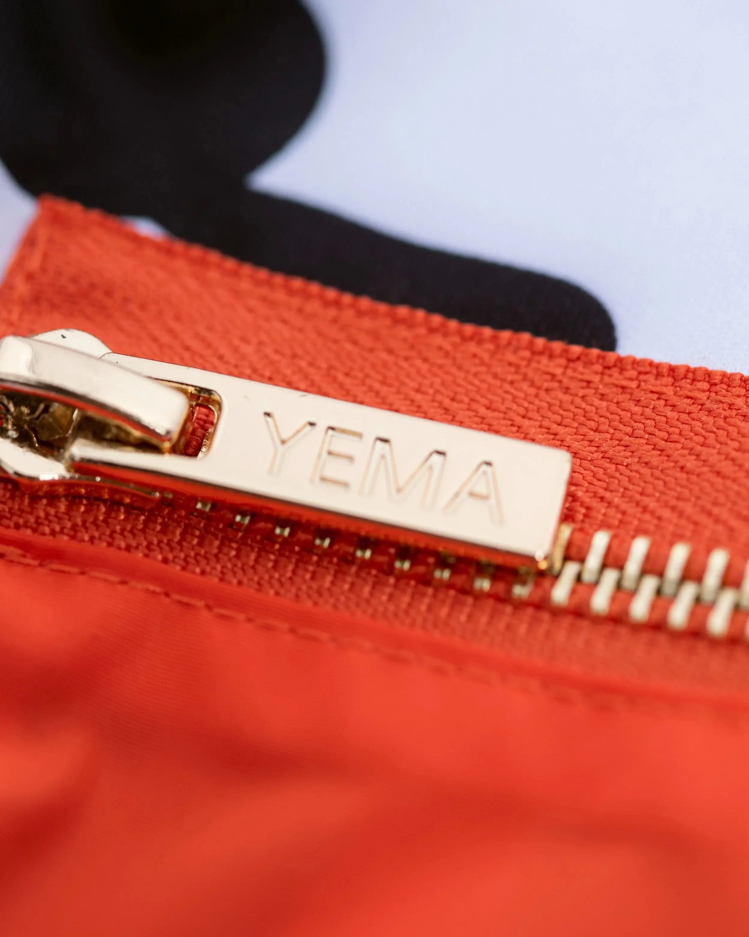 ·YEMA on YEMA smiling double embroidery on back—playful branding that celebrates joy