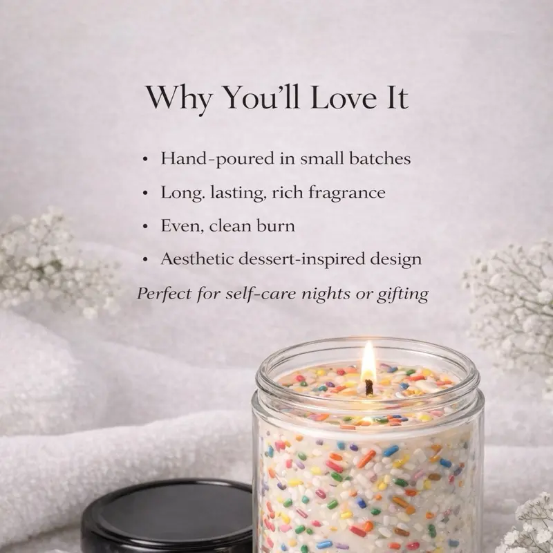Hand-poured into clear glass jars and layered with colorful sprinkle embeds throughout, this dessert-inspired candle brings a playful edge to your space while still feeling soft, elevated, and indulgent.