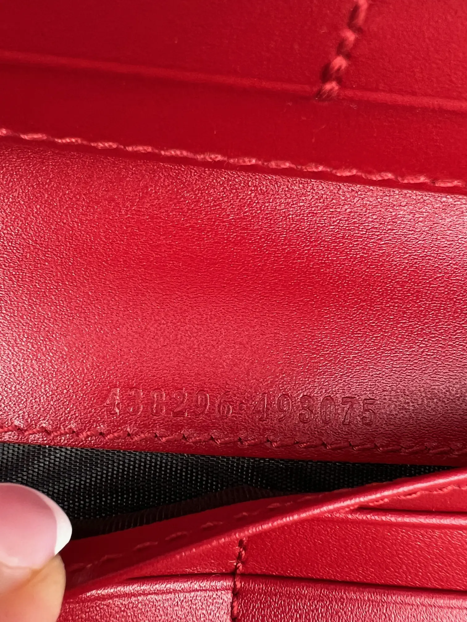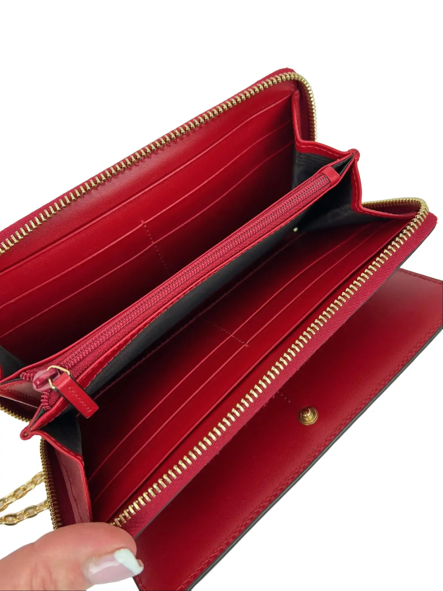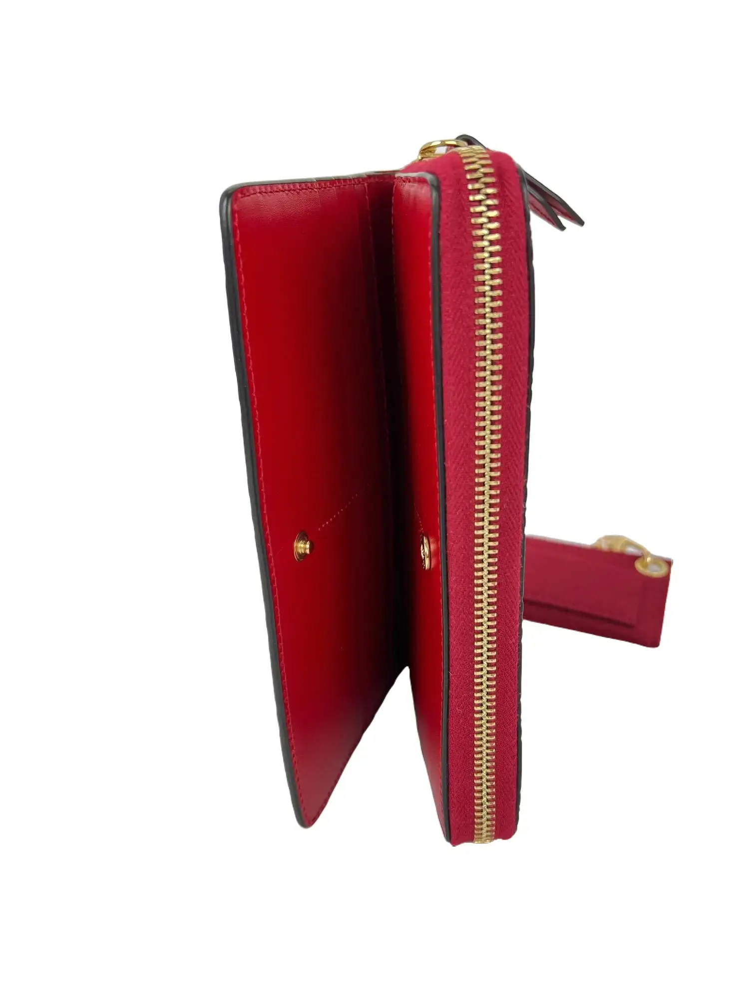 INTERIOR: red leather, 12 credit card slots, snap on outside section then a Zip around with