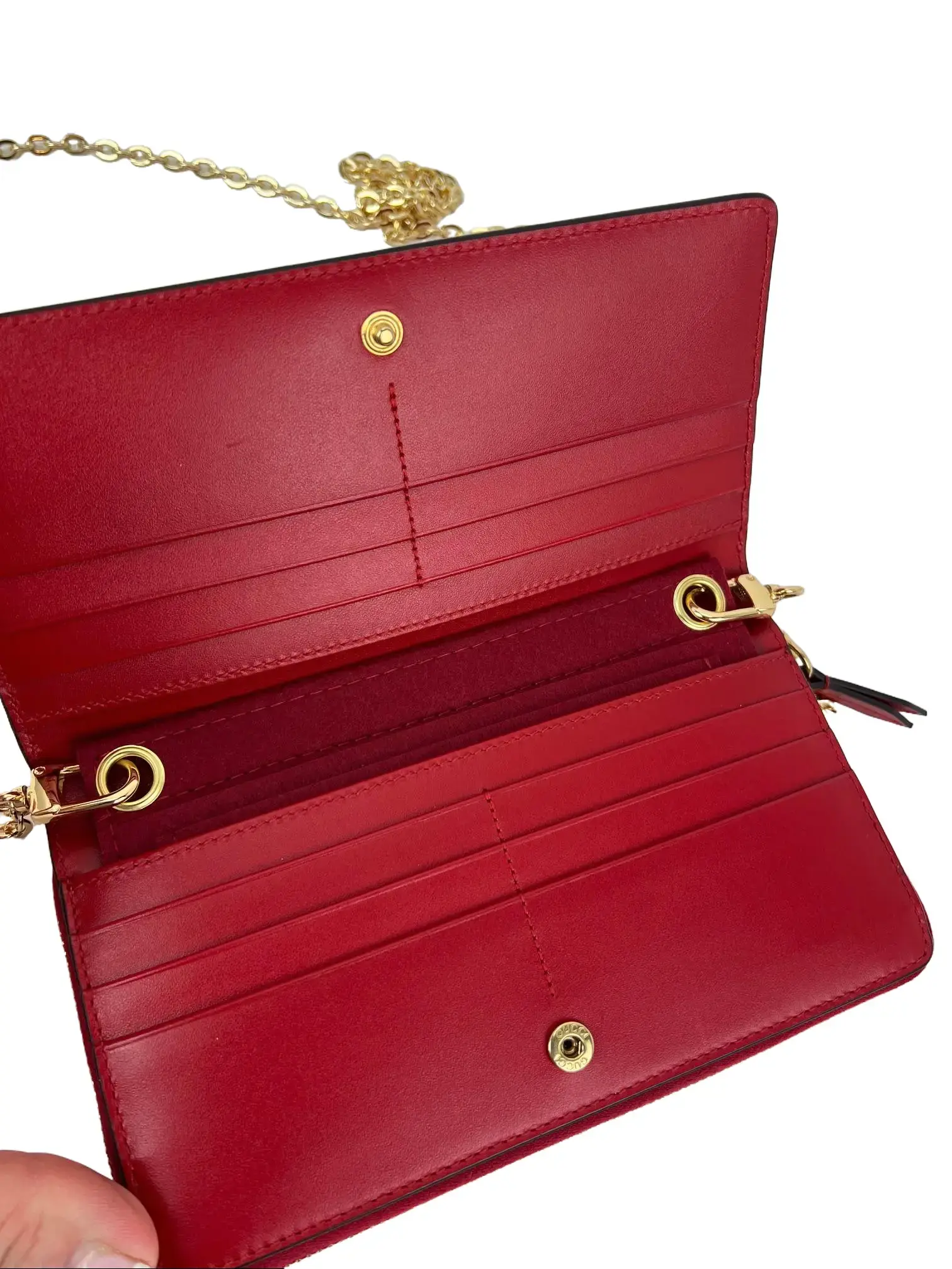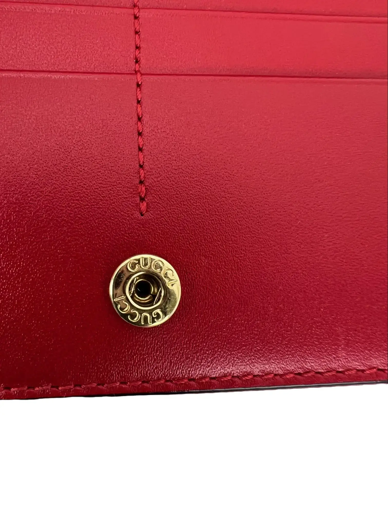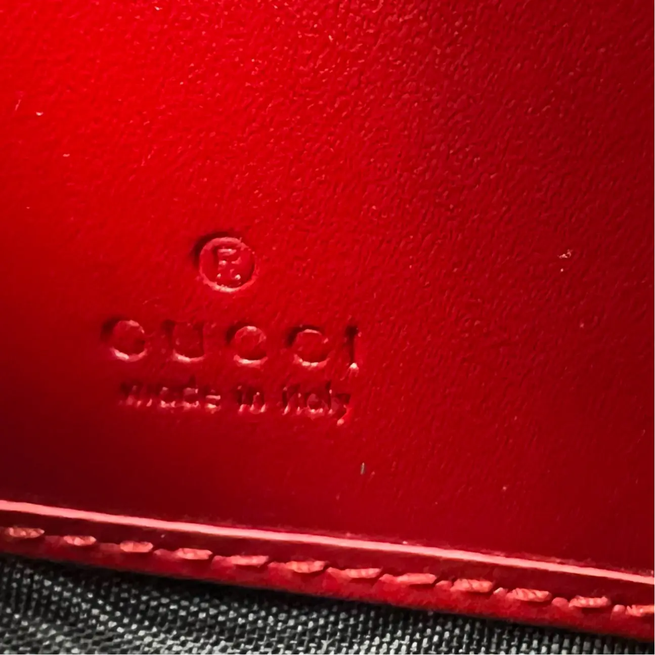 INTERIOR: red leather, 12 credit card slots, snap on outside section then a Zip around with