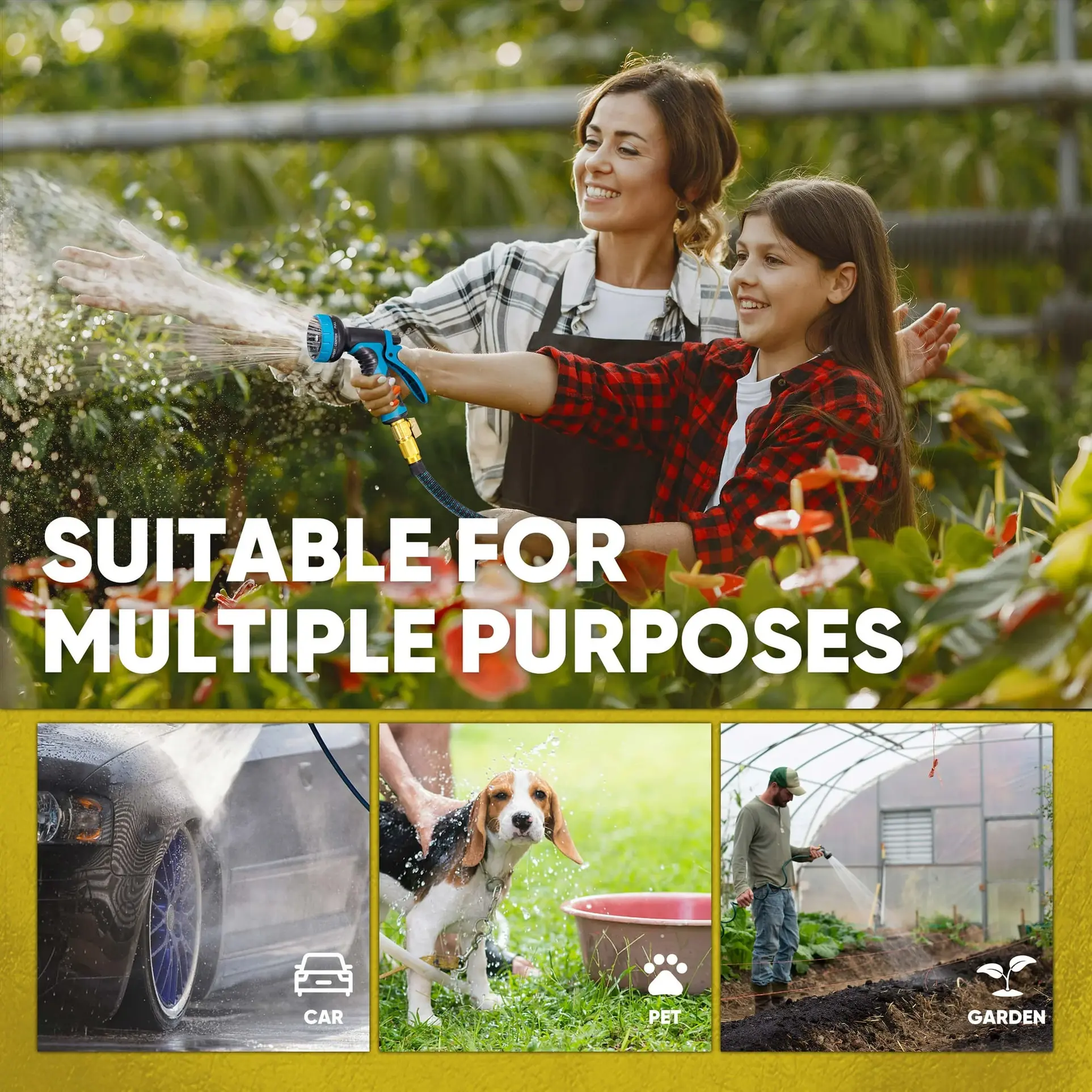 Durable 3300D Polyester Fabric with Latex Core: The flexible, expandable 150-foot hose can withstand kinks, breaks, and even leaks because of its flexible design. It comes with extras, including a 10-nozzle spray hose, expandable garden hose holder, and storage bag Lightweight, Portable, and Easy to Use: You can easily move the expandable garden hose around any patio or garden. This water hose for outside will not tangle and can stretch up to 150 feet to reach even the farthest of spots in your backyard Expandable - The expandable garden hose grows to 150 feet in seconds upon turning the water pressure on and quickly retracts to the original size for easy storage and use. Just ensure enough water pressure to drain the water hose after use 0.75-inch Universal Connectors: Our expandable garden hose includes 3/4-inch connectors that attach to any faucet, allowing you to connect anywhere without additional adapters. The brass connectors are built to last! Connect to any faucet you want with the three included garden hose nozzles. You can even connect your kitchen sink with the included adapters Ergonomic Rubber Spray Hand Grip: You will feel the quality of the 150-foot expandable garden hose handle for effortless operation, with a built-in lock to allow for continuous spraying