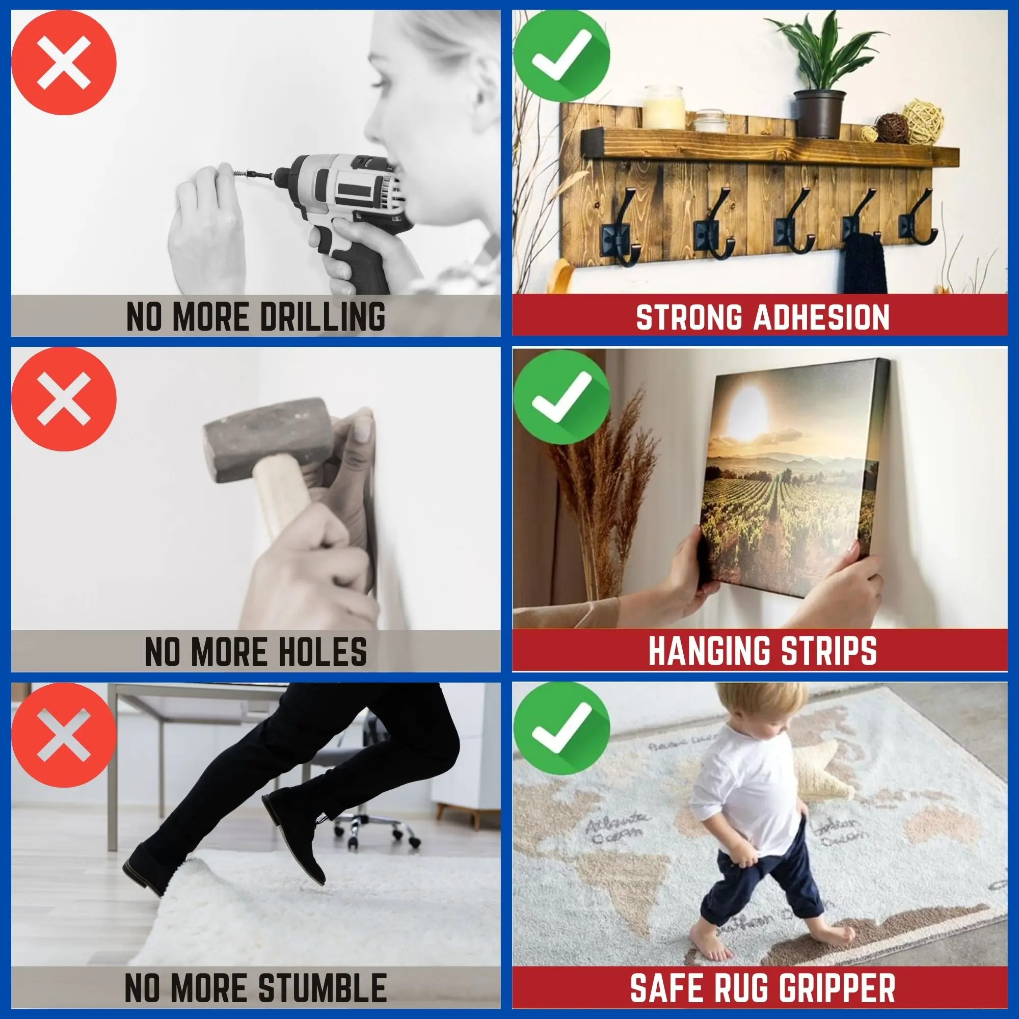 【Diversified Uses to Meet All Your Needs】 – Strong Holding Power can effectively mount or repair stuff without drilling hole or nails, fixing or pasting items such as picture hangers, frames, photos, festival decorations, wall paper stickers, posters, hooks, floating shelves, desk holders, carpets, power sockets, art crafts, board shelf, LED, DIY items, school & house room decor aesthetic and so on.