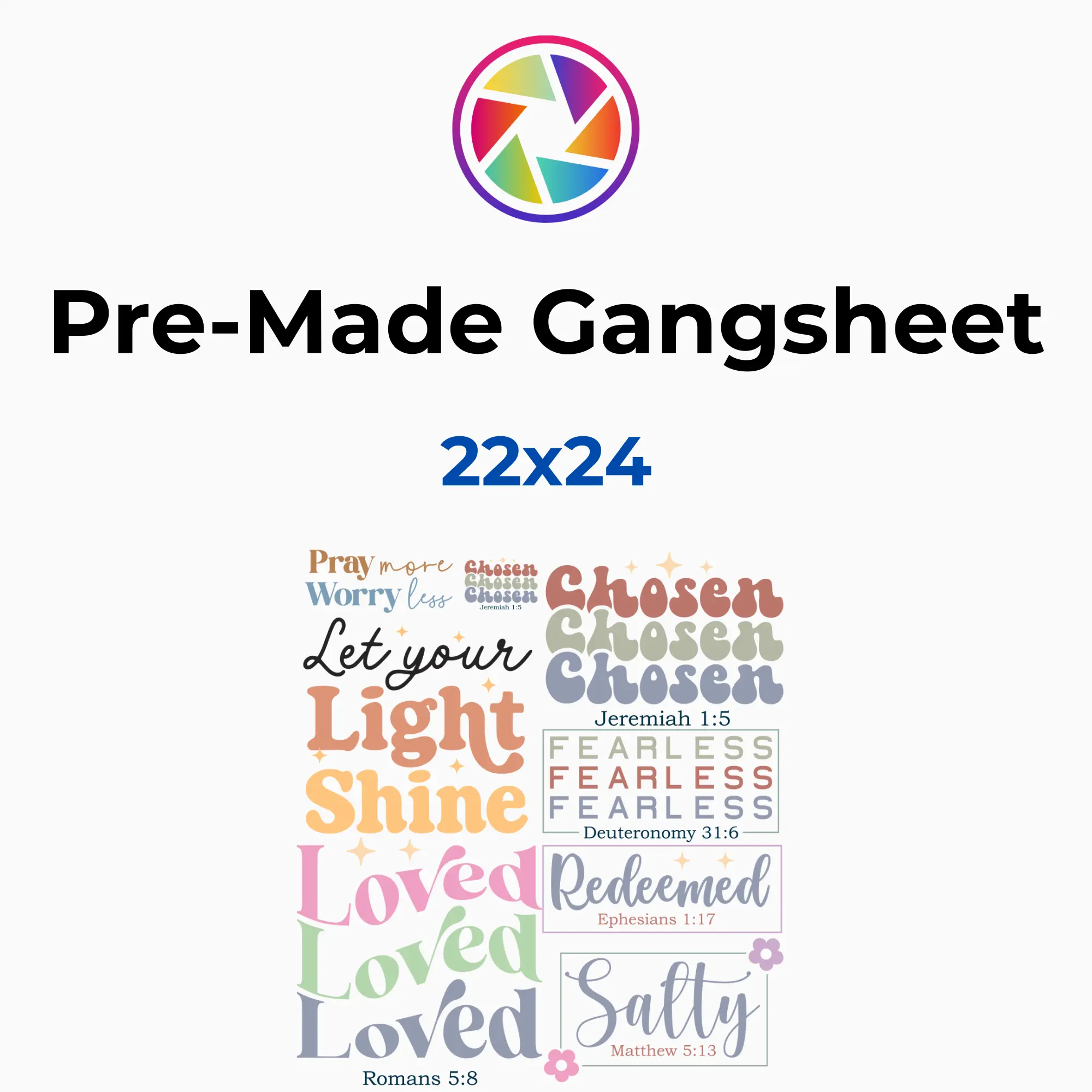 This sheet features multiple soft, aesthetic Christian designs with encouraging messages like “Chosen,” “Loved,” “Fearless,” and “Let Your Light Shine” — all laid out and ready to press so you can maximize your prints and profits with ease.