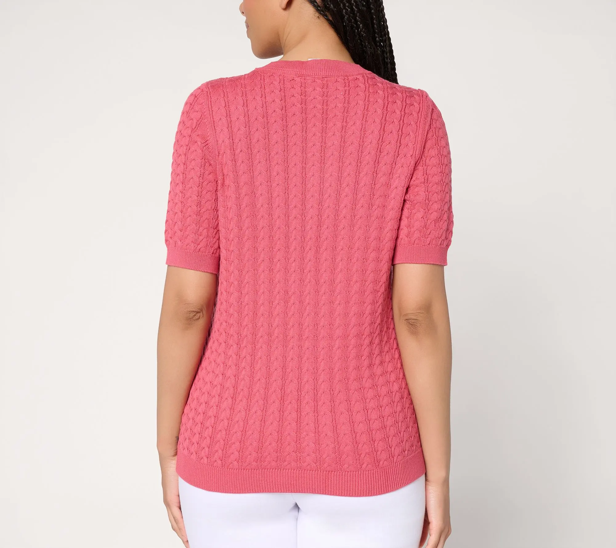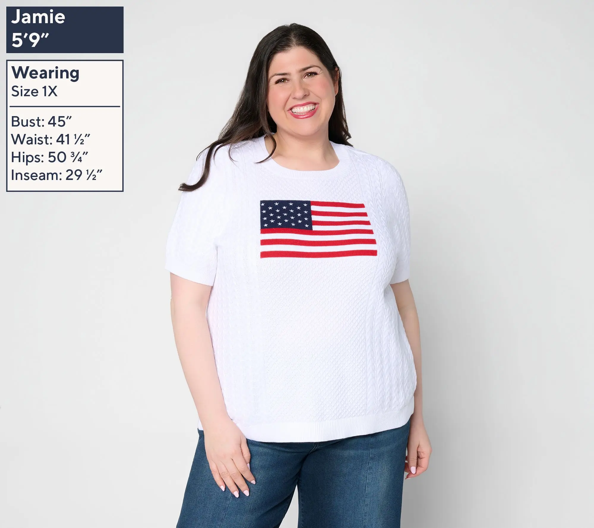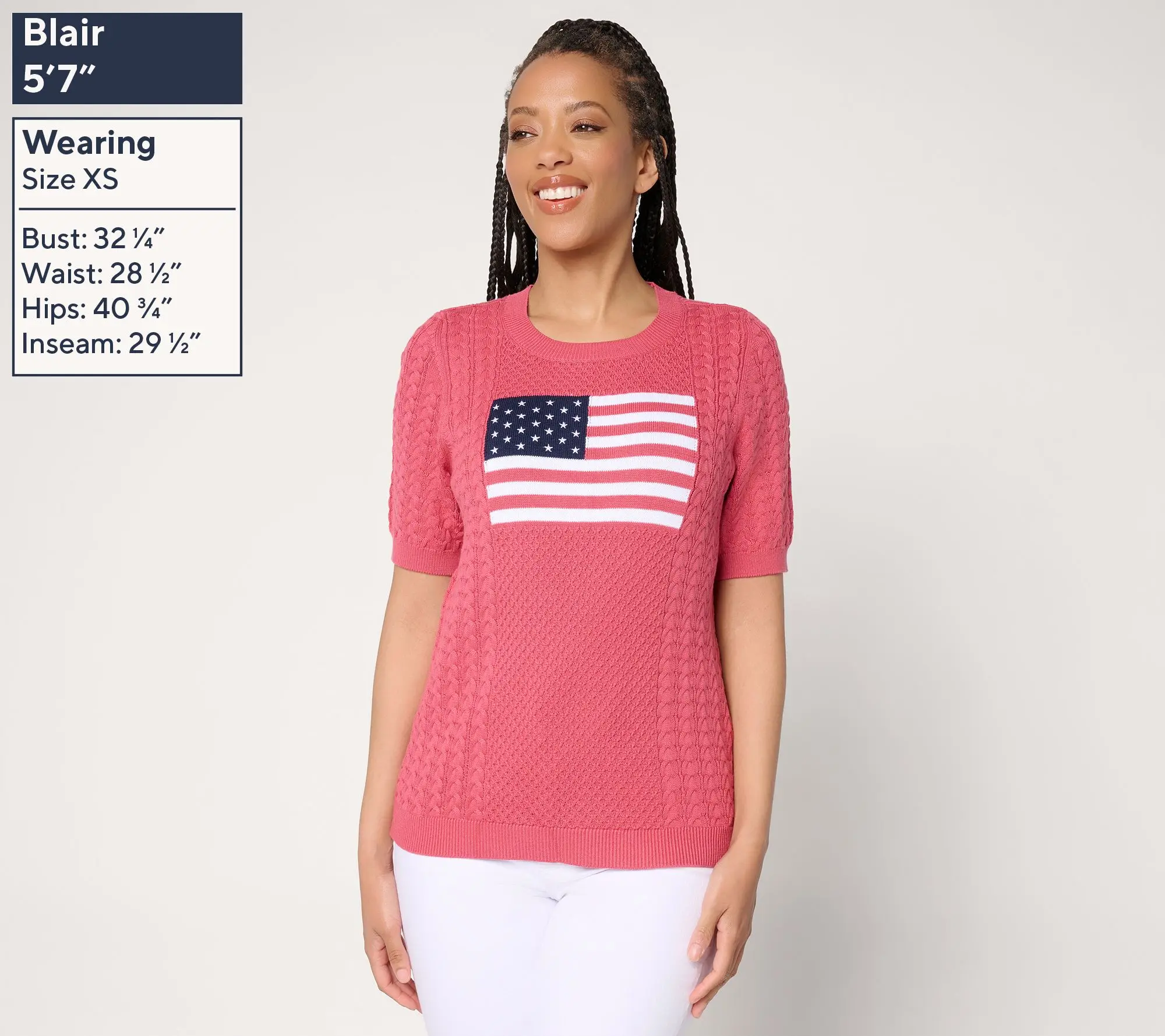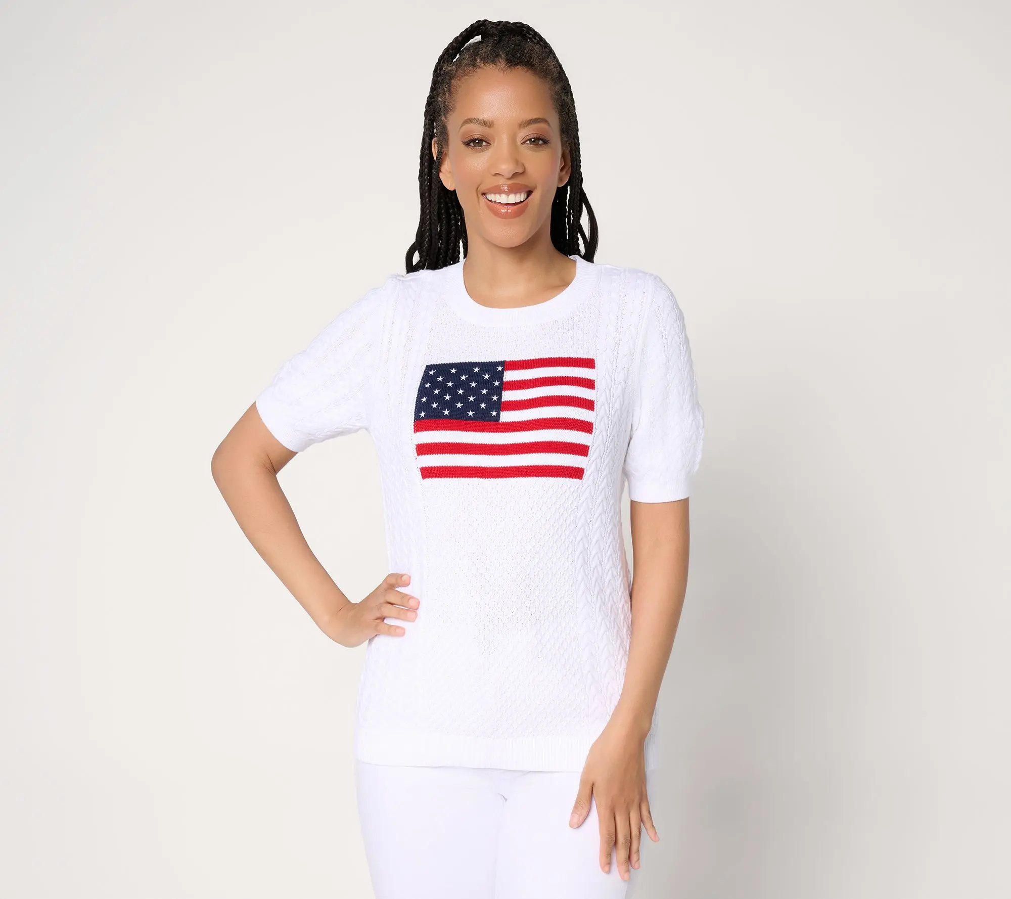 Put your patriotism on full display with this lovely flag sweater. Cable knit details add texture, while the elbow sleeves are oh-so flattering. From the Joan Rivers Classics Collection®.