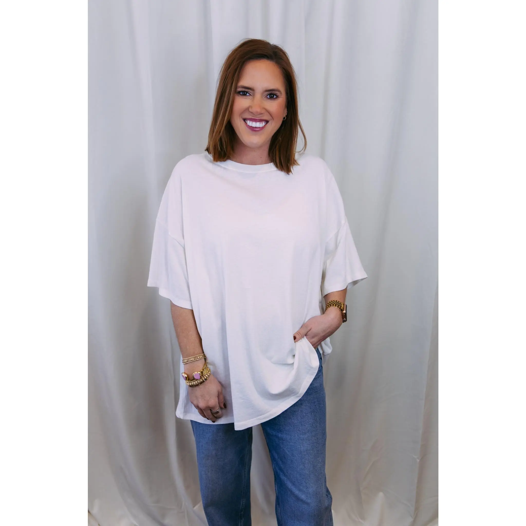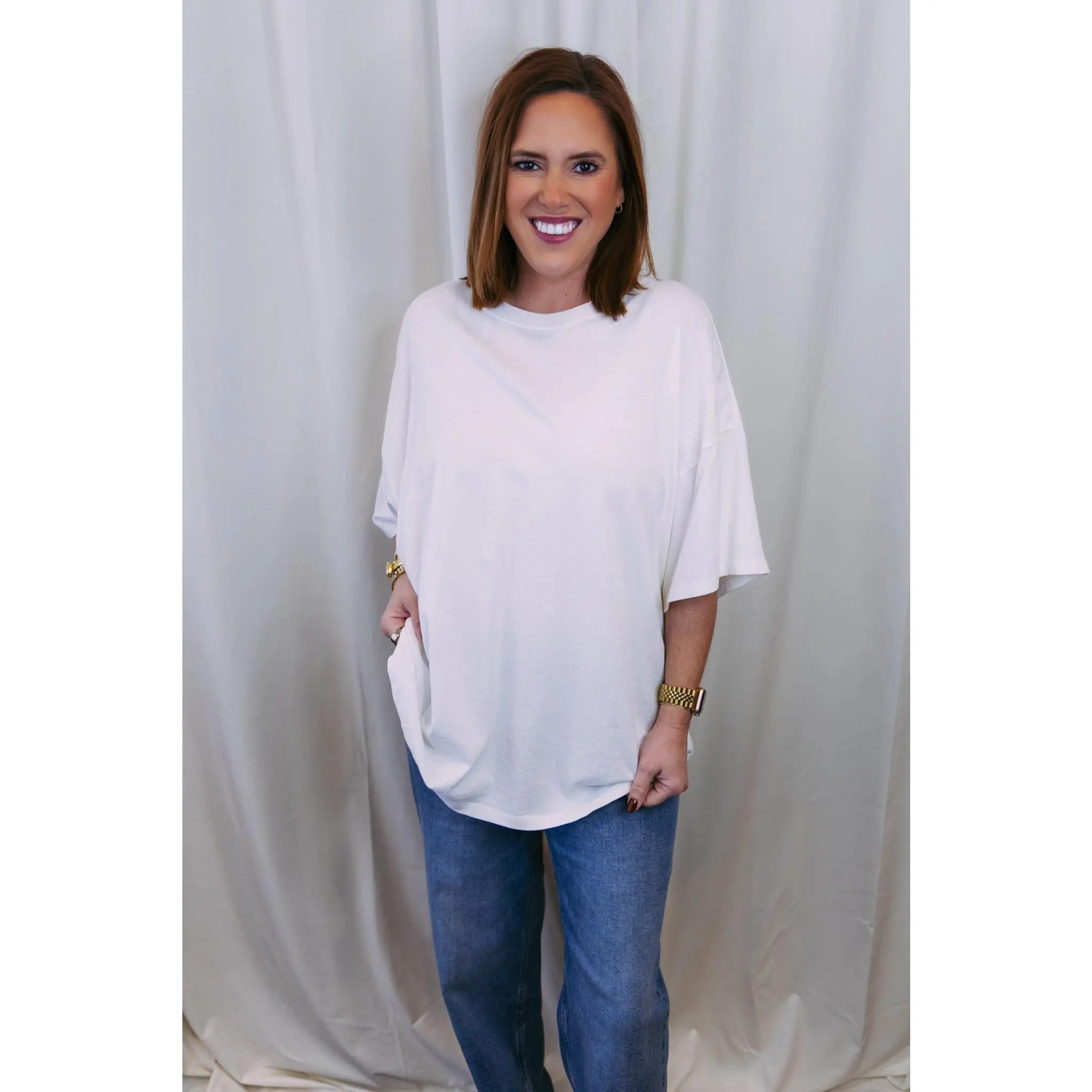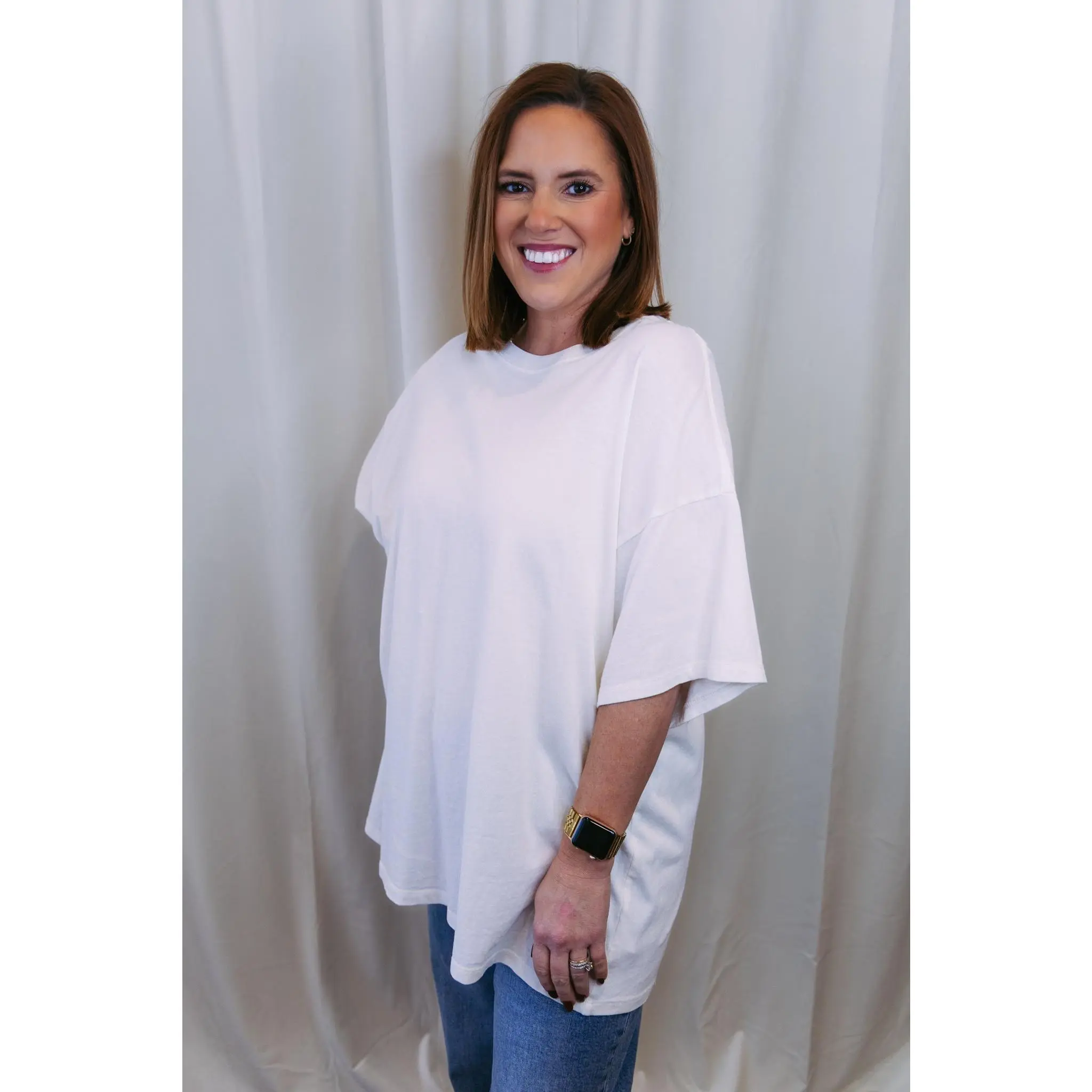 The perfect everyday essential—this oversized basic tee is designed for effortless style. Crafted in a soft off-white hue, it's the kind of piece you'll reach for again and again. Throw it on with your favorite jeans, layer it under a jacket, or wear it solo. Relaxed, comfortable, and endlessly versatile, it's a wardrobe staple that works as hard as you do.