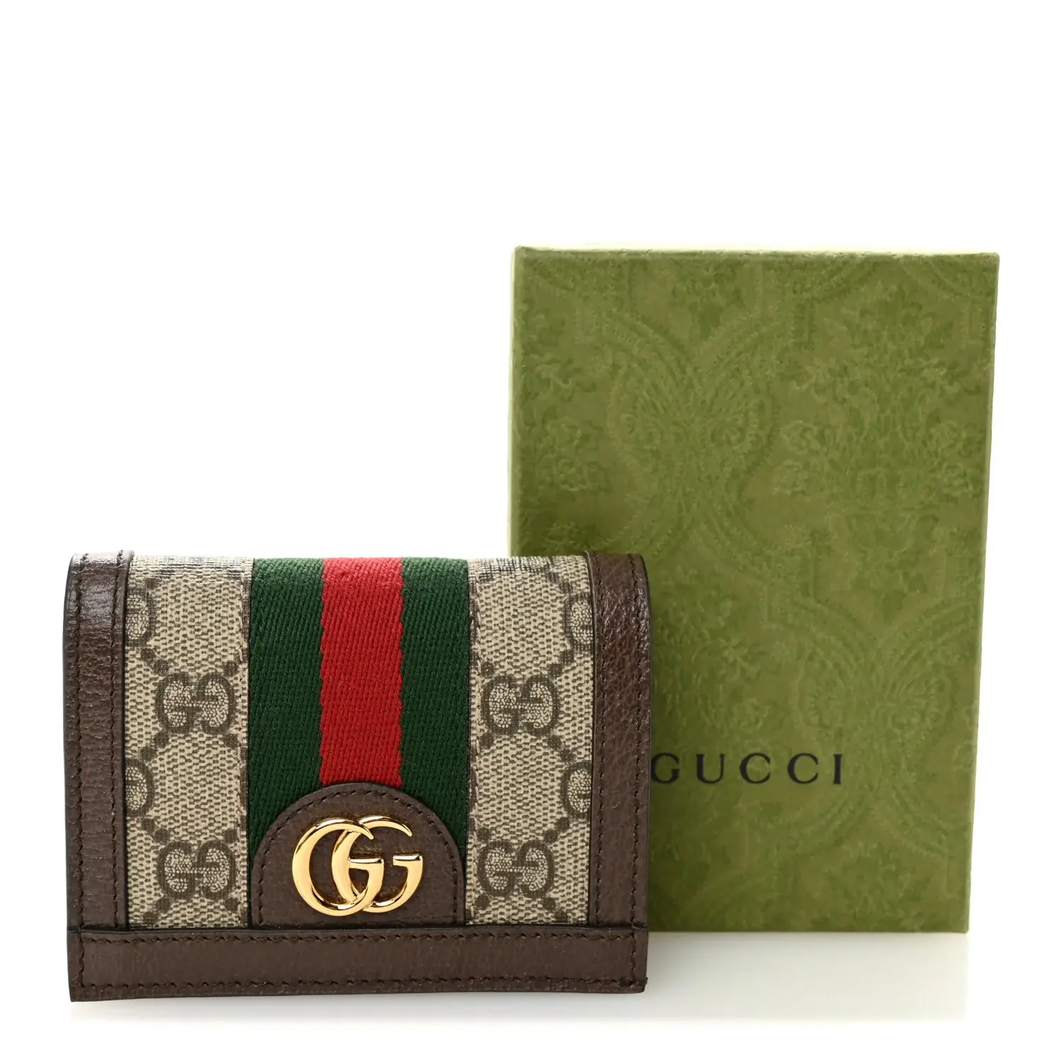 This is an authentic GUCCI GG Supreme Monogram Web Ophidia Card Case in Beige and New Acero. This stylish wallet is crafted of Gucci GG monogram coated canvas with a green and red stripe and brown trim. This wallet features a snap button closure in gold. The flap opens to a brown leather interior with card slots, a coin pocket, and a bill compartment.