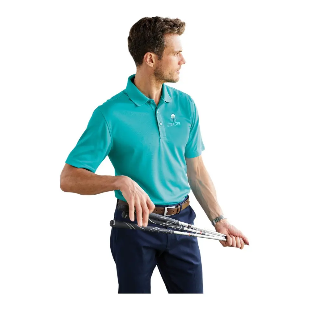 This durable, moisture-wicking polo is made from 100% polyester double knit pique and features UV protection with a UPF rating of 30. The breathable mesh fabric resists snags, making it ideal for outdoor activities. The flat knit collar, 3-button placket, and side vents enhance both comfort and style, while the tag-free label adds extra convenience.