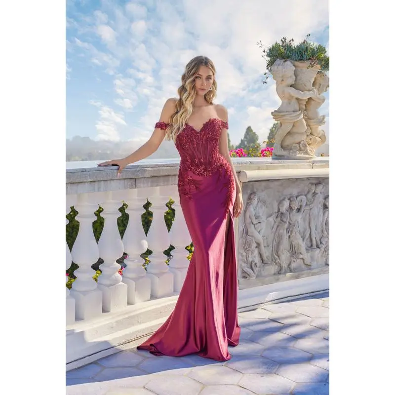 Off-the-shoulder gown with a structured beaded bodice, lace-up back, ruched hip detailing, and a high-slit fitted skirt.