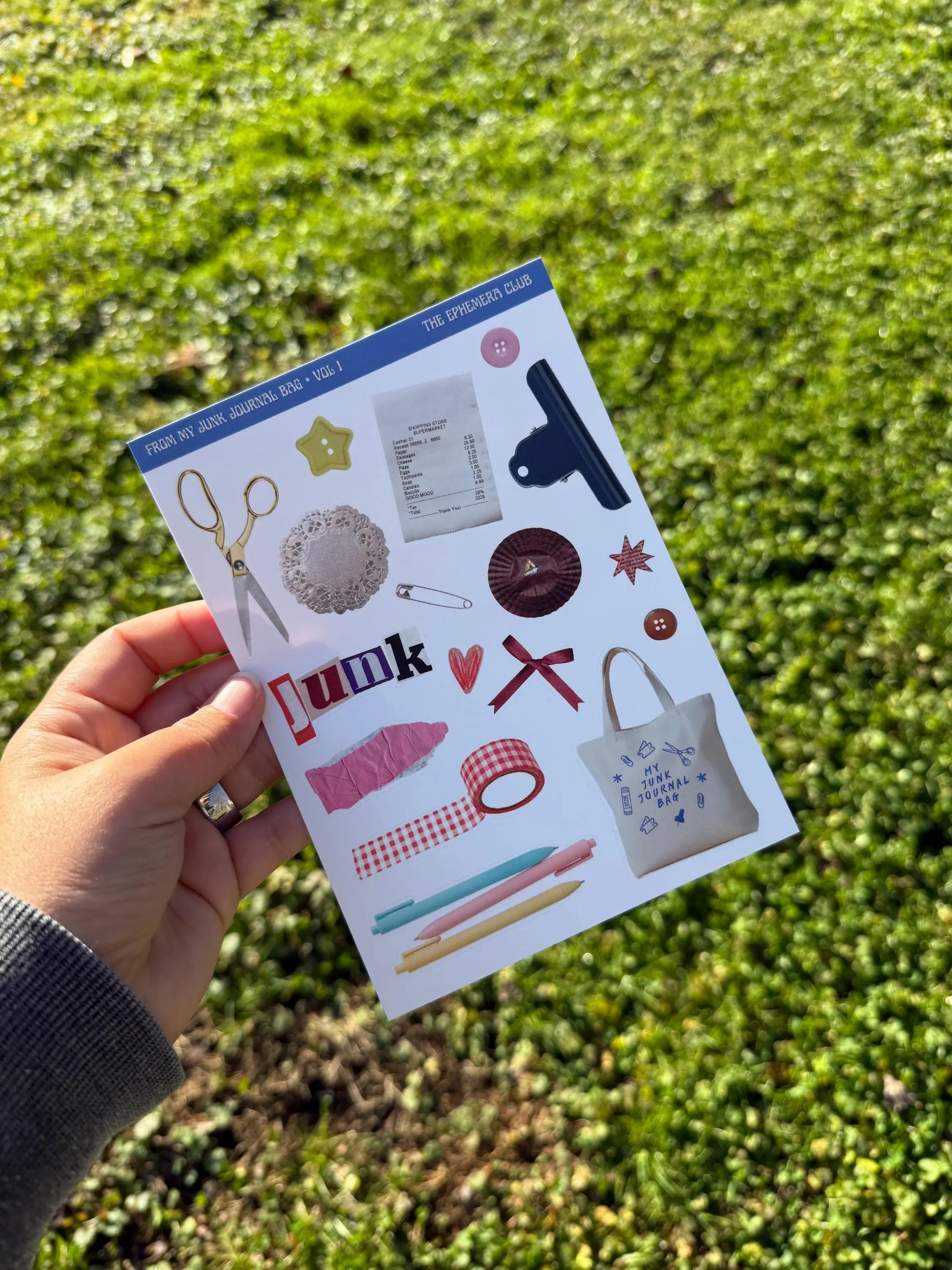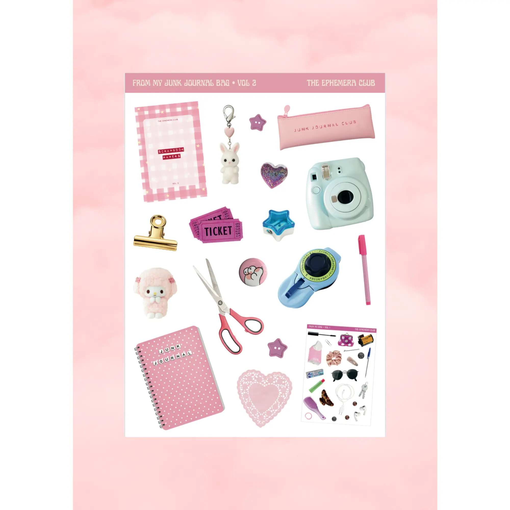 Introducing FROM MY JUNK JOURNALING BAG – Vol. 1 & 2 part of the new FROM… sticker series by The Ephemera Club. Each volume is designed around the little treasures, tools, and scraps you’d find in a junk journaling bag — the things you actually use when creating spreads.