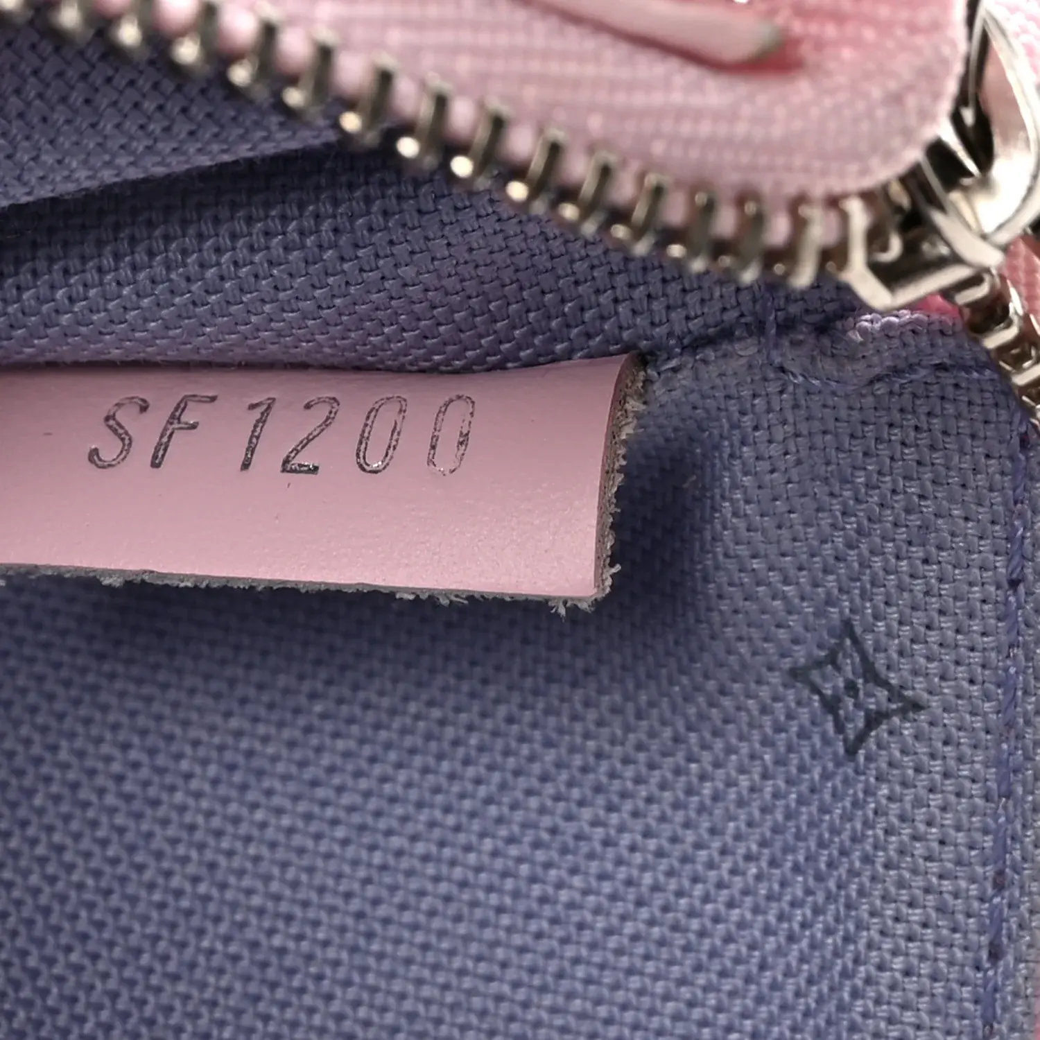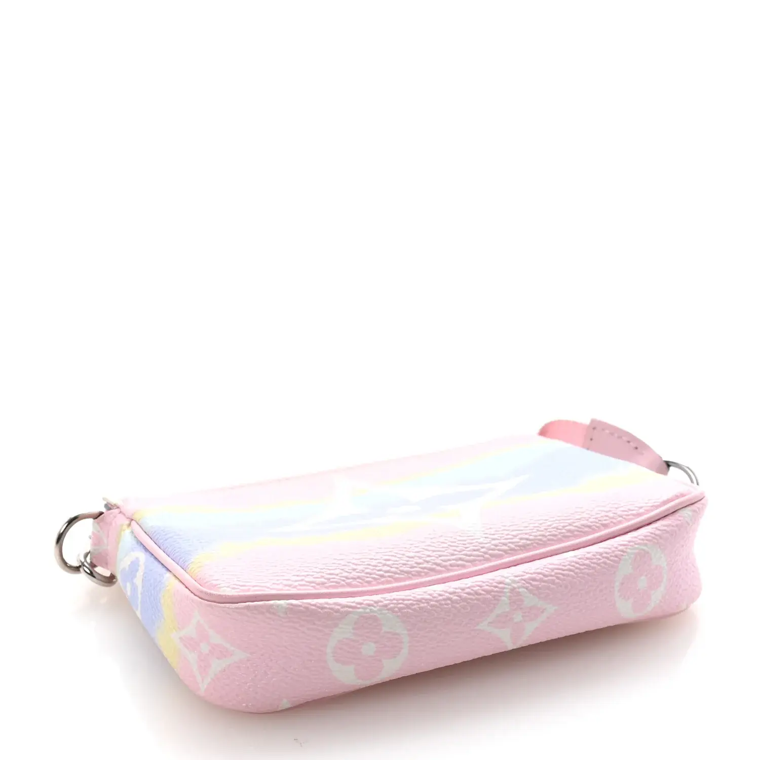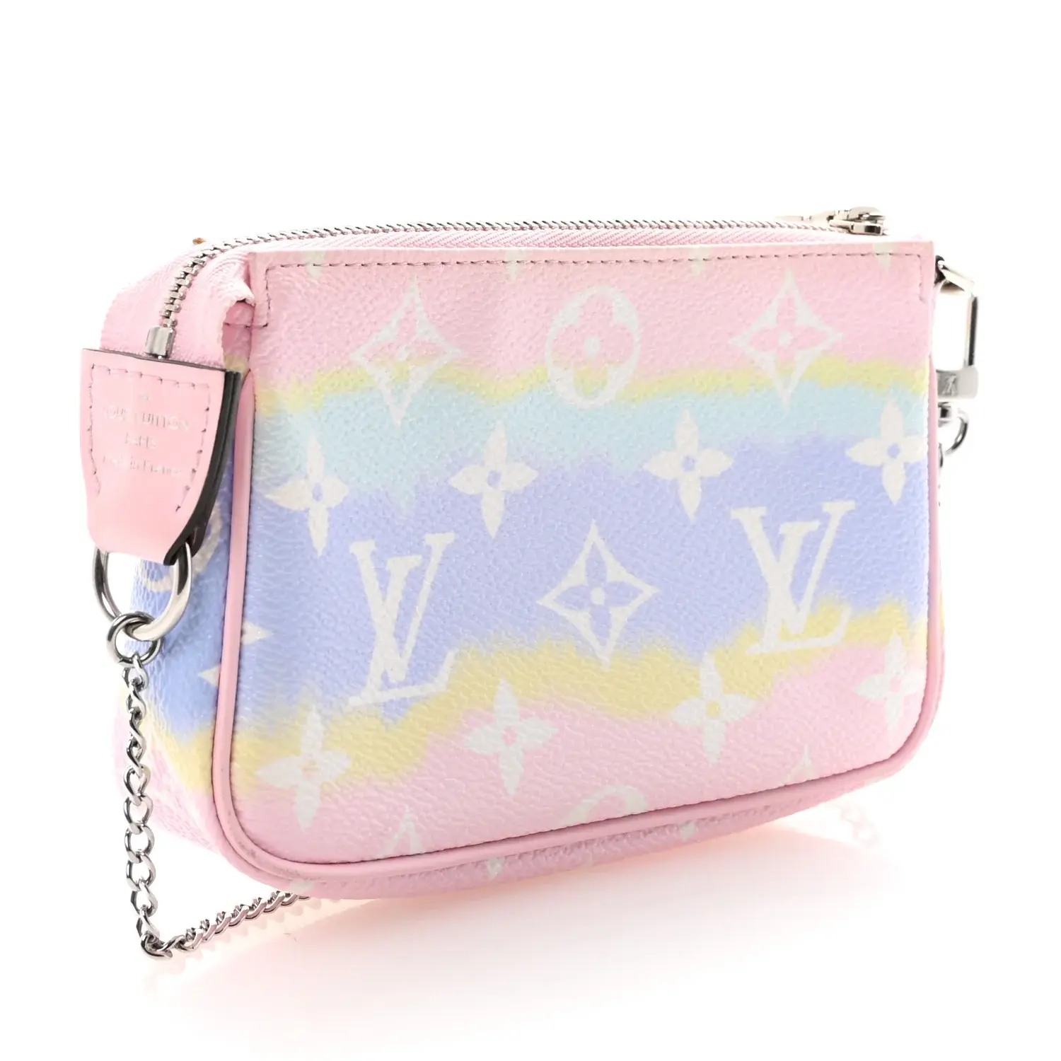 This is an LOUIS VUITTON Monogram Escale Mini Pochette Accessories in Pastel. This mini pochette is crafted of Louis Vuitton multicolor pastel coated canvas. The pochette features pink leather trim and silver hardware including a chain strap. The top zipper opens to a purple monogram interior.