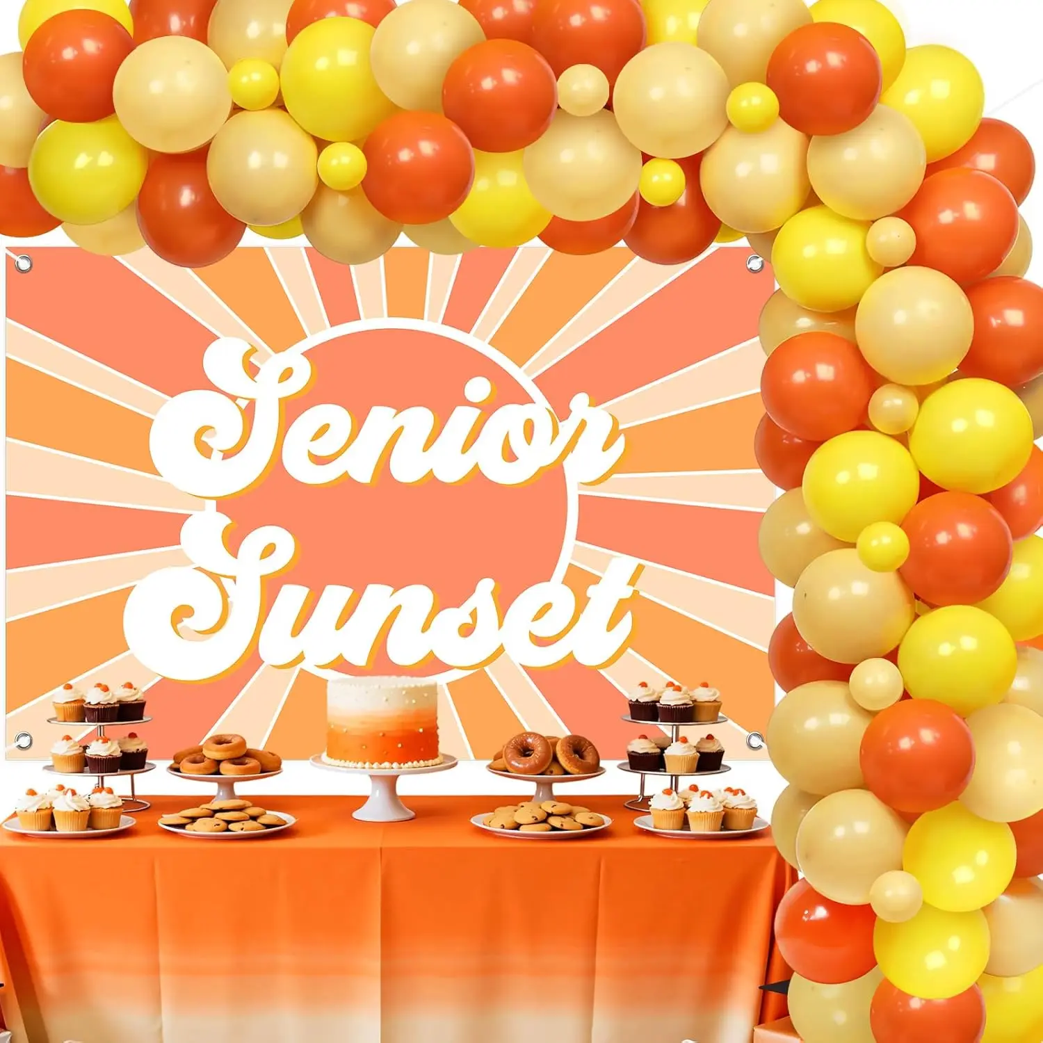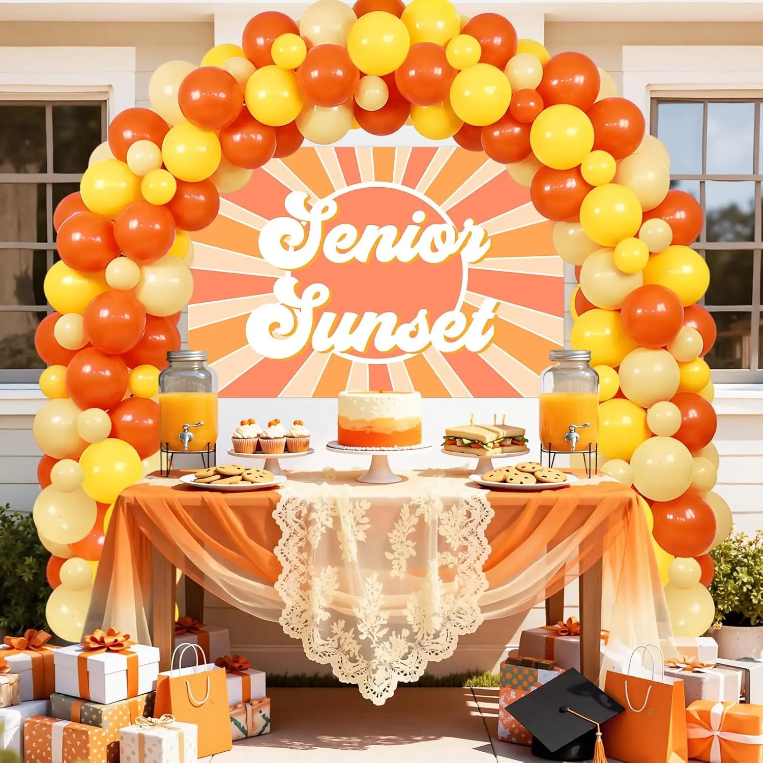Celebrate the Class of 2026 with a vibrant balloon arch and senior sunset backdrop for graduation parties.