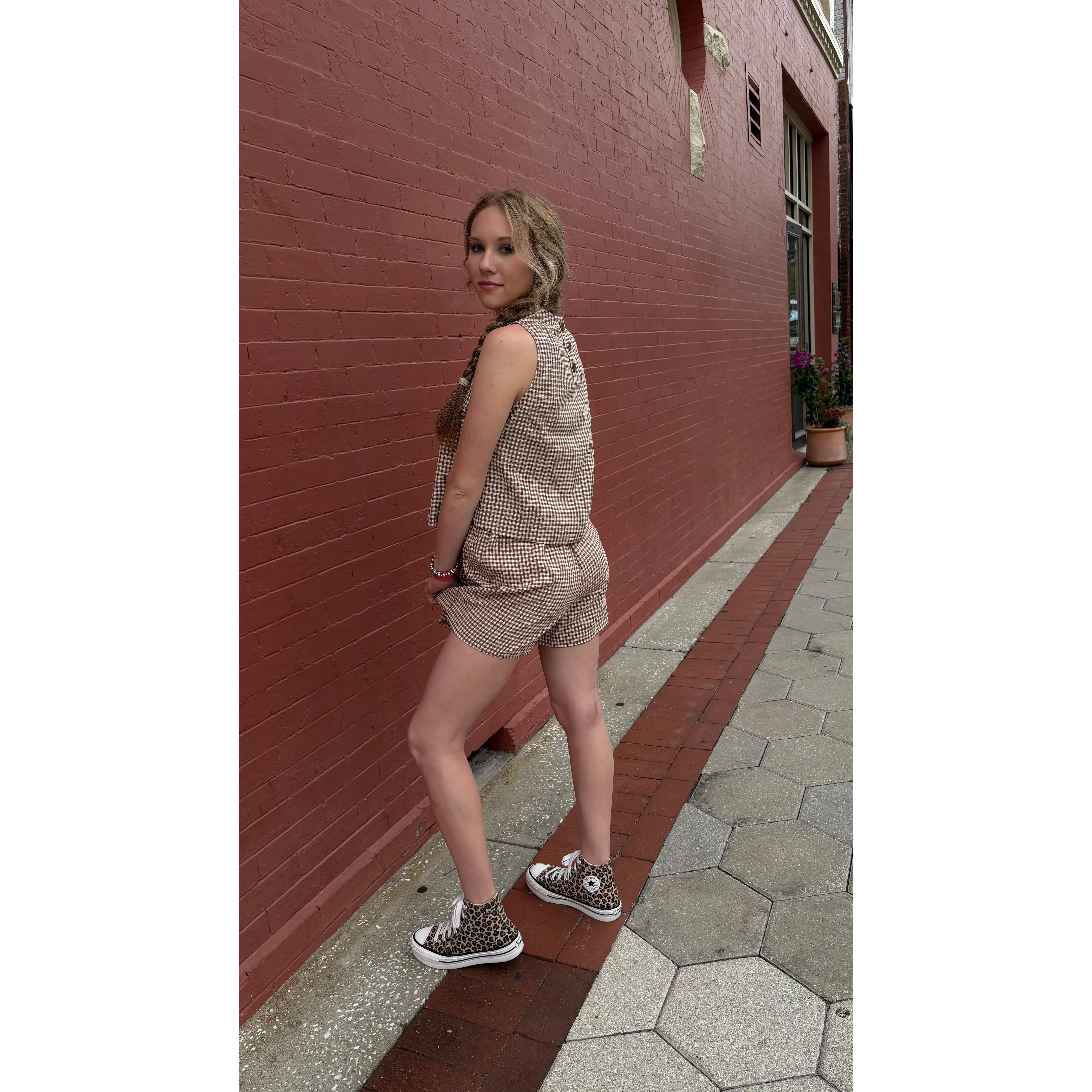 Chic, playful, and effortlessly stylish—the Maple Grove Gingham Skort Set brings classic cottagecore vibes to your wardrobe 🍂☀️. Featuring a brown and white gingham skort paired with a cropped back-button tank, this set is perfect for sunny days, casual outings, or weekend adventures.