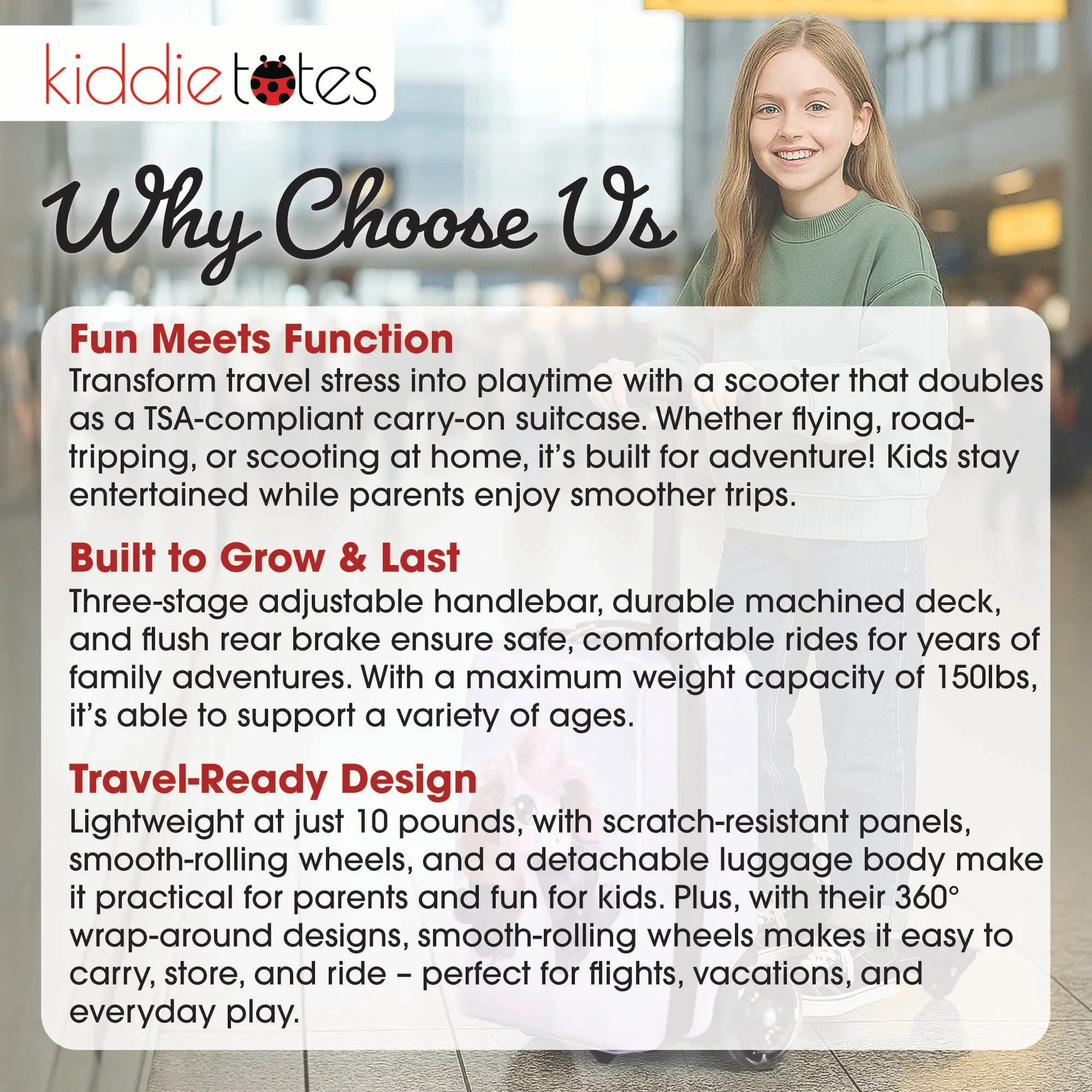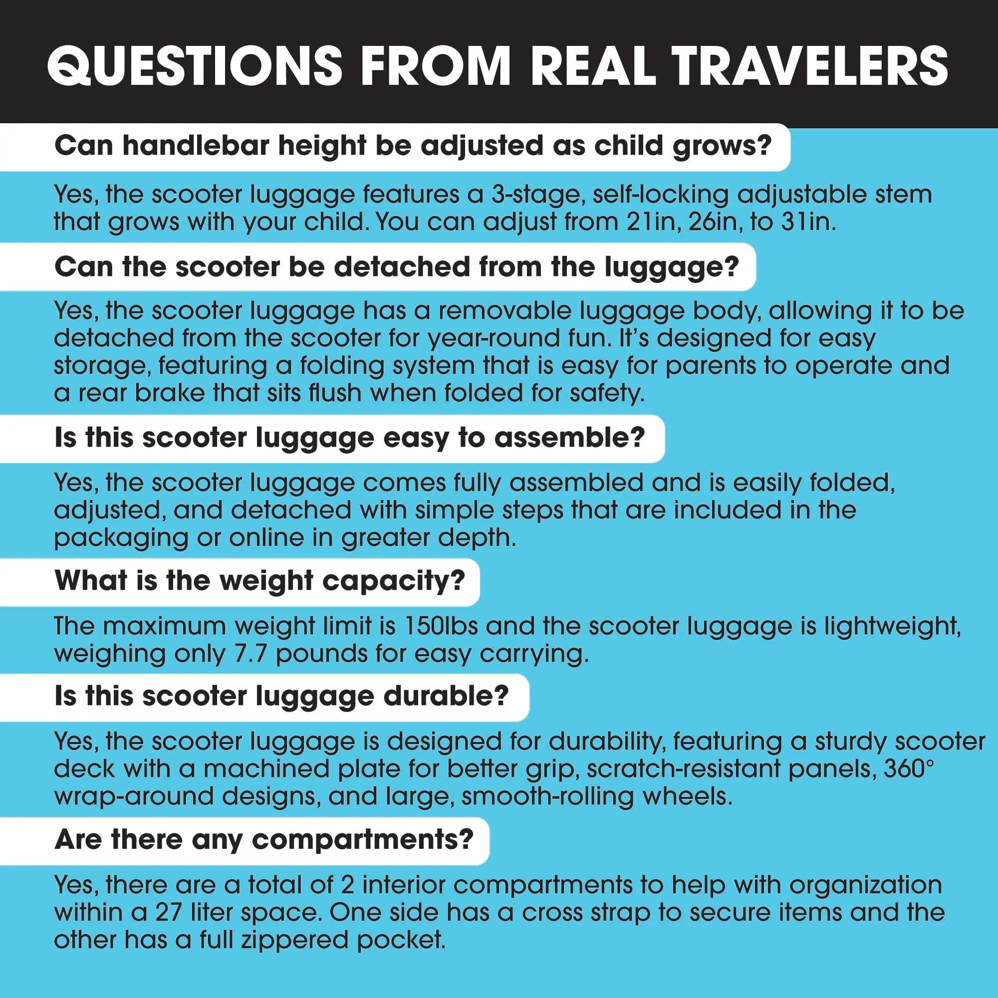·GROWS WITH YOUR CHILD – Adjustable handlebar with three height levels and durable grips make this scooter suitcase perfect for kids of various ages and heights. For Ages 4+. 150 lb rider weight capacity.