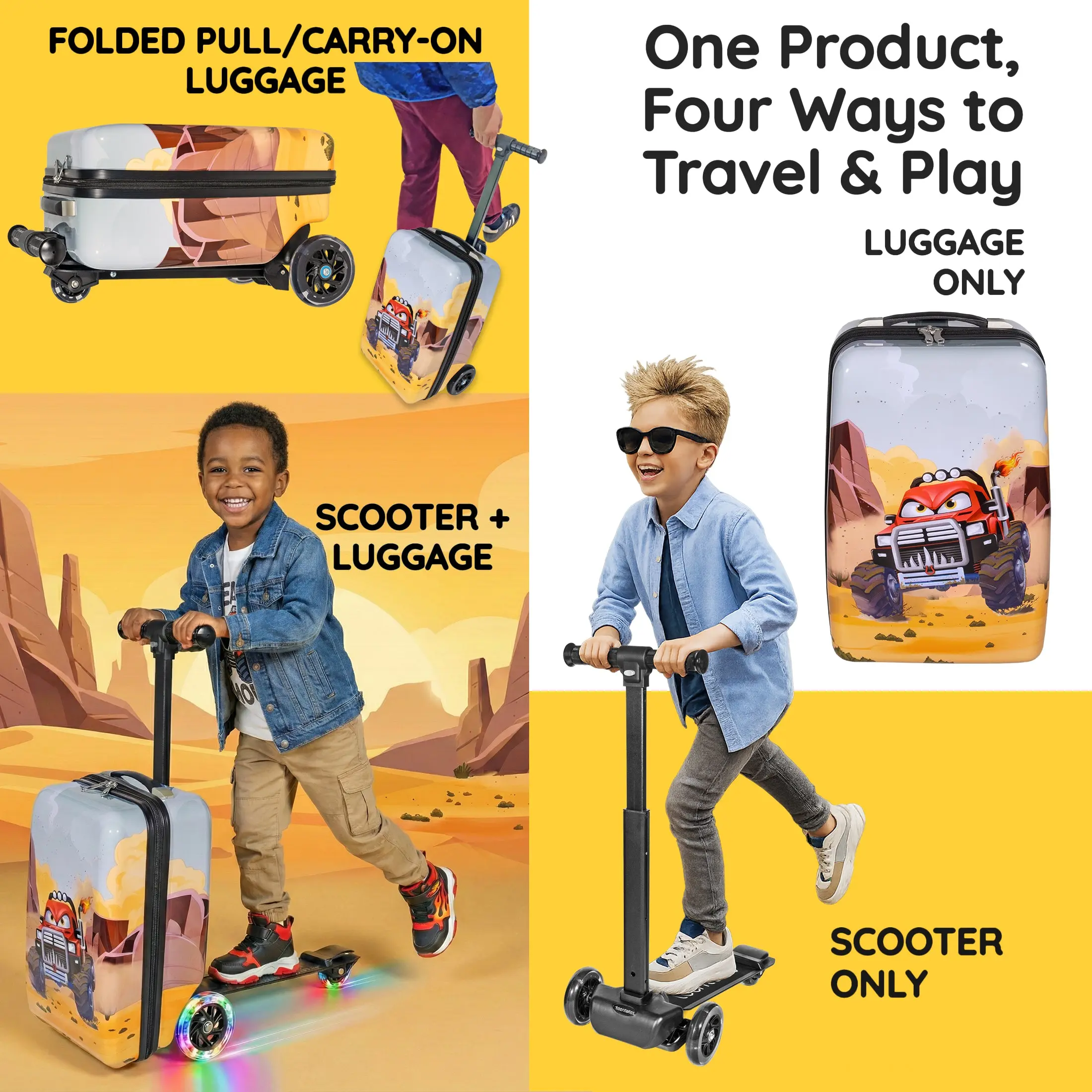 ·DETACHABLE SCOOTER DESIGN – Use as a ride-on suitcase or a freestanding scooter for everyday play. The removable luggage body gives kids two fun options: travel or scoot.