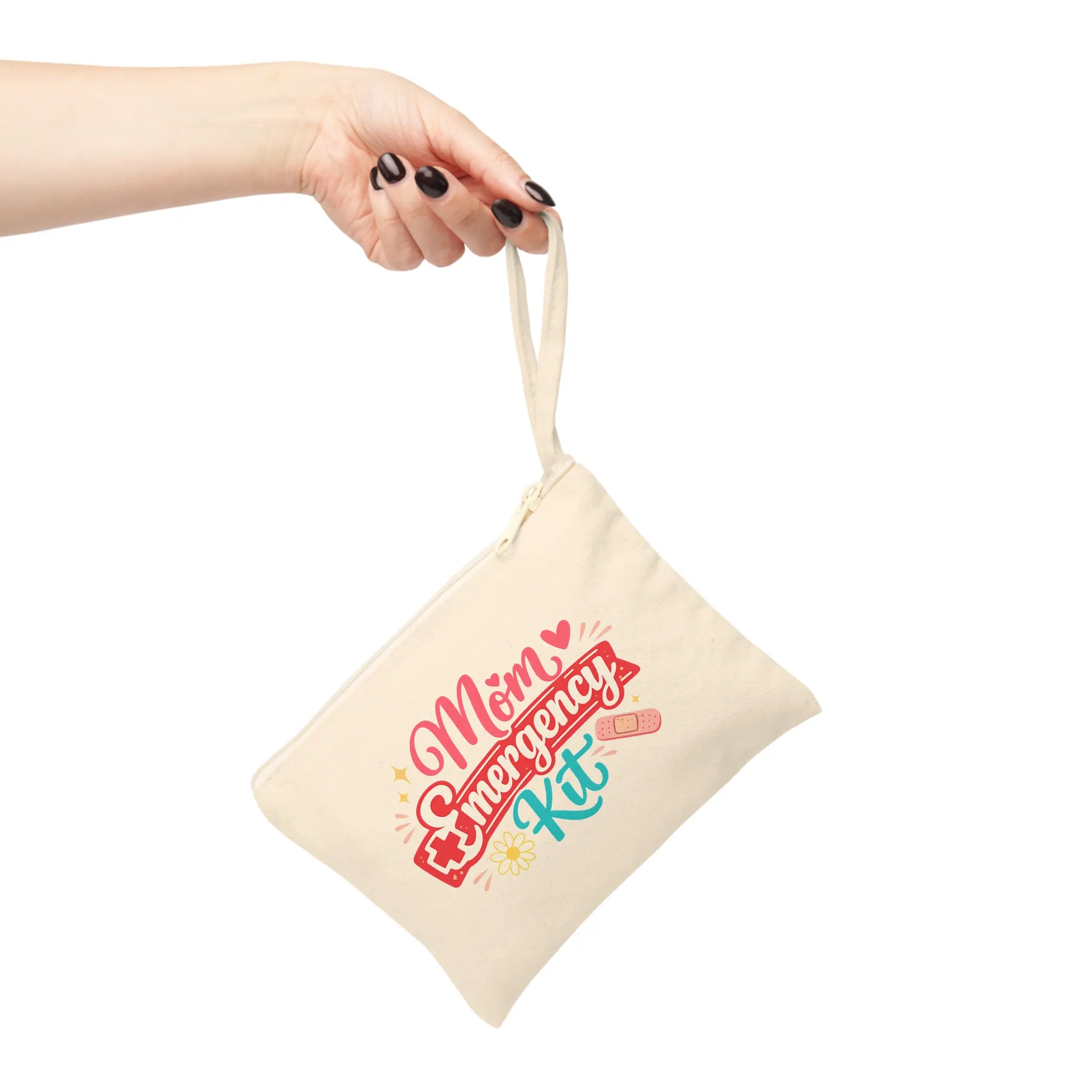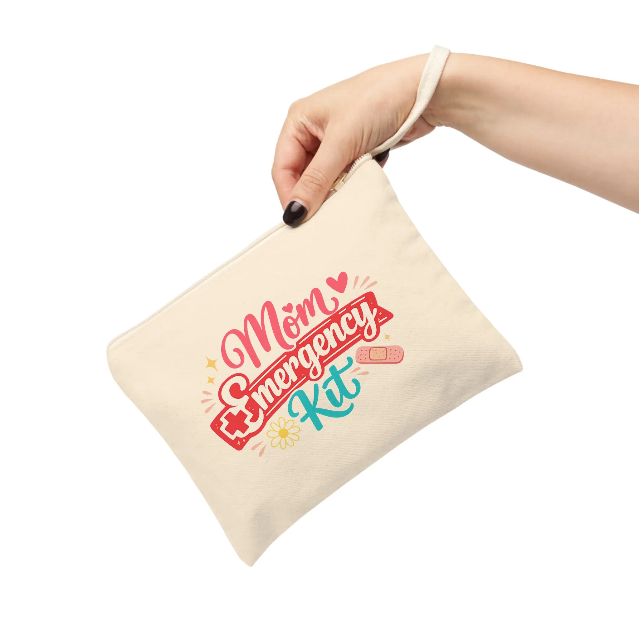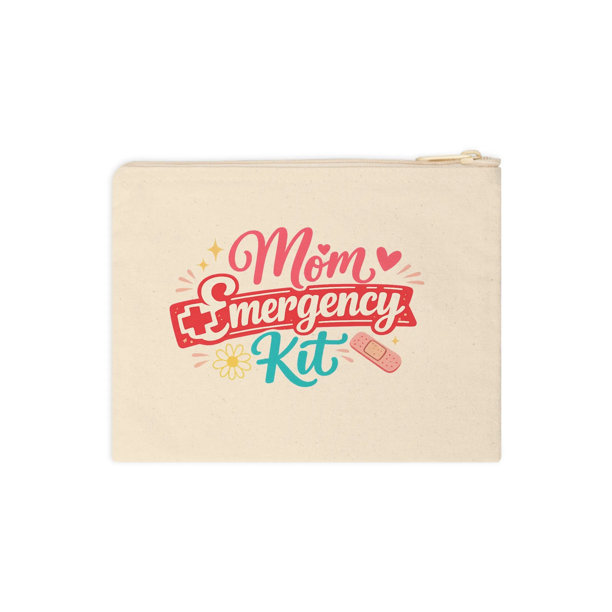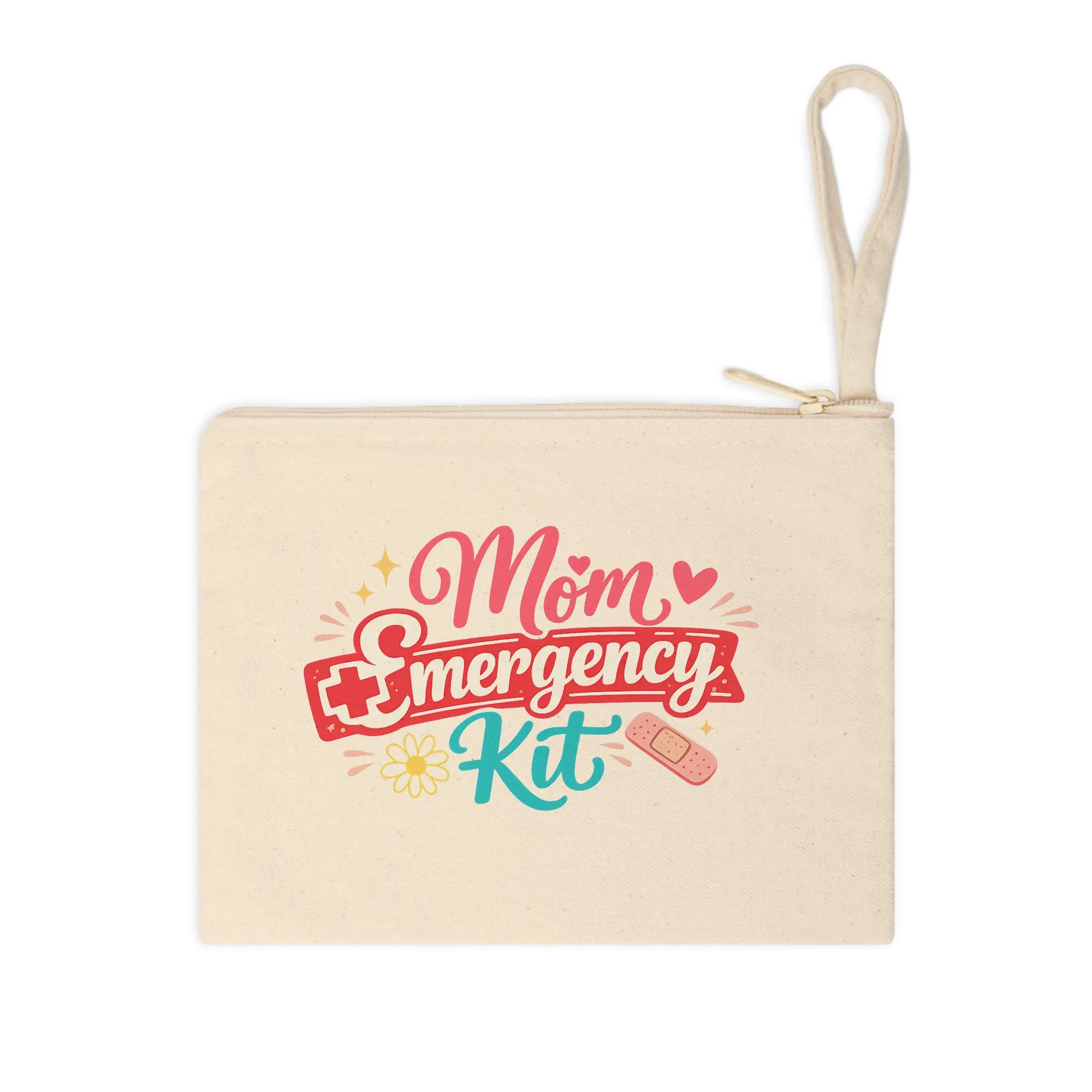 A cheerful cotton canvas zipper pouch designed to carry the little lifesavers moms reach for every day. Warm cream canvas and a matching cream zipper set a soft, neutral stage for the colorful “Mom Emergency Kit” artwork—playful pink script, a bold red banner, and teal accents with tiny bandage and heart details. The top loop strap makes it easy to slip onto a wrist or hang inside a tote. It’s roomy enough for bandaids, lip balm, a few cosmetics, keys or medication, and small keepsakes. Light, durable, and lined with natural texture, this pouch settles into daily routines: stroller handlebars, gym bags, school drop-off totes, or the glovebox. The design speaks directly to caregivers who move fast, care deeply, and like a bit of fun in their essentials.