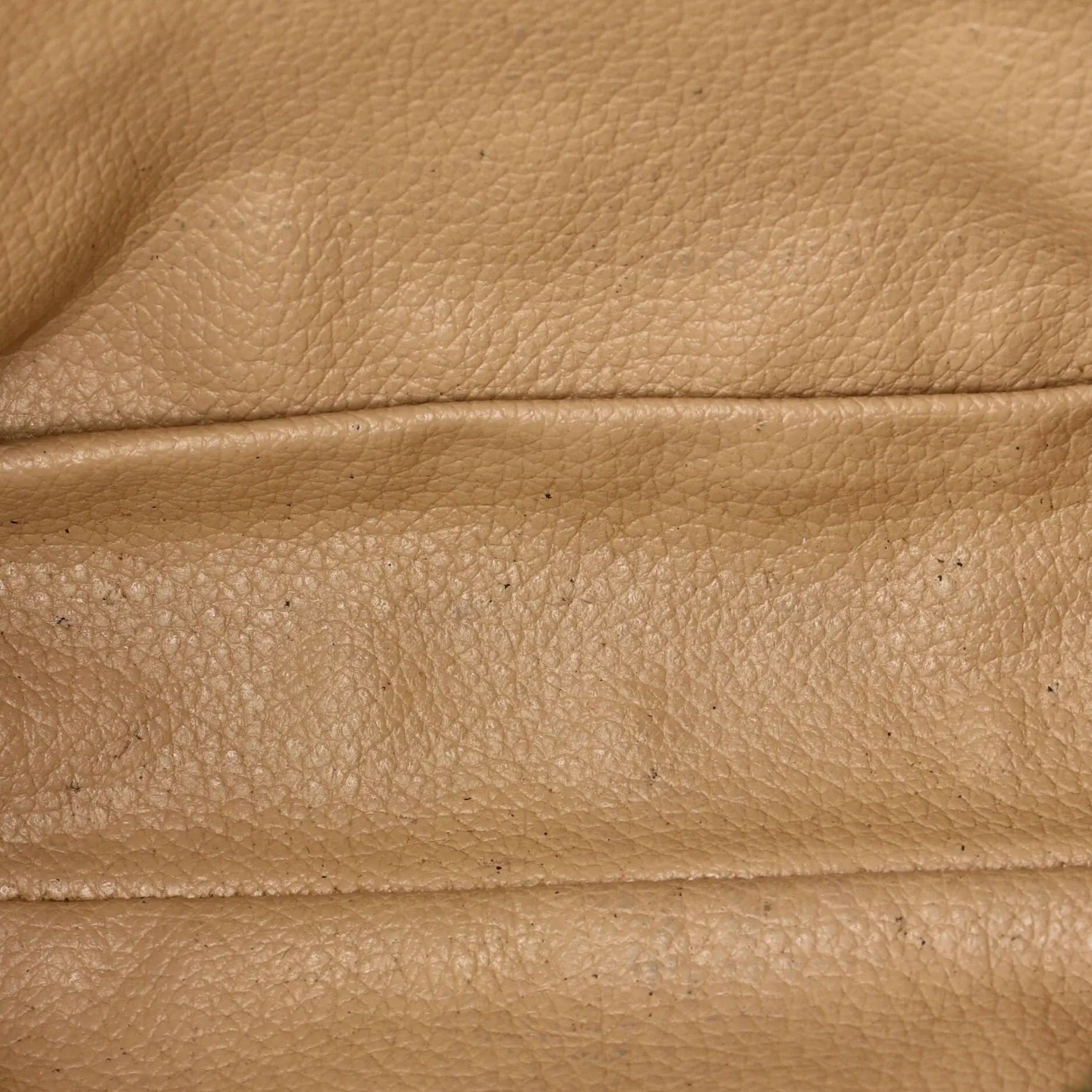 Condition: Fair. Odor in interior. Moderate creases and discoloration on exterior, heavy wear and peeling on base and opening corners, minor fraying on exterior stitching, wear, darkening, and marks in interior, heavy scratches, discoloration, and tarnish on hardware.