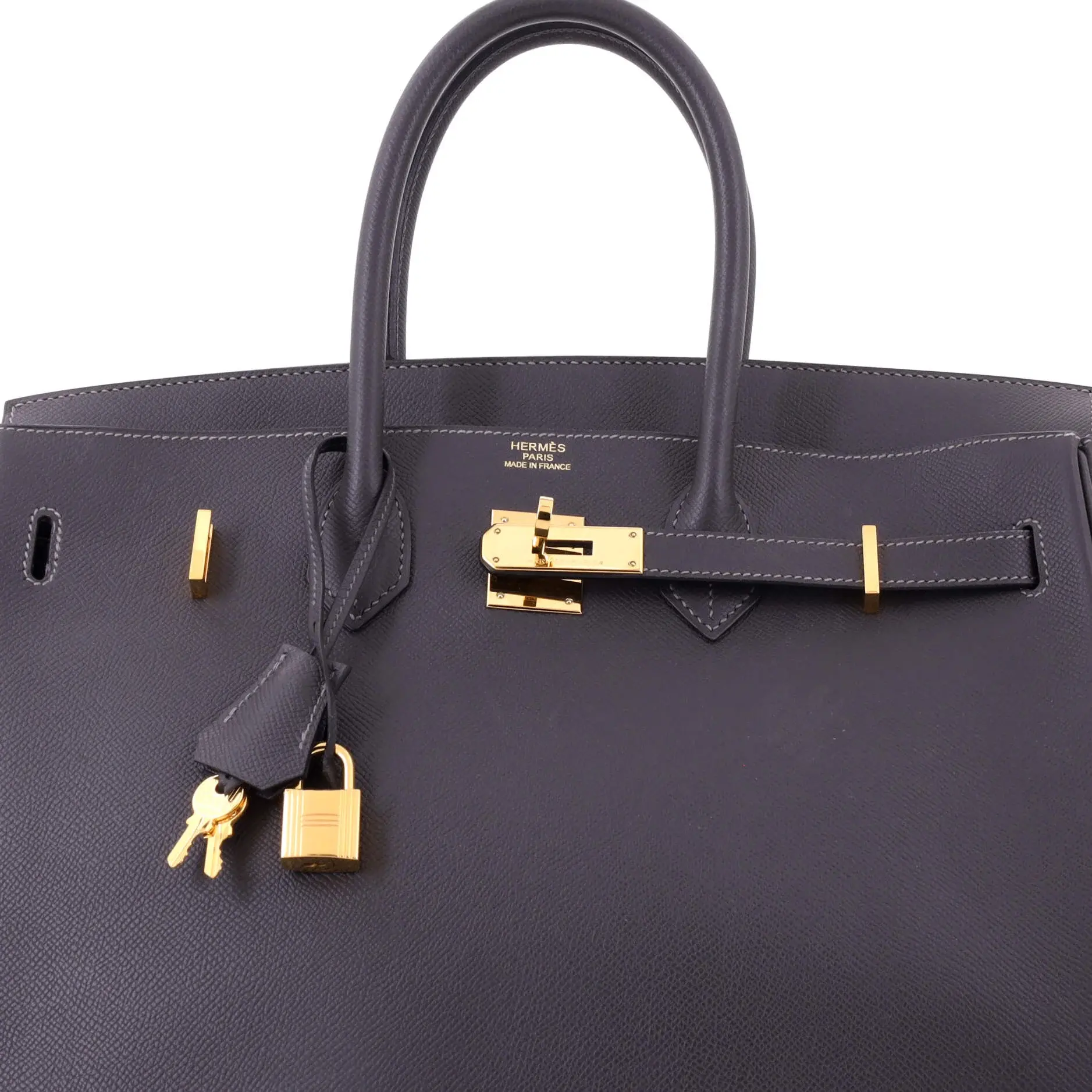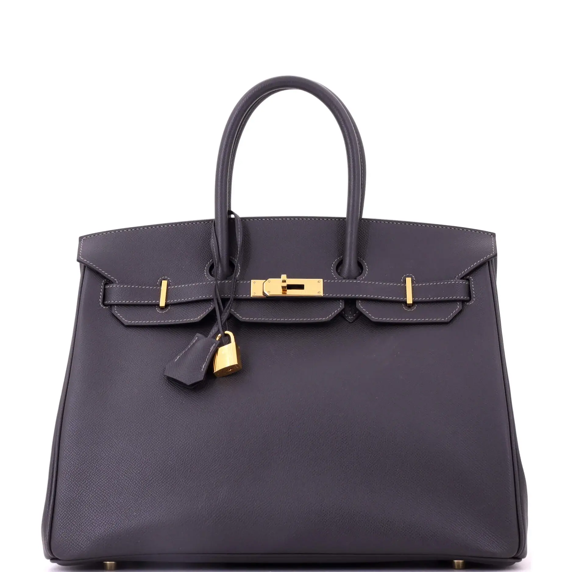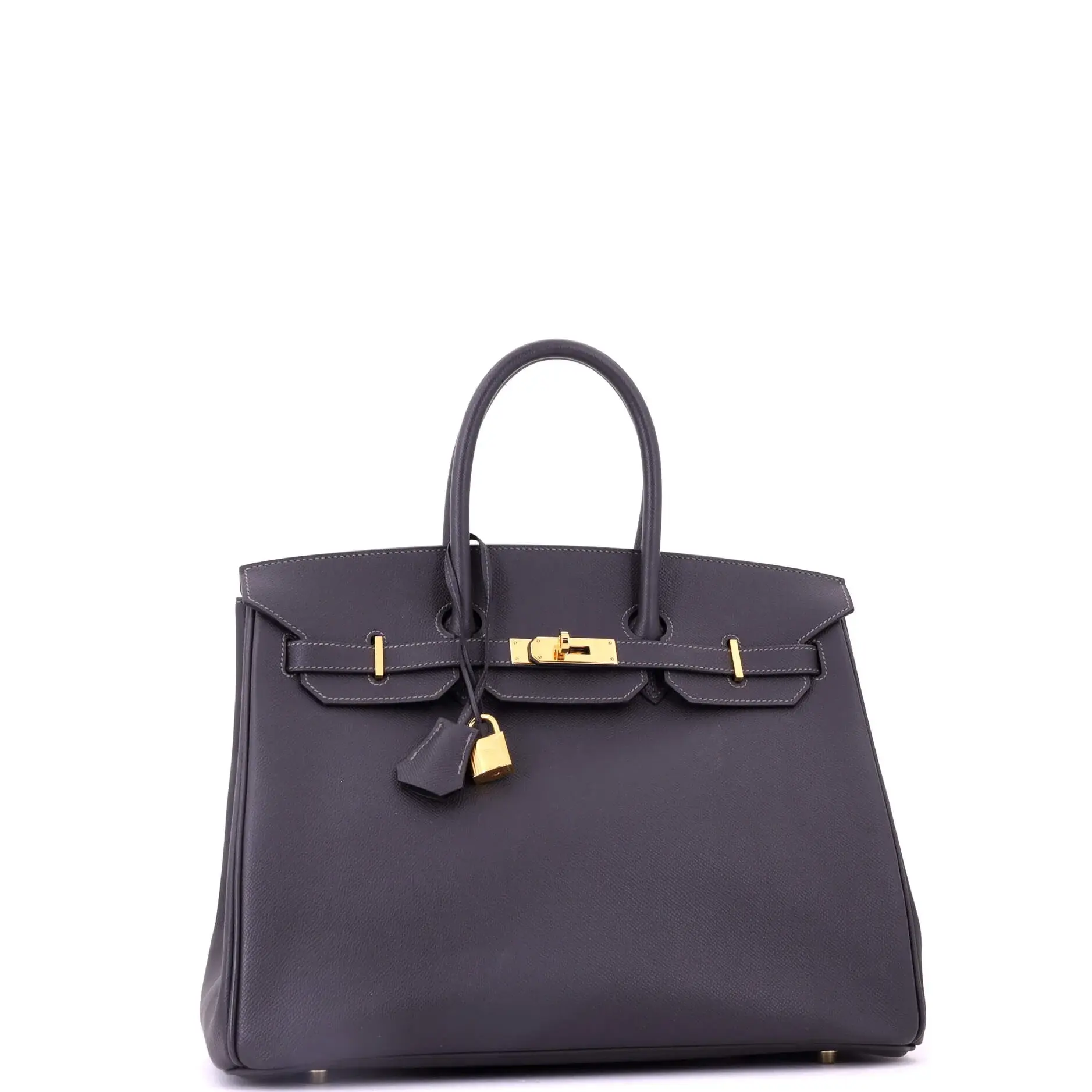 These are professional pictures of the actual item offered by Rebag. Condition: Great. Exterior: minor creases, minor scuffs | Handles/Straps: minor discoloration | Interior: minor scuffs | Hardware: minor scratches, minor tarnished Accessories: Keys, Dust Bag, Clochette, Lock Measurements: Height 10", Width 13.5", Depth 7" Designer: Hermes Model: Birkin Handbag Grey Epsom with Gold Hardware 35 Exterior Material: Leather Hermes Color: Graphite (Gray) Interior Material: Leather Hardware Color: Gold Brand Code: M Square (2009) Item Number: 418246/3