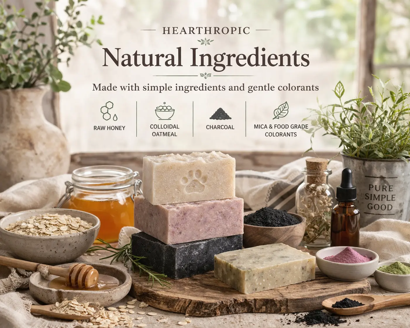 Ingredients include: triple butter soap base, colloidal oatmeal, raw honey, coconut oil, fragrance (optional), colorant.