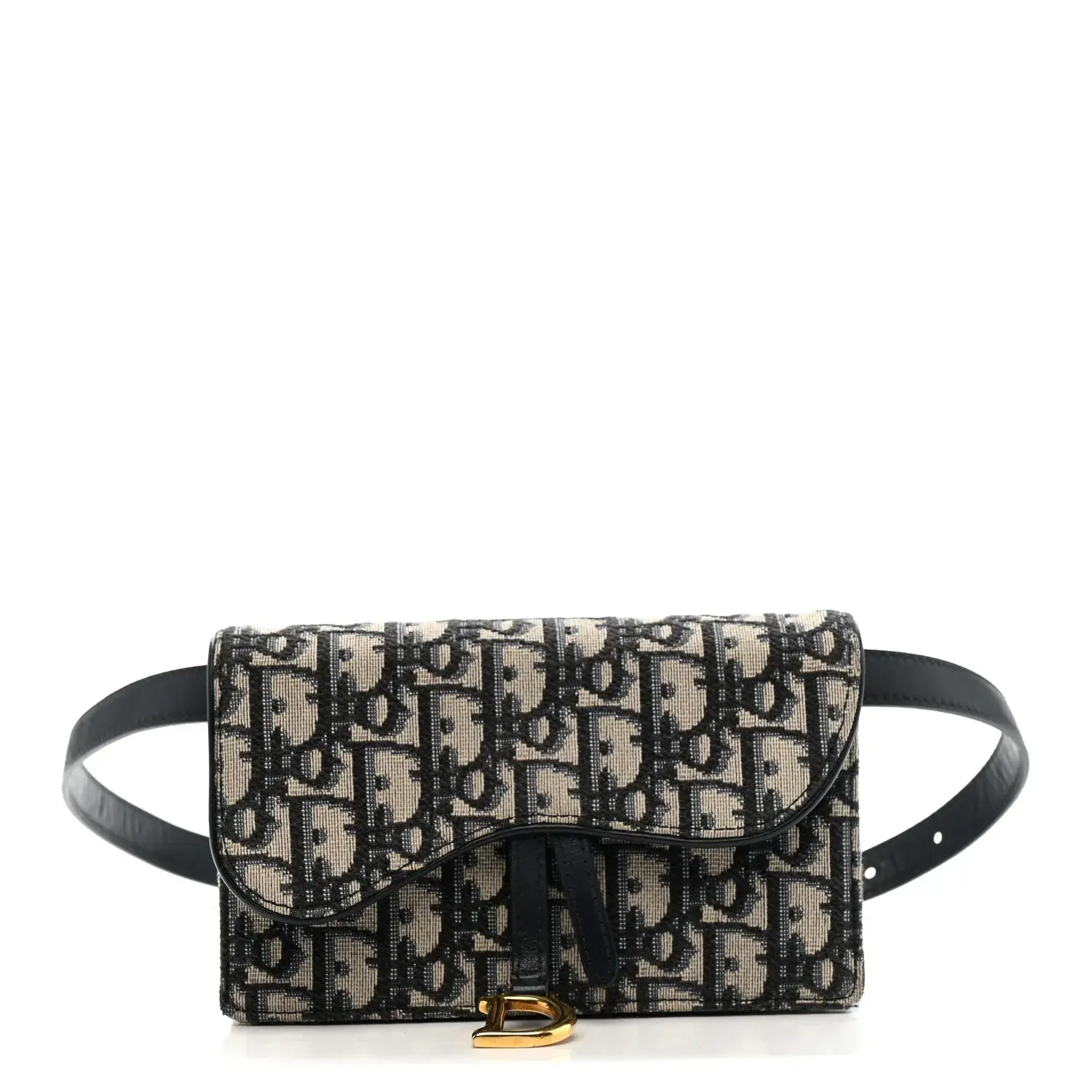 This is an authentic CHRISTIAN DIOR Oblique Saddle Belt Bag in Blue. This saddle bag is made of navy on beige Dior monogram canvas. The bag features blue cowhide leather trim including a leather belt strap and brass hardware. The flap opens to a matching leather interior with two card slots and a zipper pocket.