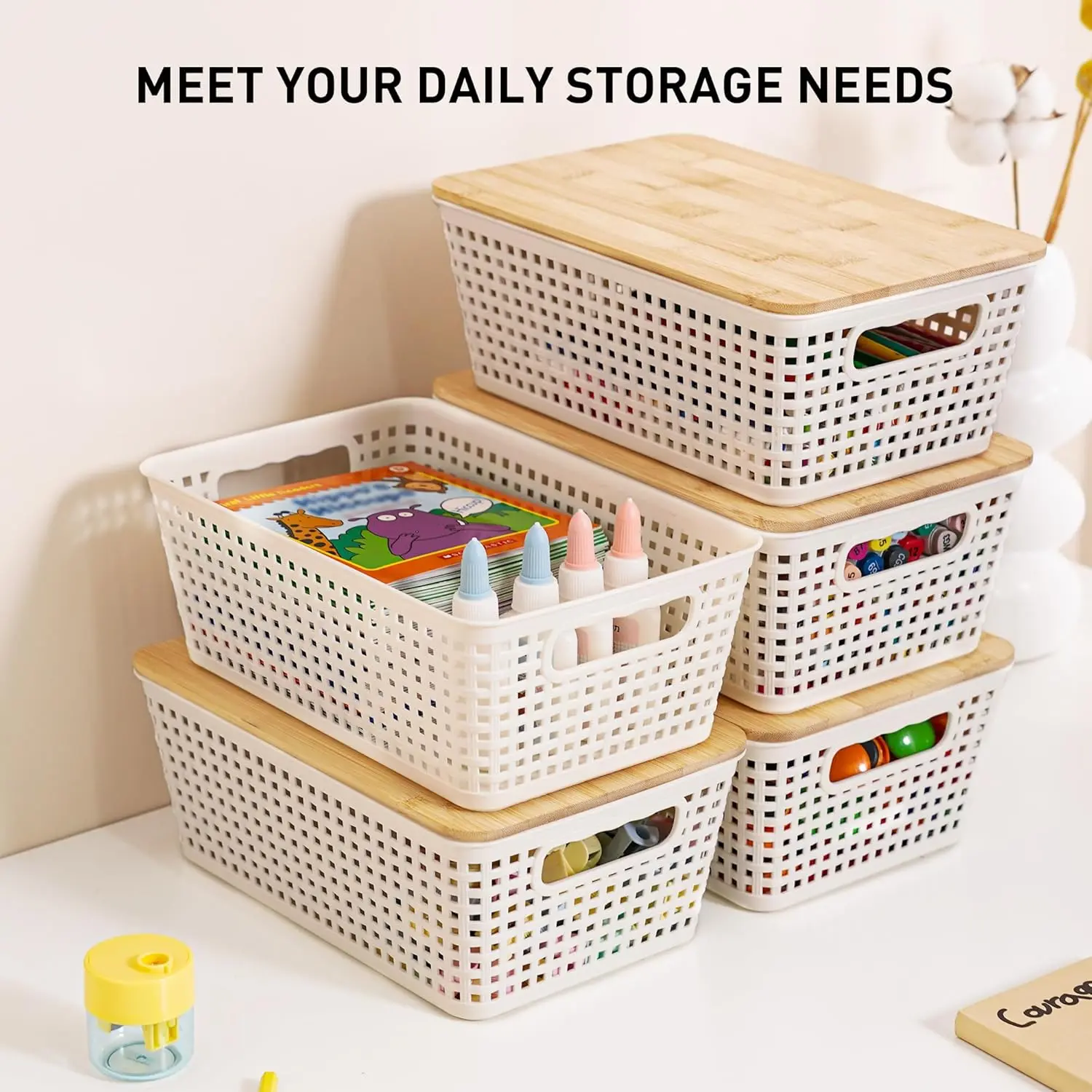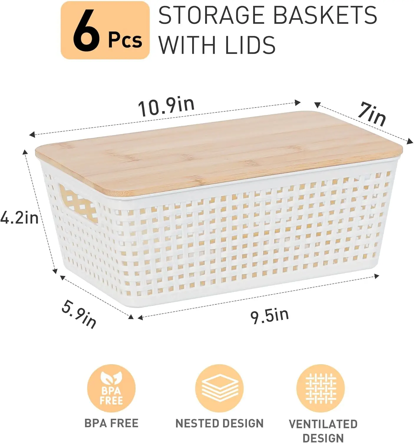 These plastic storage baskets are perfect for pantry organization. Each pack includes 6 bins with bamboo lids, ideal for shelves, drawers, desktops, closets, playrooms, offices, and homes. The white color complements any setting. Keep your space tidy and clutter-free.