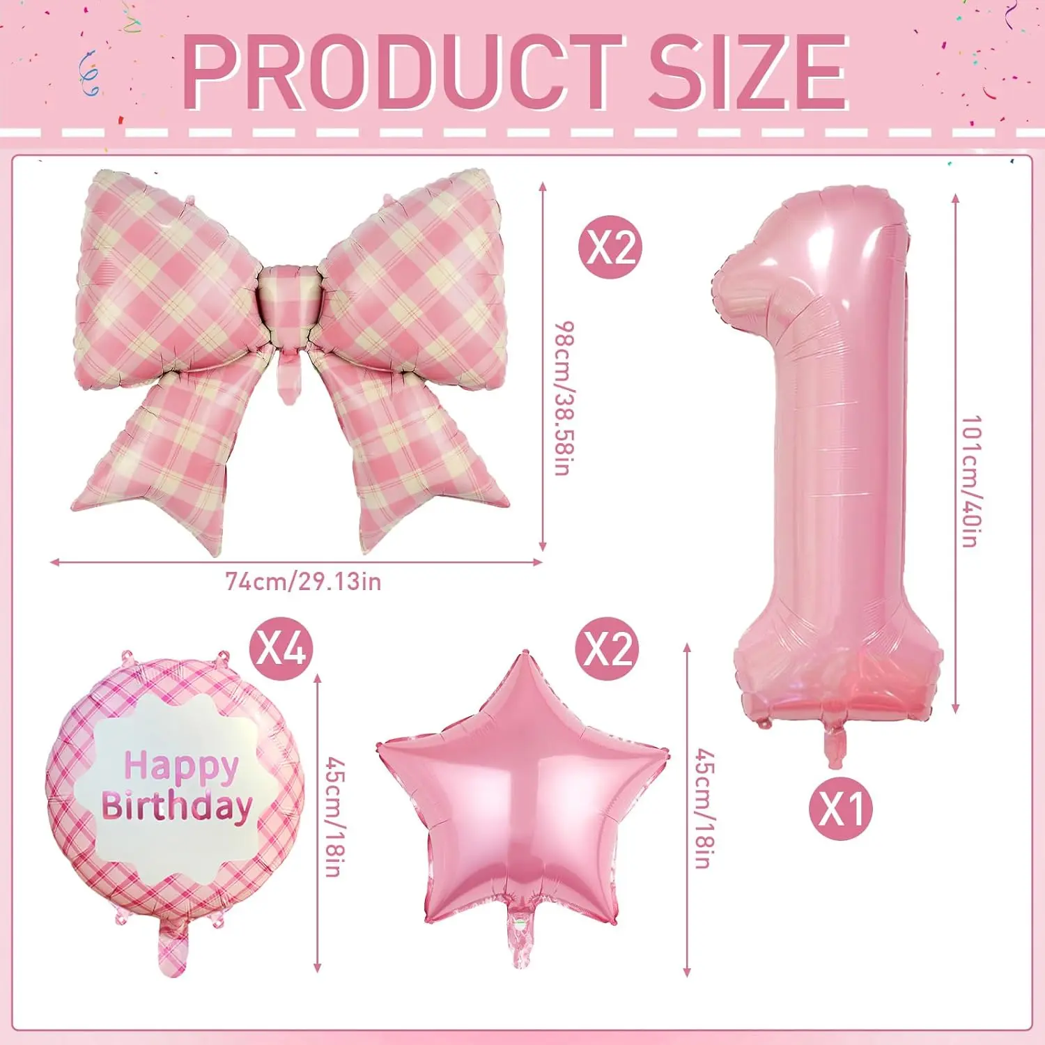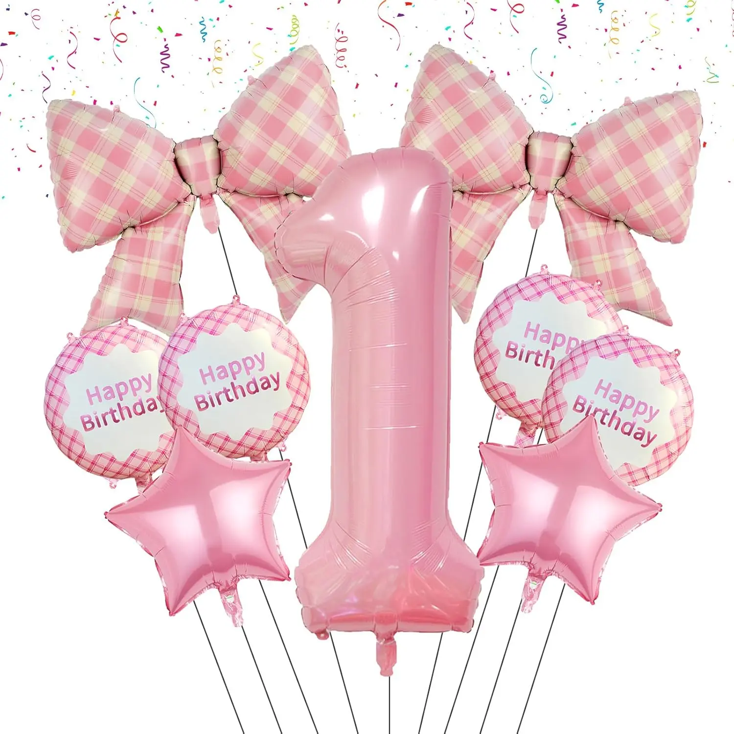 9 PCS Pink Plaid Bow Balloons & Number Foil Set for 1st Birthday Party Decorations & Supplies