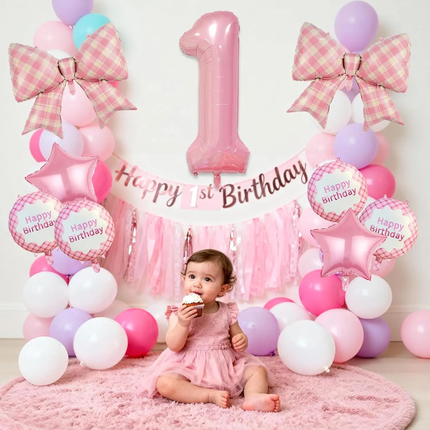 Add charm with 9 pink plaid bow balloons and number foil balloons perfect for a 1st birthday celebration.