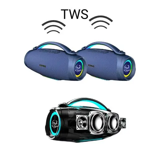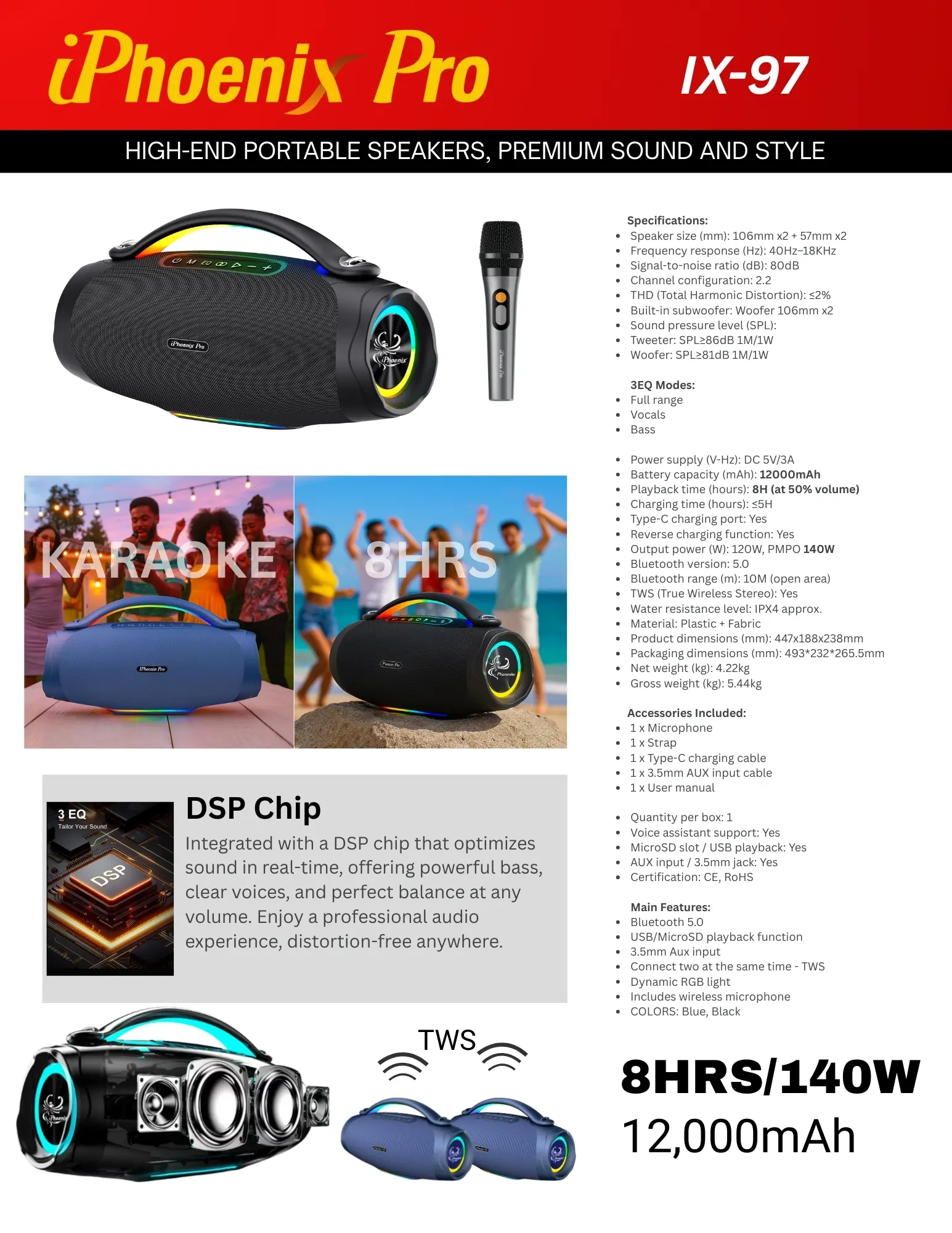 - Bluetooth Version: 5.0 - Output Power: 120W, PMPO 140W - Battery Capacity: 12000mAh (11.1V 4000mAh x3) - Loudspeaker: 5.31" x2 + 2.85" x2 - Frequency Response: 40Hz-18KHz - Power Input: Type-C 5V/3A - Charging Time: ≤5H - Play Time: 8H (50% volume) - TWS Distance: 8M (open area) - Wireless Range: 10M (open area) - Product Size: 447x188x238mm / 17.6x7.4x9.37 inches - Product Weight: 4220g / 10 pound - Mic Wireless Range: ≥10m (open area) - Mic Battery Capacity: 500mAh - Mic Charging Time: ≤4H - Mic Working Time: Approx.20H - Mic Weight: 150g