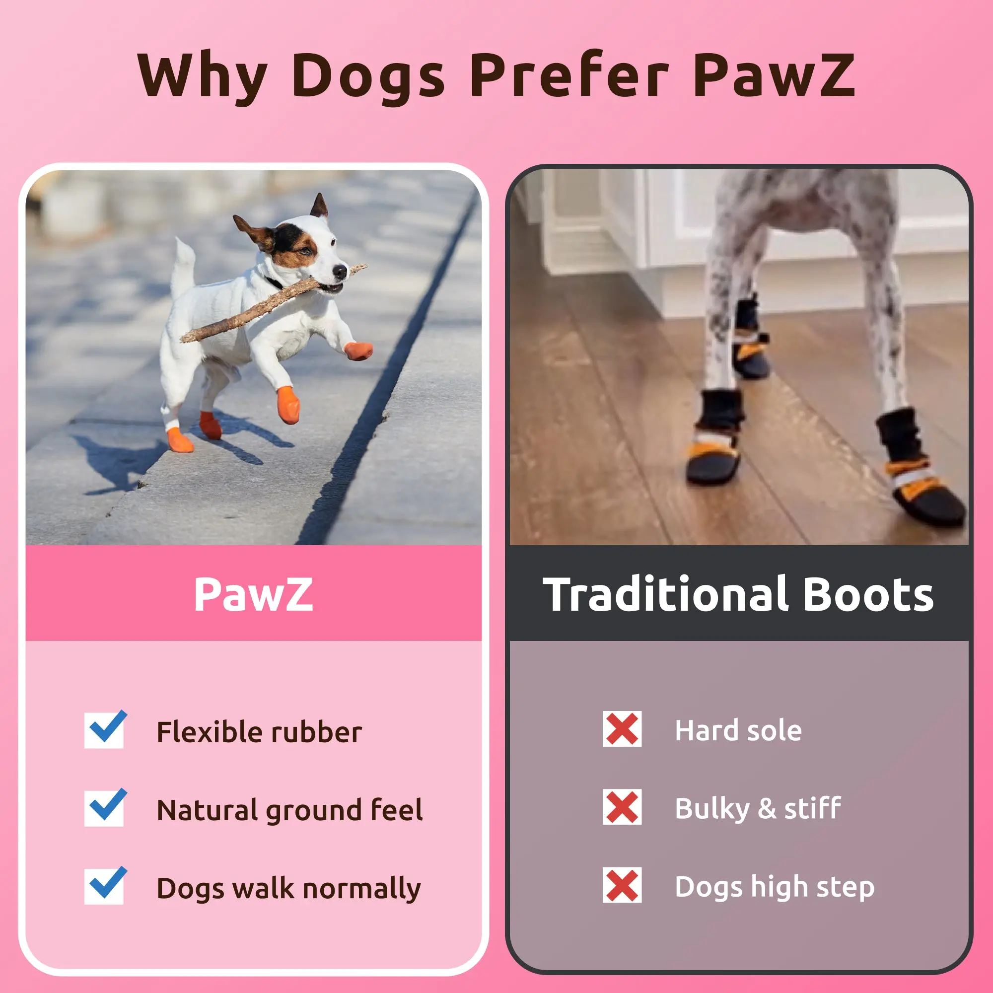 PawZ Rubber Dog Boots offer durable, flexible protection against hot pavement, snow, ice, and harmful chemicals. Designed to let your dog's paws feel the ground naturally, they provide secure footing on any terrain.