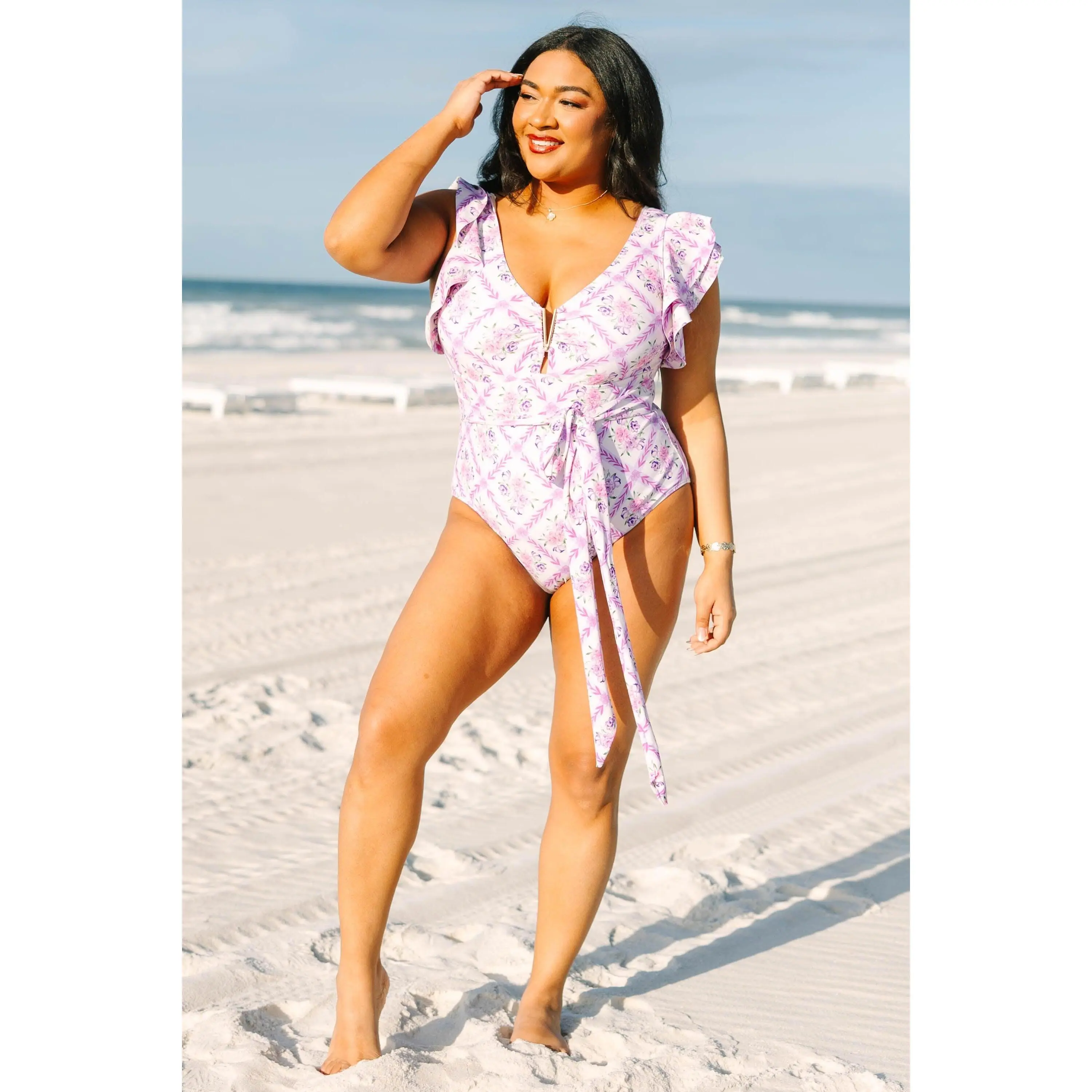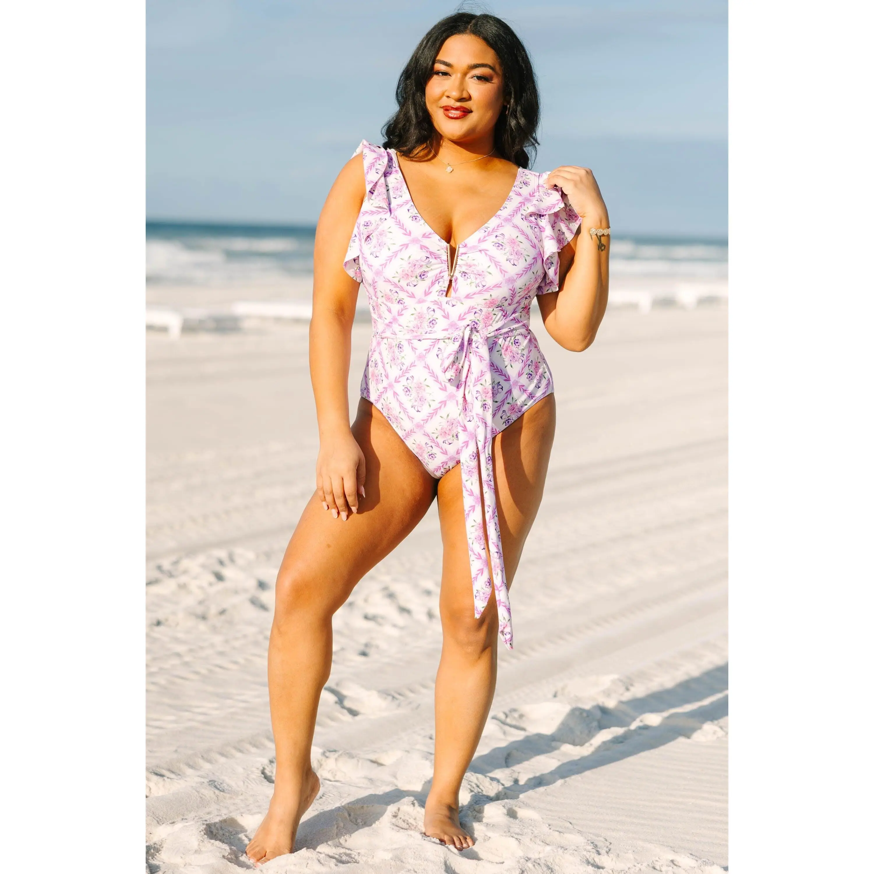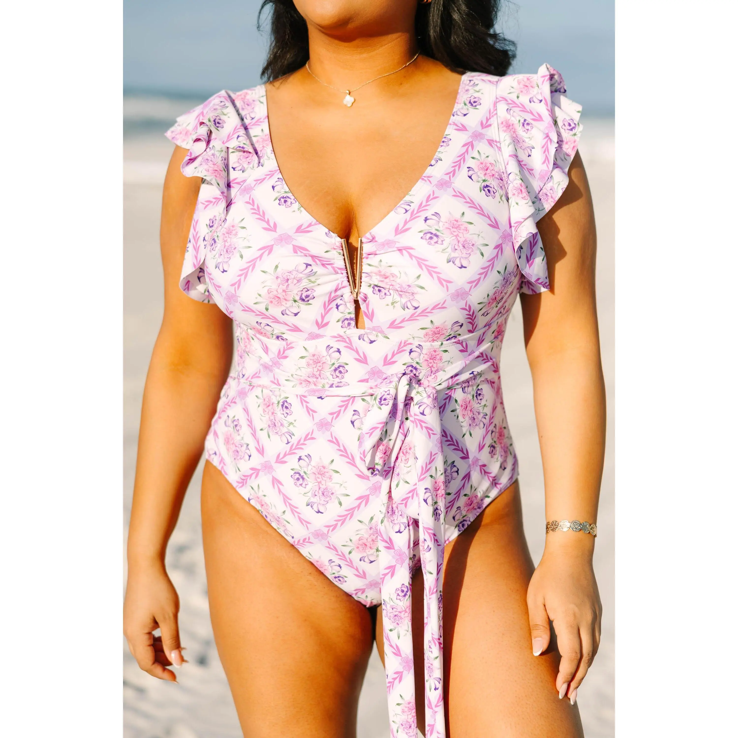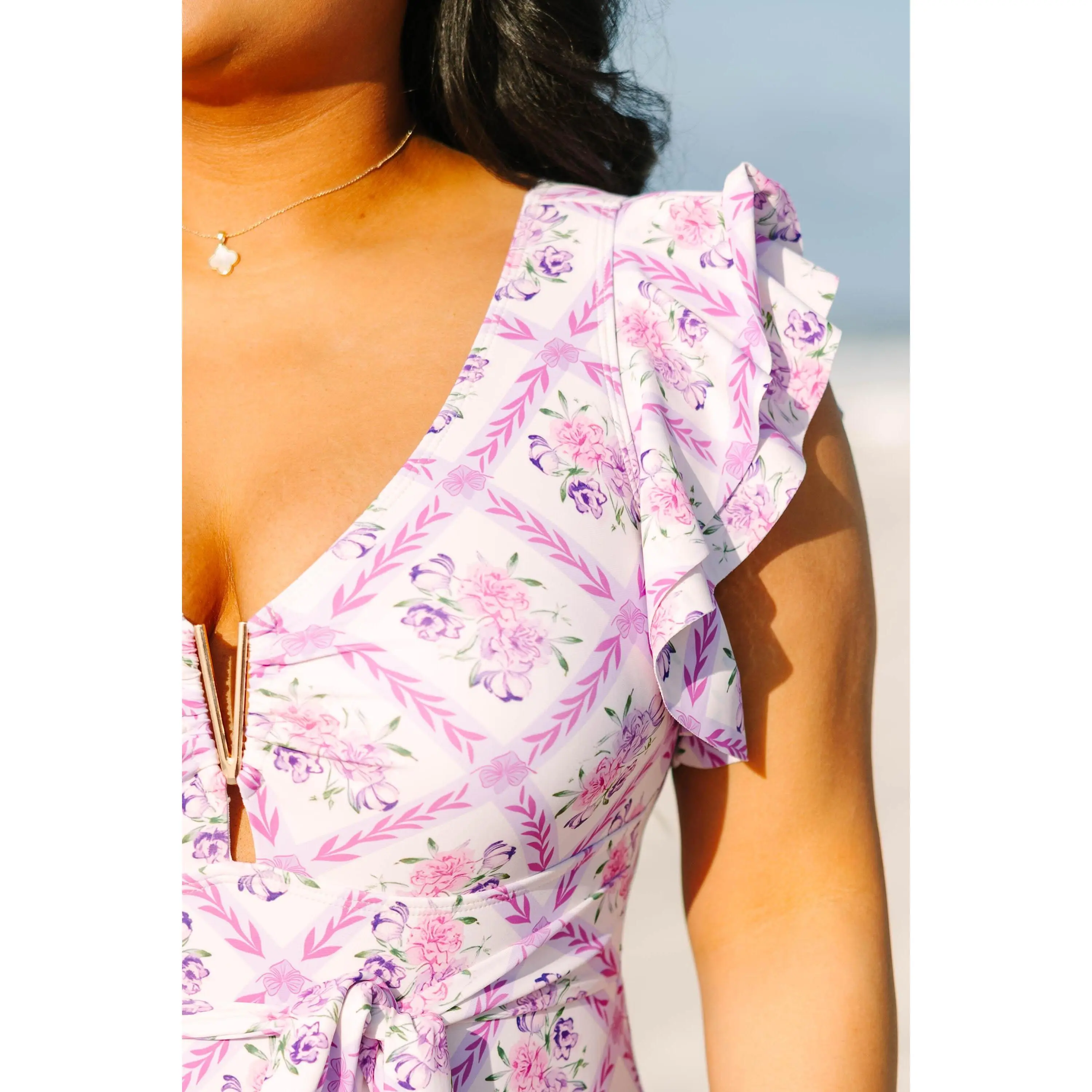 Get ready to make a splash in our Beach Beauty Swimsuit! Featuring a stunning purple floral pattern and eye-catching flutter sleeves, this swimsuit is both stylish and comfortable! The removable sash and gold hardware detail on the bust add an extra touch of glam! Perfect for lounging by the water or making a statement at the beach!82% Polyamide, 18% Elastane Actual product colors may vary from images shown due to different viewing devices and lighting.