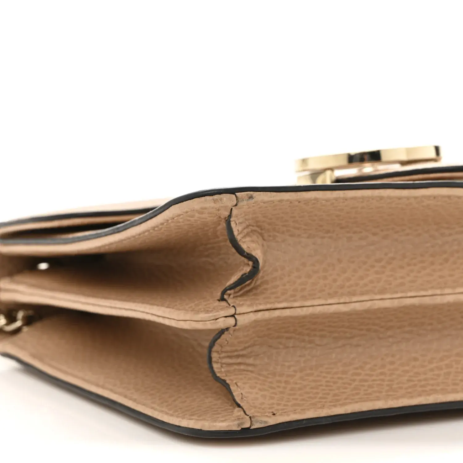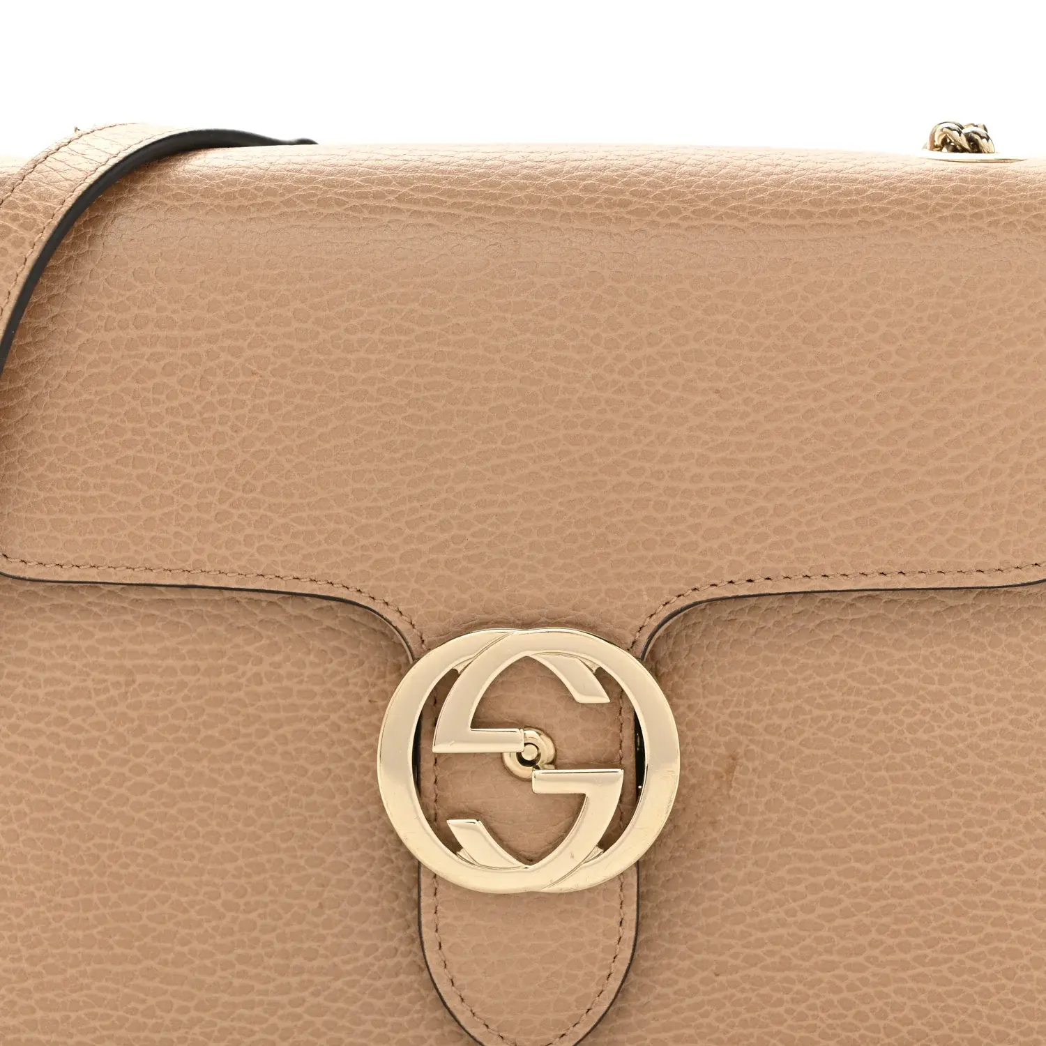 This is an authentic GUCCI Dollar Calfskin Small Interlocking G Shoulder Bag in Camelia. This chic shoulder bag is crafted of grained calfskin leather in beige. The bag features a gold chain strap with a leather shoulder pad and a facing flap with a polished light gold interlocking GG flip lock. The flap opens to a partitioned beige fabric interior with patch pocket.