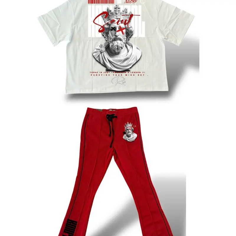 Kings Only Kontrol Khaos Joggers - Red Sweatpants with Black Piping and White T-Shirt with Crown Design