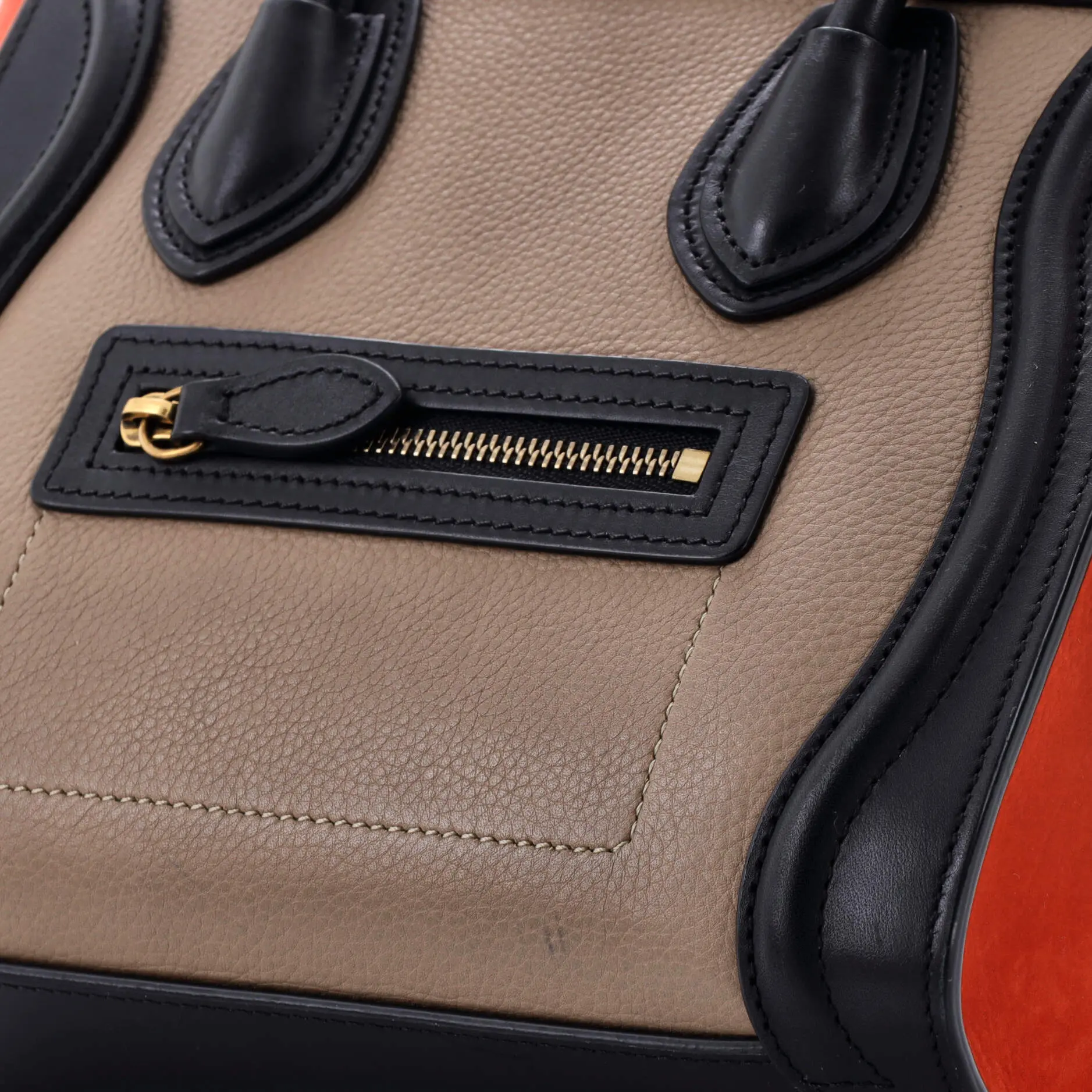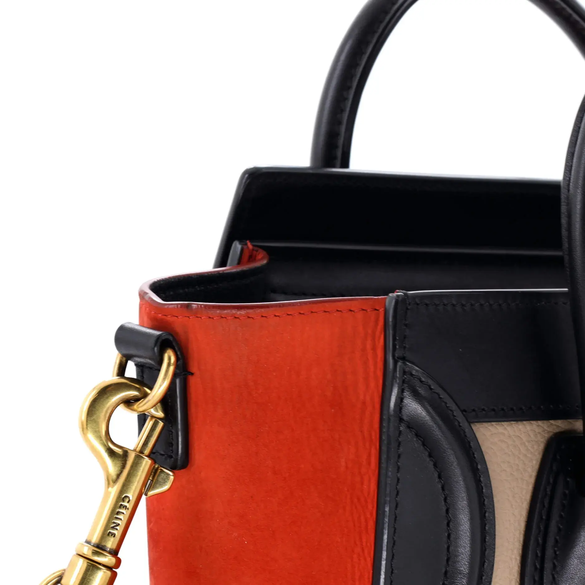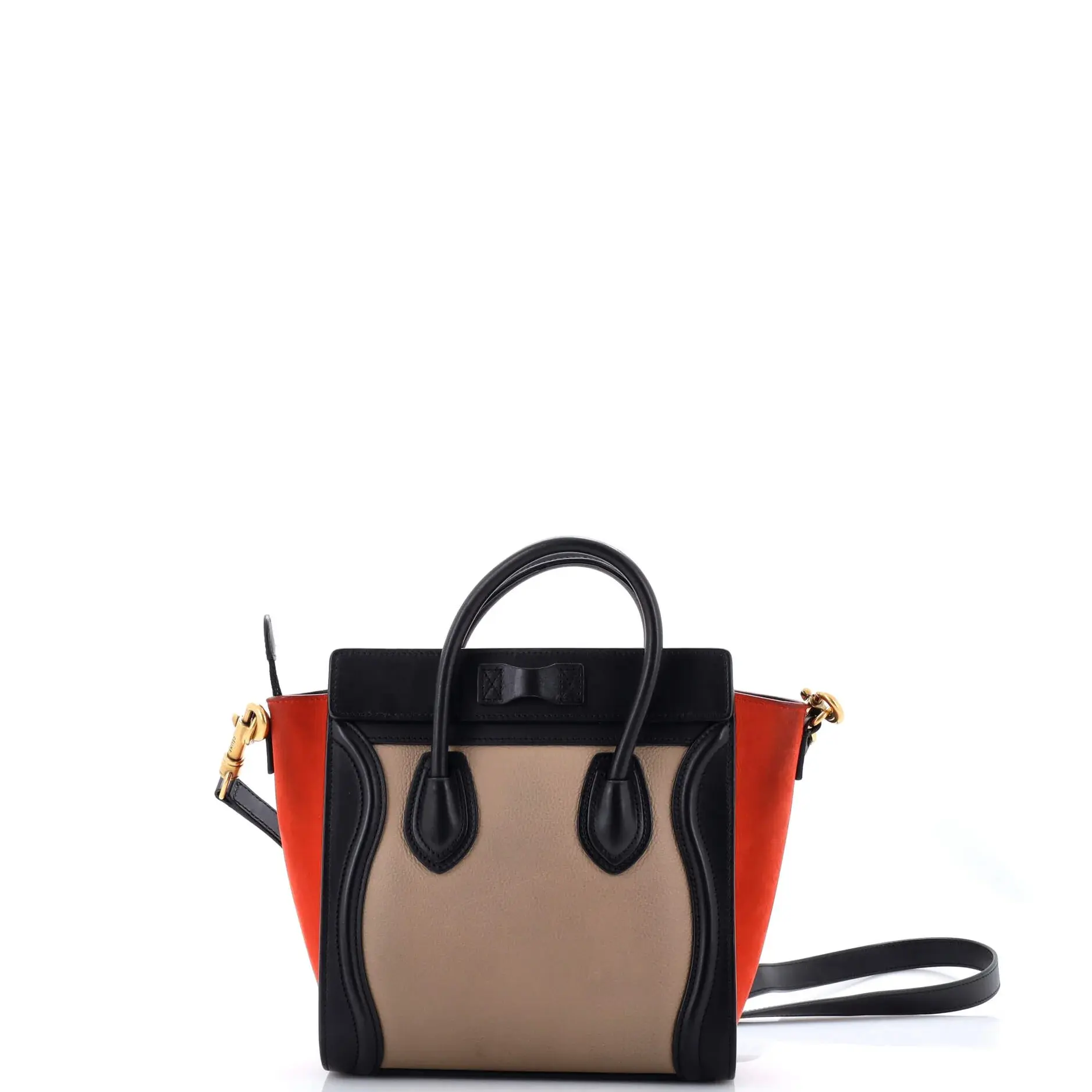 These are professional pictures of the actual item offered by Rebag. Estimated Retail Price: $2,900 Condition: Good. Exterior: heavy corner wear, scuffs, edge wear, minor creases, minor discoloration | Handles/Straps: scuffs, discoloration, minor creases, minor cracking | Interior: scuffs, discoloration, perfume odor | Hardware: scratches, minor tarnished Accessories: With Strap Measurements: Handle Drop 3", Height 8", Width 8", Depth 4", Strap Drop 22" Designer: Celine Model: Tricolor Luggage Bag Leather Nano Exterior Material: Leather Exterior Color: Black, Multicolor, Neutral, Orange Interior Material: Leather Interior Color: Black Hardware Color: Gold Item Number: 401690/6