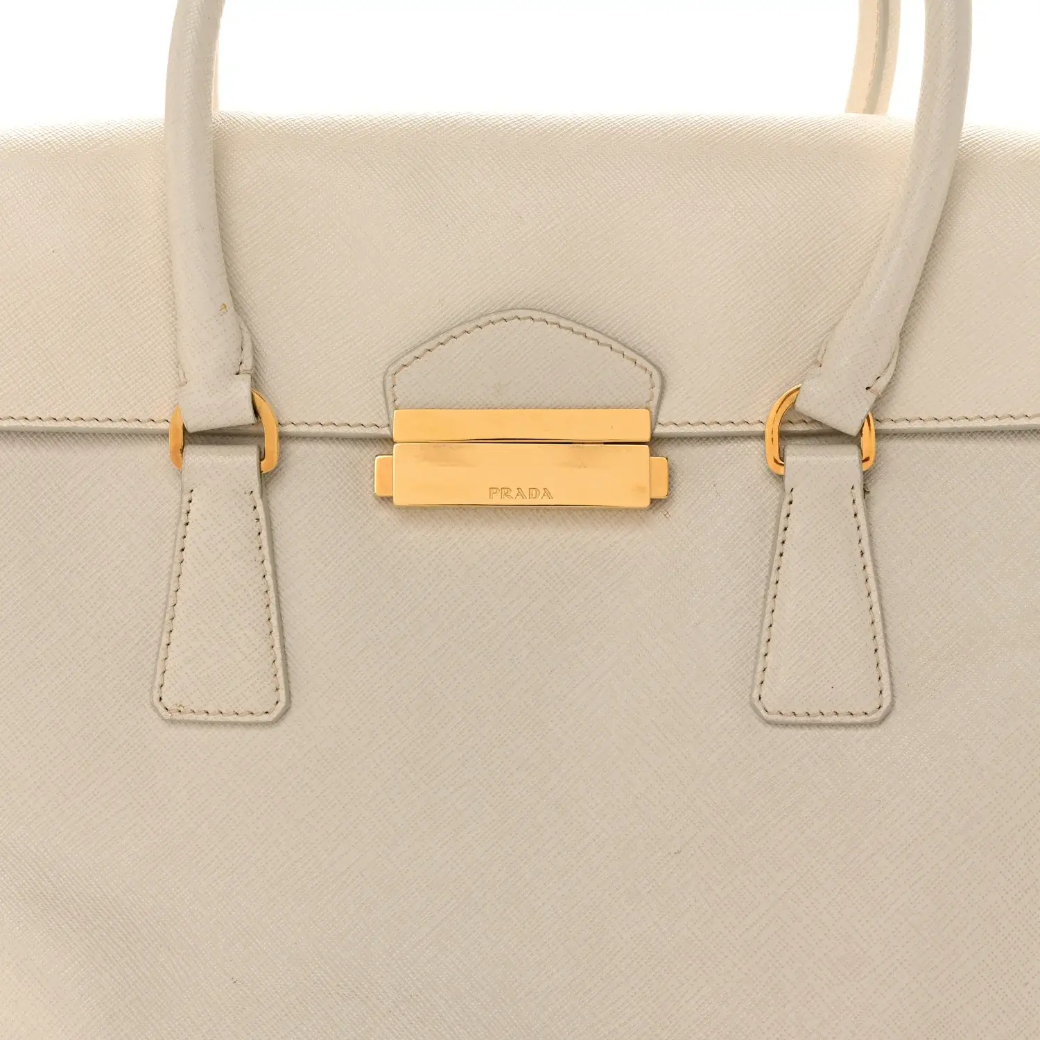 This is an authentic PRADA Saffiano Lux Pattina Tote in Talco. This stylish tote is crafted of luxurious Prada signature Saffiano cross-grain leather in white. The bag features rolled leather top handles with brass links and a short cross-over flap with a brass press lock closure. This opens to a partitioned light pink leather interior with a central zipper compartment, zipper and patch pockets.