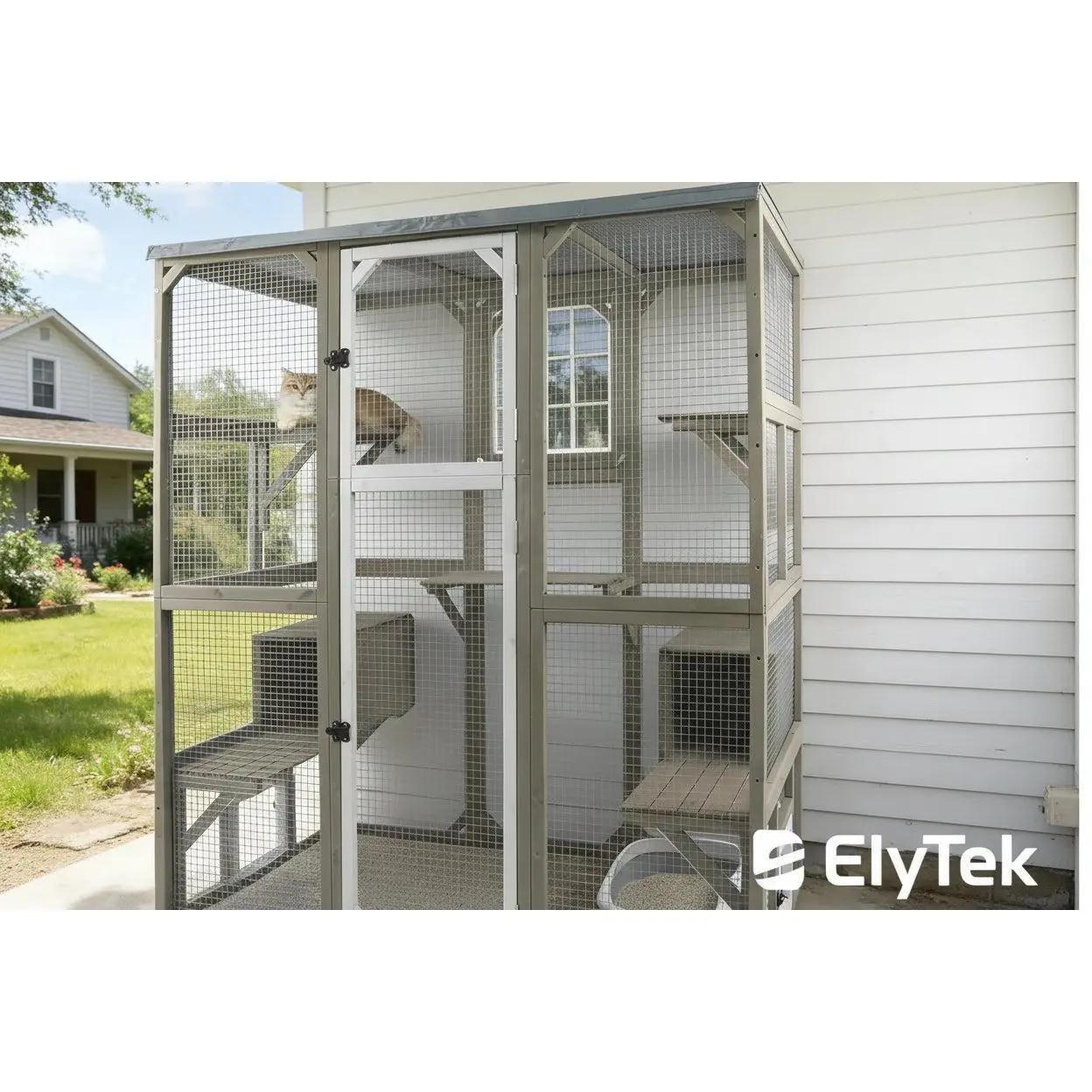 ·【Lugar ideal para mascotas domésticas】Con dos tumbonas, siete plataformas para saltar y dos puertas con cerradura, este recinto exterior ofrece mucho espacio para trepar y dar rienda suelta a su naturaleza.