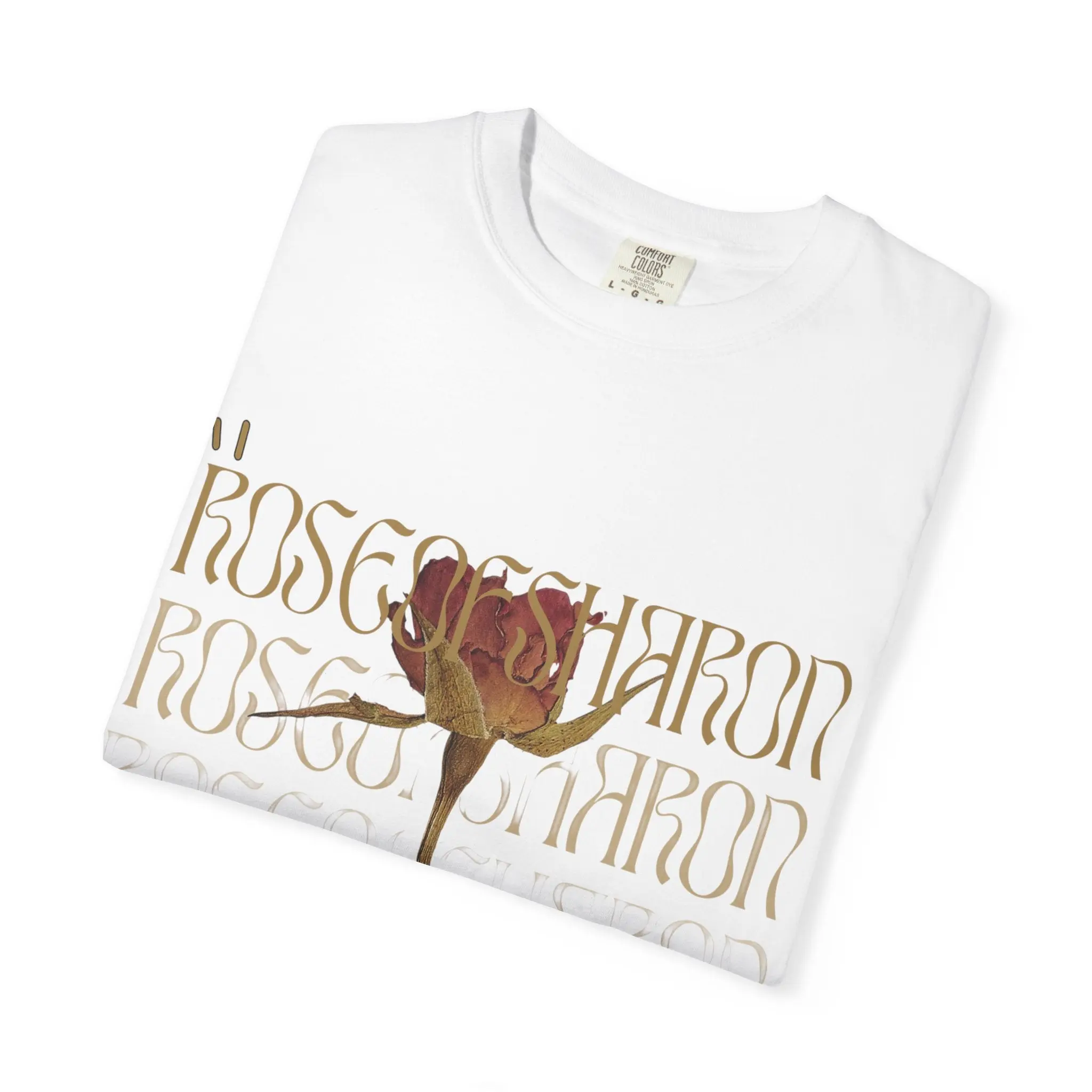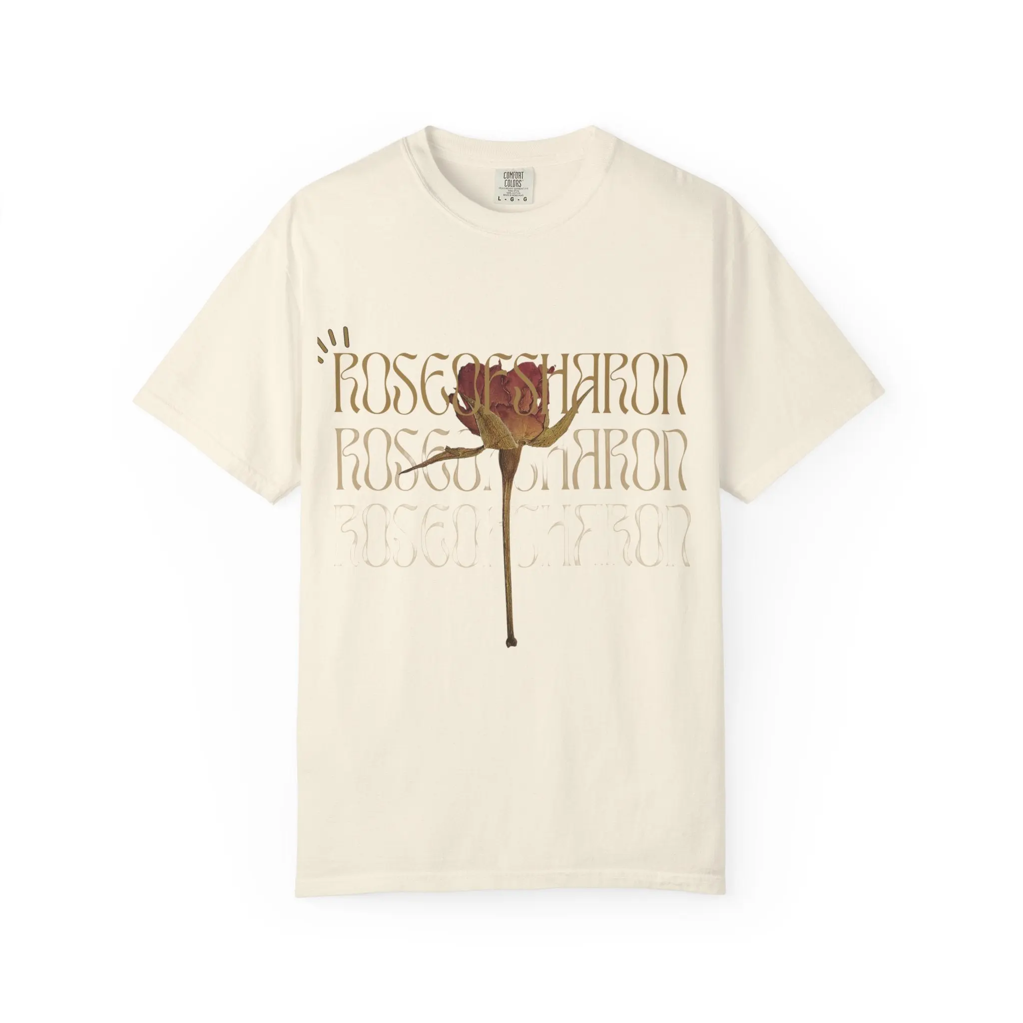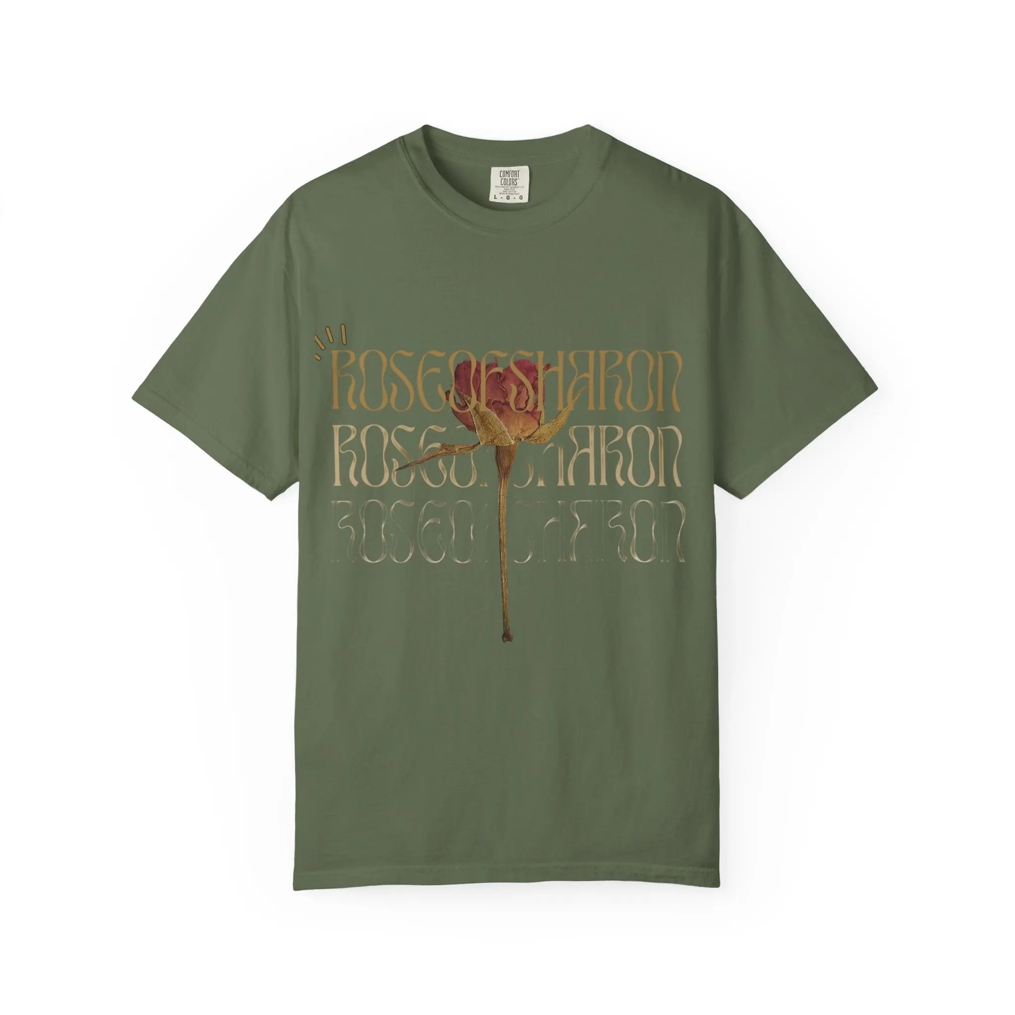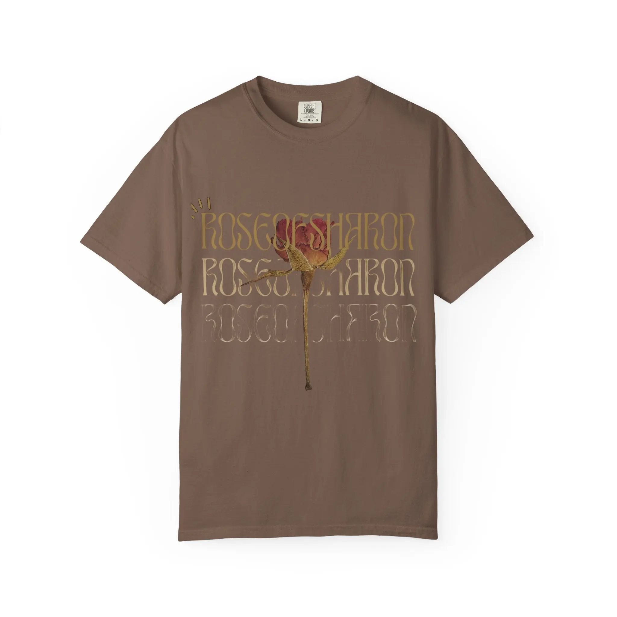 This relaxed-fit garment-dyed tee carries a quiet, vintage mood. A single faded rose blooms at the center, layered over repeating, whisper-thin type that feels like a memory written and rewritten. The heavyweight cotton has a soft, lived-in hand from the post-construction dyeing process, so the shirt drapes gently and shows subtle color variation that deepens with wear. Wear it with worn denim, a knit cardigan, or under a lightweight jacket — it grounds outfits with an earthy, nostalgic edge and moves easily between slow weekend walks, small gallery visits, and evenings around a low-lit table.