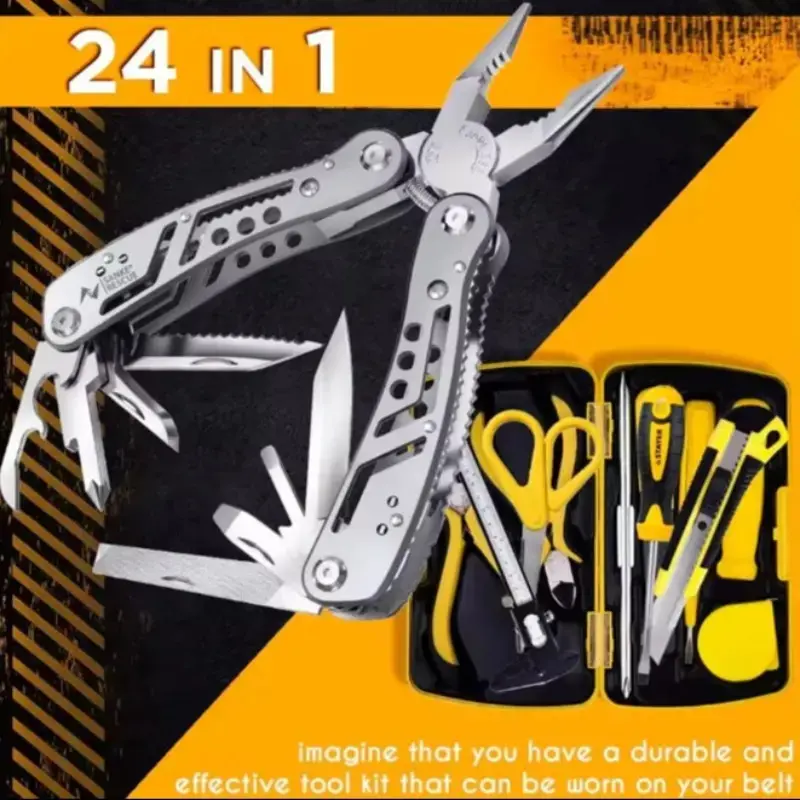 ·Lightweight multi-tool: 24 functions—pliers, electrician’s tools, wire cutters and cable strippers, folding knife, can opener and bottle opener, metal file, 11 drill bits with magnetic connectors, scraper, and cone. It’s a truly multifunctional tool.