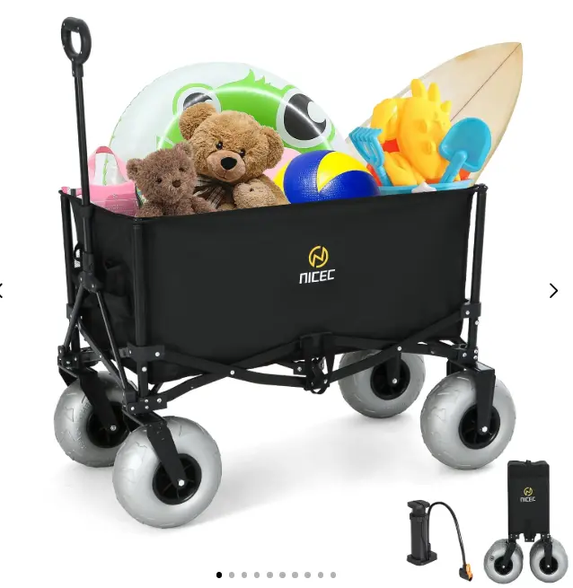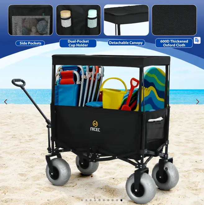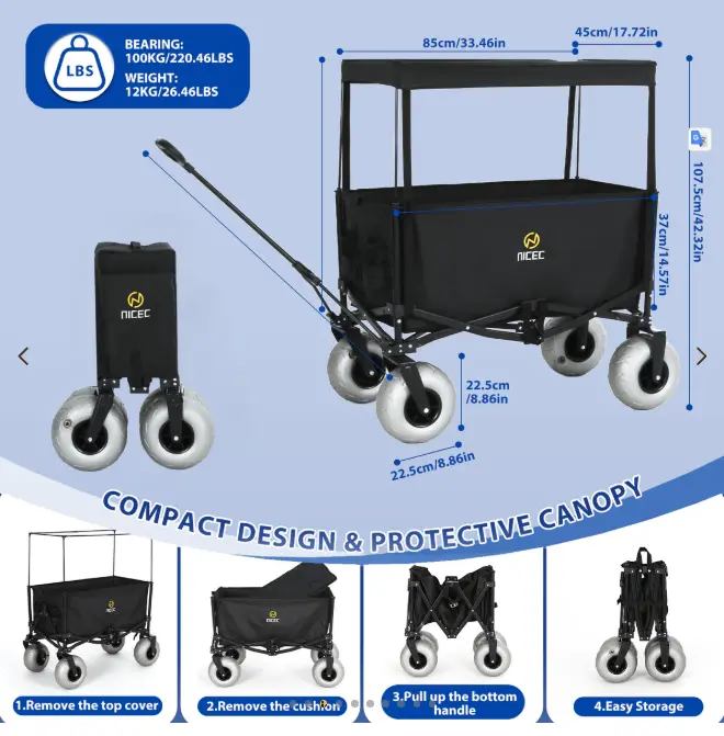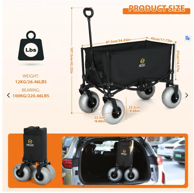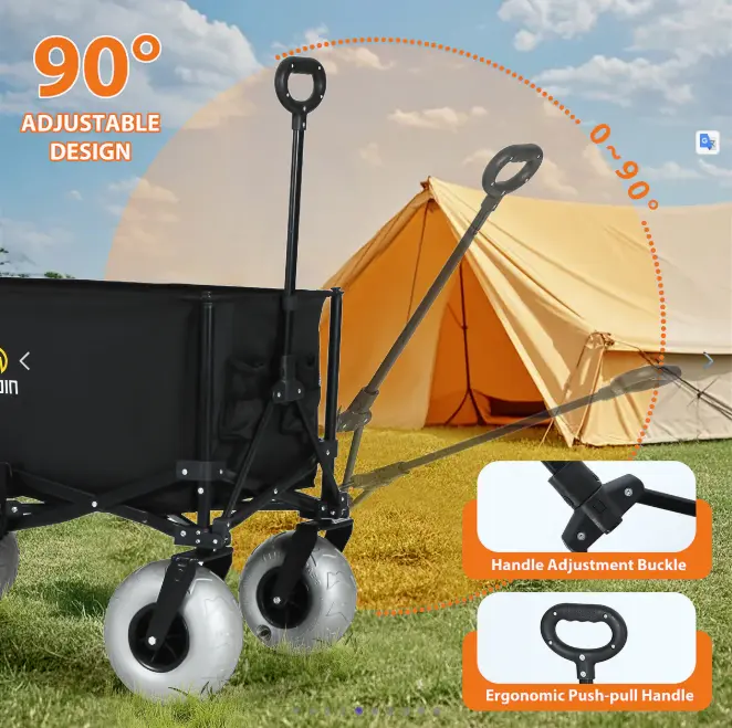 Beach Cart with Balloon Wheels, Heavy-Duty Folding Wagon for Sand, Adjustable Handle, Collapsible Utility Cart, 220 lbs Capacity