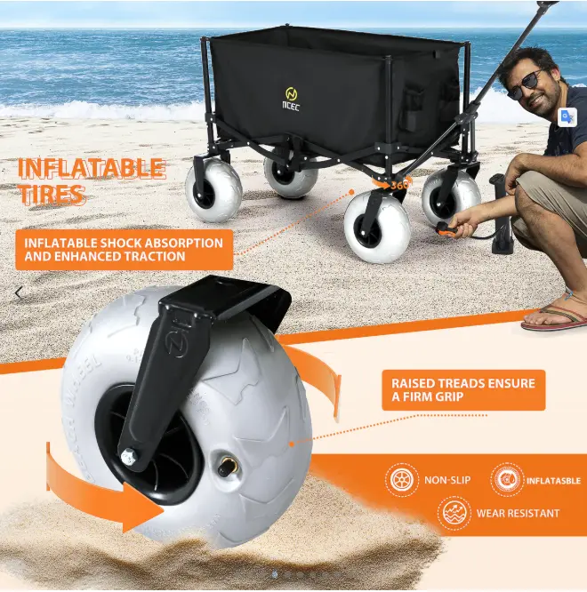 9” Balloon Wheels for Sand – Extra-wide wheels glide smoothly over soft sand, grass, or gravel without sinking.