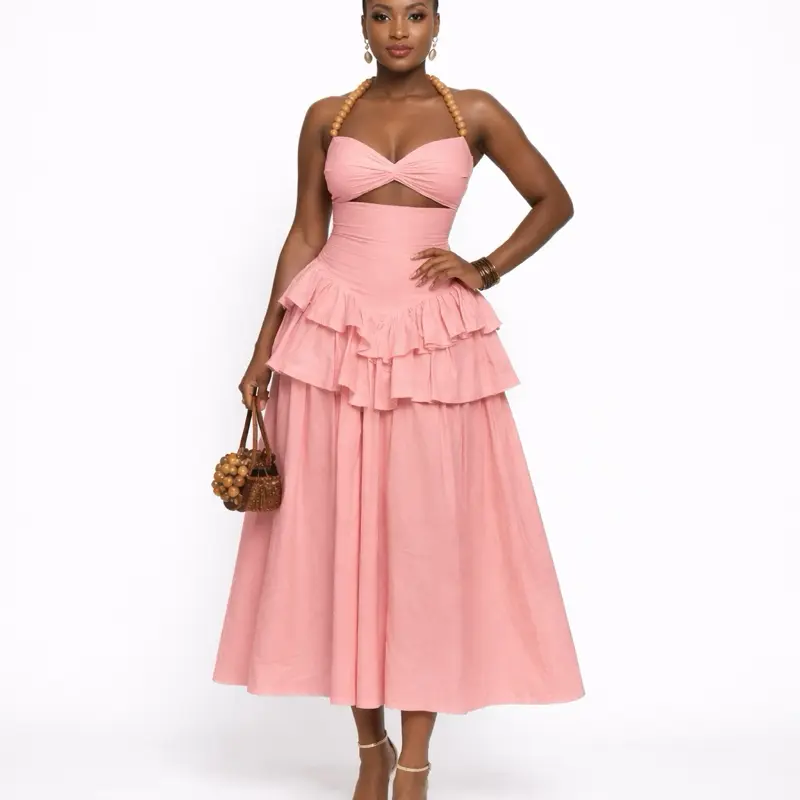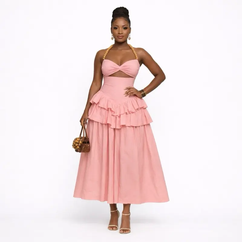 Meet the dress that makes every entrance unforgettable. The Isla Ruffle Halter Dress is a statement midi-maxi silhouette designed with a flattering sweetheart halter neckline, elevated by its signature wood-beaded straps that add a chic resort-luxe touch.
