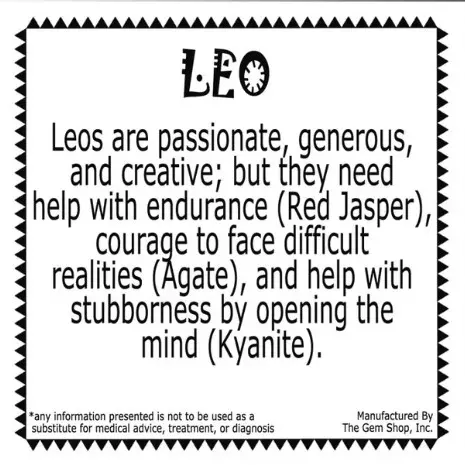 The card states: "Leos are passionate, generous, and creative; but they need help with endurance (Red Jasper), courage to face difficult realities (Agate), and help with stubborness by opening the mind (Kyanite)."