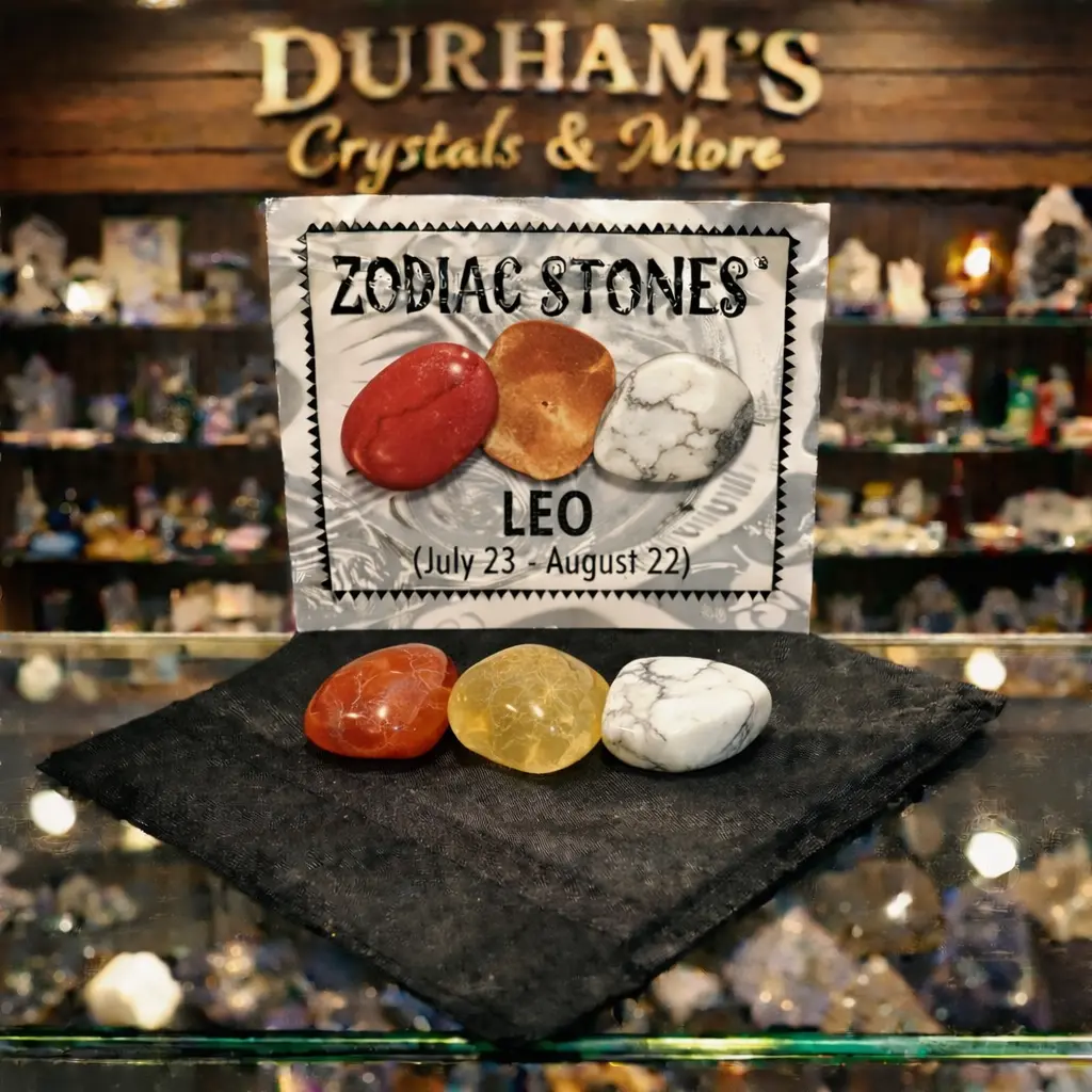 Contains a black pouch with 3 stones and a description card specifically designed for Leo. The three stones for Leo are Red Jasper, Agate, and Kyanite. Leo birthdates are July 23 - August 22.