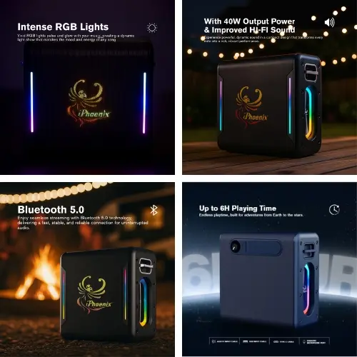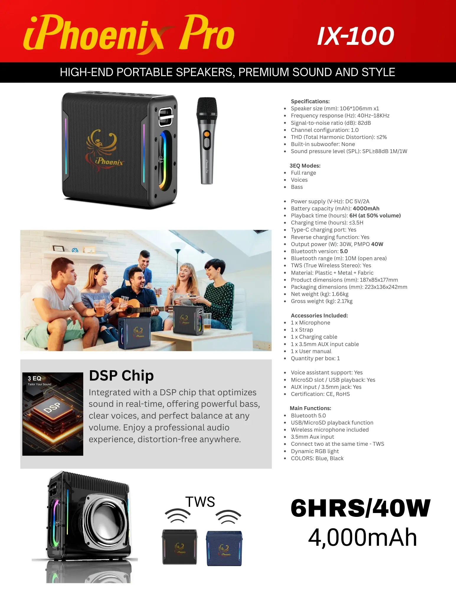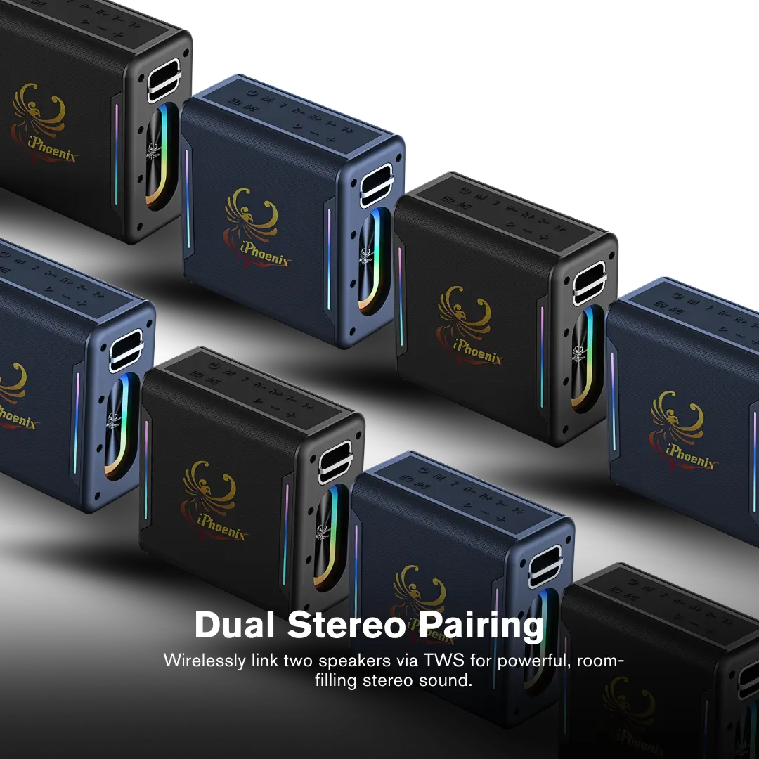 Experience bold, room-filling sound with deep, thumping bass. The IPhoenix IX-100’s 40W rated power delivers immersive audio perfect for parties, outdoor events, or everyday listening.